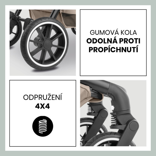 Díky gumovým kolům do každého terénu jste vybaveni na všechny cesty. Odpružení 4 x 4 jemně pohupuje vaše děťátko, zatímco prodlužovací XL sluneční stříška (UV 50+) chrání vaše děťátko za každého počasí a síťovaná okénka zajišťují čerstvý vzduch. Sedátko kočárku má výškově nastavitelné 5-bodové bezpečnostní pásy a dobře polstrovanou, extra vysokou opěrku zad. Opěrka nohou roste s vaším dítětem.