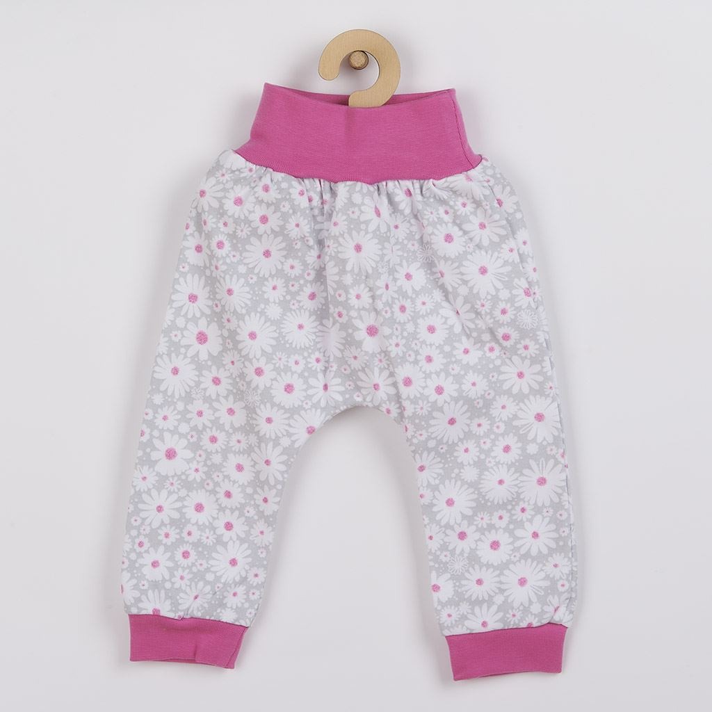 2-dílná soupravička české značky New Baby Happy Flower pro miminka. Obsahuje tričko a tepláčky. Tričko zdobí nápis Happy flower a šmrncovní volánkové rukávky. Zapínání na cvoček u krčku na zadní straně. Tepláčky mají širší lem, jsou zúžené na nohavičkách s lemem a jsou celopotištěné květinkami. Složení: 100% bavlna.