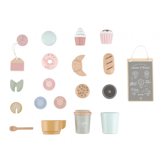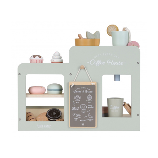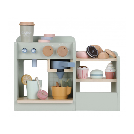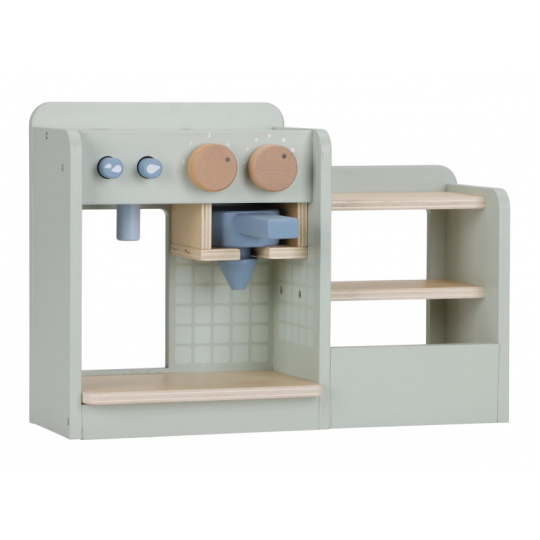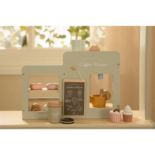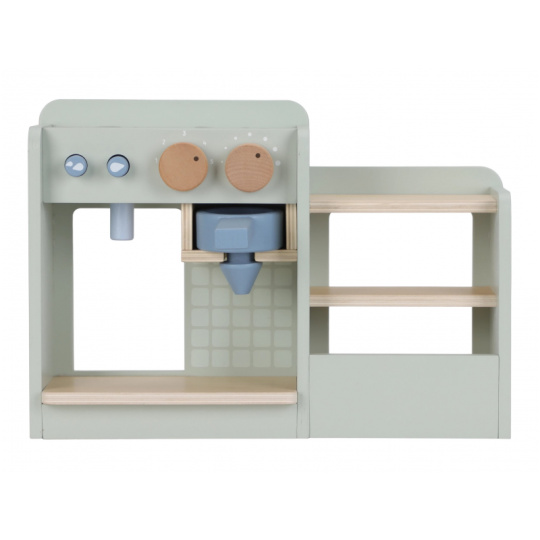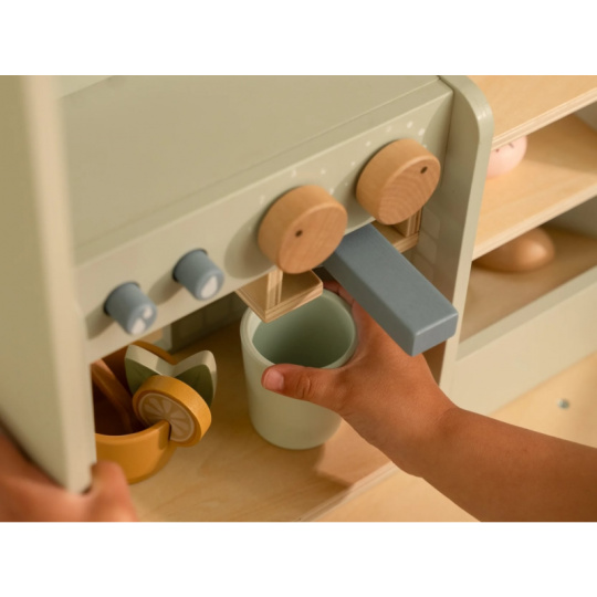 Vítejte v nejútulnějším kávovém koutku ve městě! Tento krásný dřevěný kávovar s bohatým příslušenstvím promění každé dětské hraní v nezapomenutelný zážitek. Malí baristé mohou mačkat tlačítka, volit nastavení a vkládat kapsle jako v opravdové kavárně – a připravit tak kávu nebo čaj přesně podle přání svých zákazníků. Součástí setu je kávovar, čajovar, úložný prostor na hrníčky a vitrína pro vystavení sladkostí a sendvičů. Děti mohou servírovat čaj s koláčkem nebo cappuccino s dortíkem a pozvat rodinu i kamarády do své vlastní kavárny. Hračka rozvíjí jemnou motoriku, kreativitu a komunikační dovednosti, a přitom poskytuje nekonečné možnosti zábavy v roli obsluhy. Hračka je součástí kolekce vysoce kvalitních dřevěných hraček Little Dutch, navržených s důrazem na bezpečnost a originální design. Vyrobeno z odolného FSC certifikovaného dřeva. Rozměry: 24 x 34,5 x 14 cm Vhodné pro děti od 3 let.