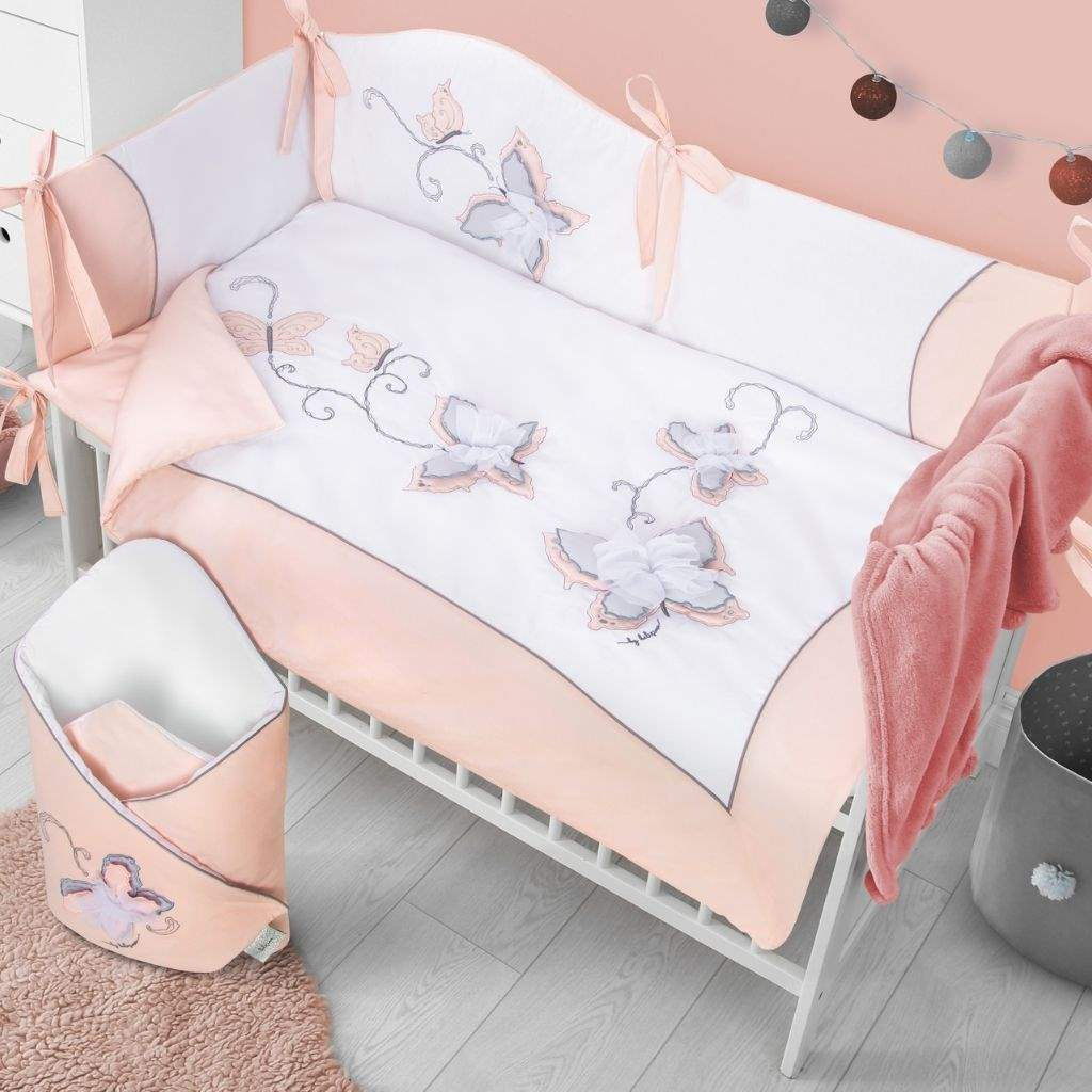 Krásná dětská bavlněná 6-dílná souprava do postýlky Belisima Butterfly pro miminka. Je vyrobena z měkkého, příjemného materiálu. Souprava obsahuje povlečení na polštářek cca 40x60 cm, povlečení na peřinku cca 100x135 cm, mantinel cca 180 cm, výplň polštářek a peřinka, nebesa. Materiál 100% bavlna.