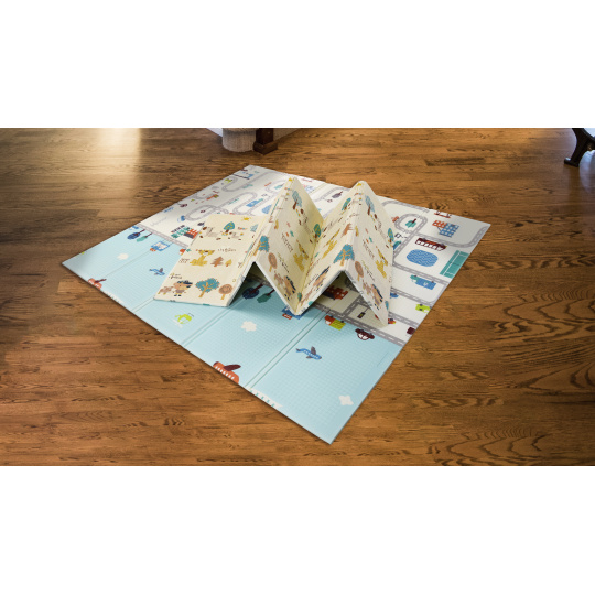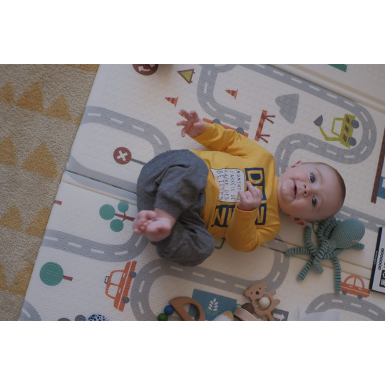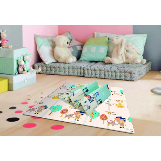 Veselá skládací podložka, která nabízí mnoho využití. Podložku je možné využít na hraní, cvičení, odpočinek ať už doma nebo na cestách. Veselá podložka má oboustranný potisk, se kterým si děťátko užije spousty zábavy. Může poznávat zvířátka, barvy, dopravní prostředky. Strana s autíčky může sloužit jako hrací deska pro autíčka, na straně se zvířátky můžete zase stavět malou zoo. Veselé postavičky a něžné barvy rozvíjí dětskou fantazii a podporují rozvoj zrakového smyslu. Podložka je vyrobena z XPE pěny, což je velmi lehký a zároveň velmi pružný a pevný materiál. Na potisk byl použit inkoust z rostlinného oleje, aby v každém ohledu výrobek odpovídal vysokým bezpečnostním potřebám děťátka. Podložka je dodávána v praktické cestovní tašce, do které si svou oblíbenou podložku můžete jednoduše složit a vzít s sebou ať už na dovolenou nebo k babičce.