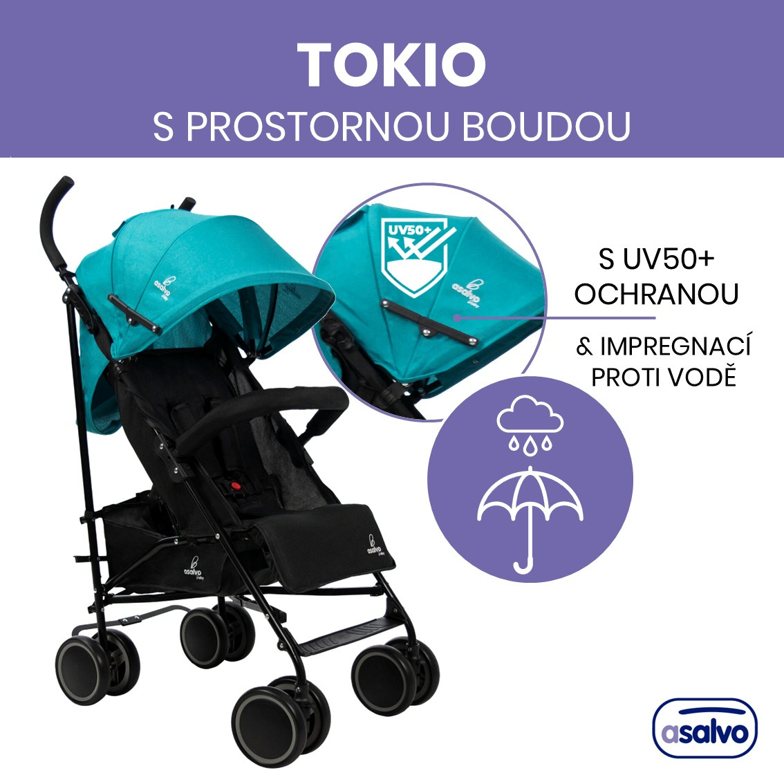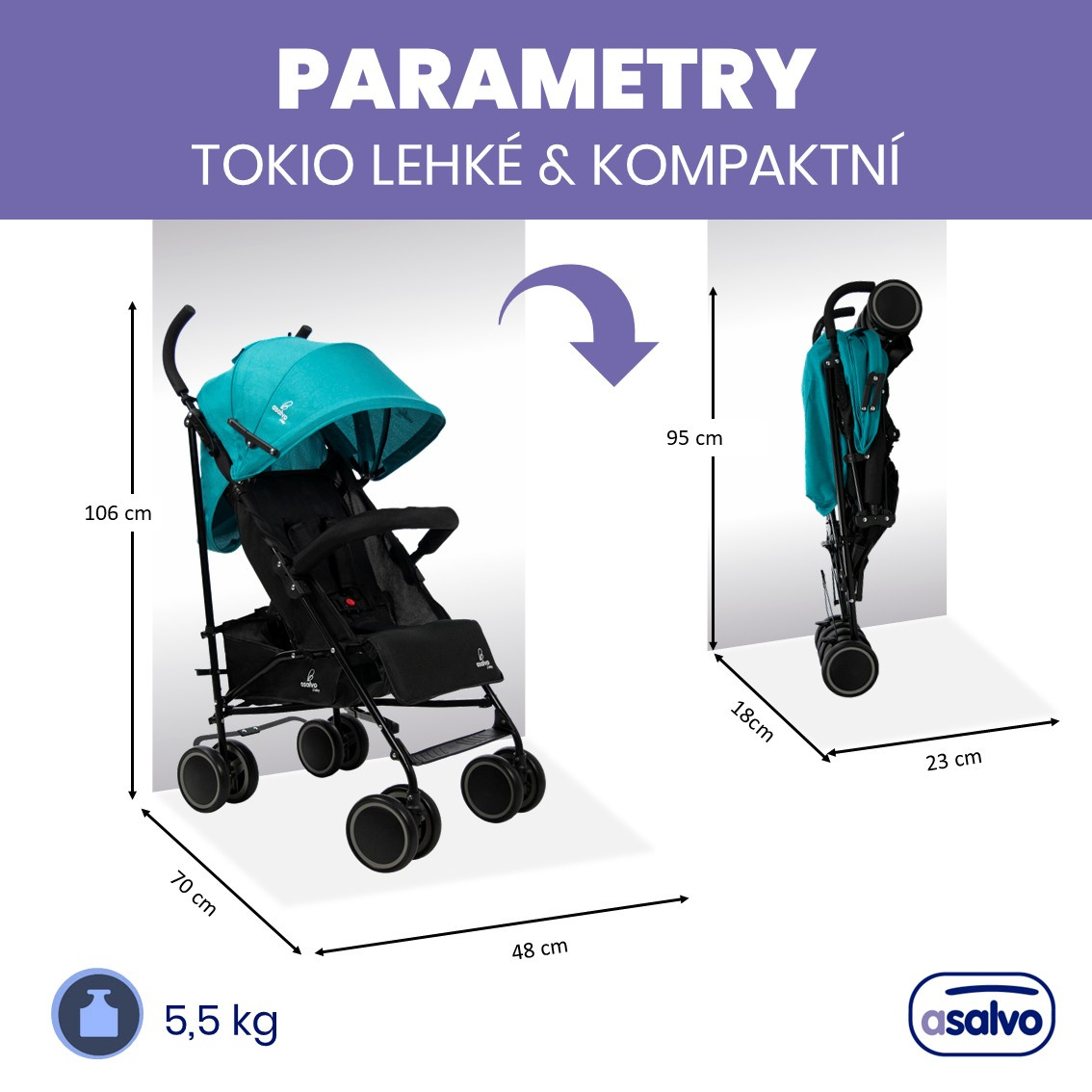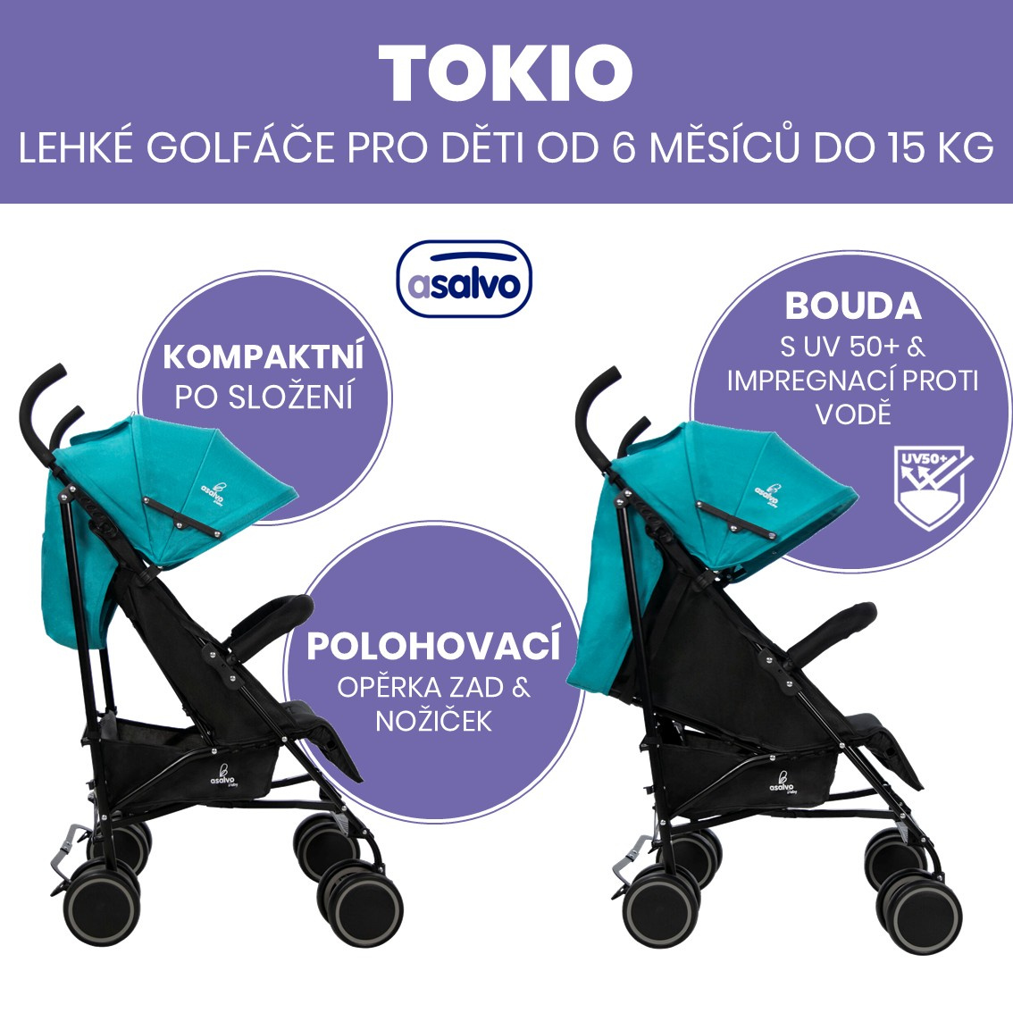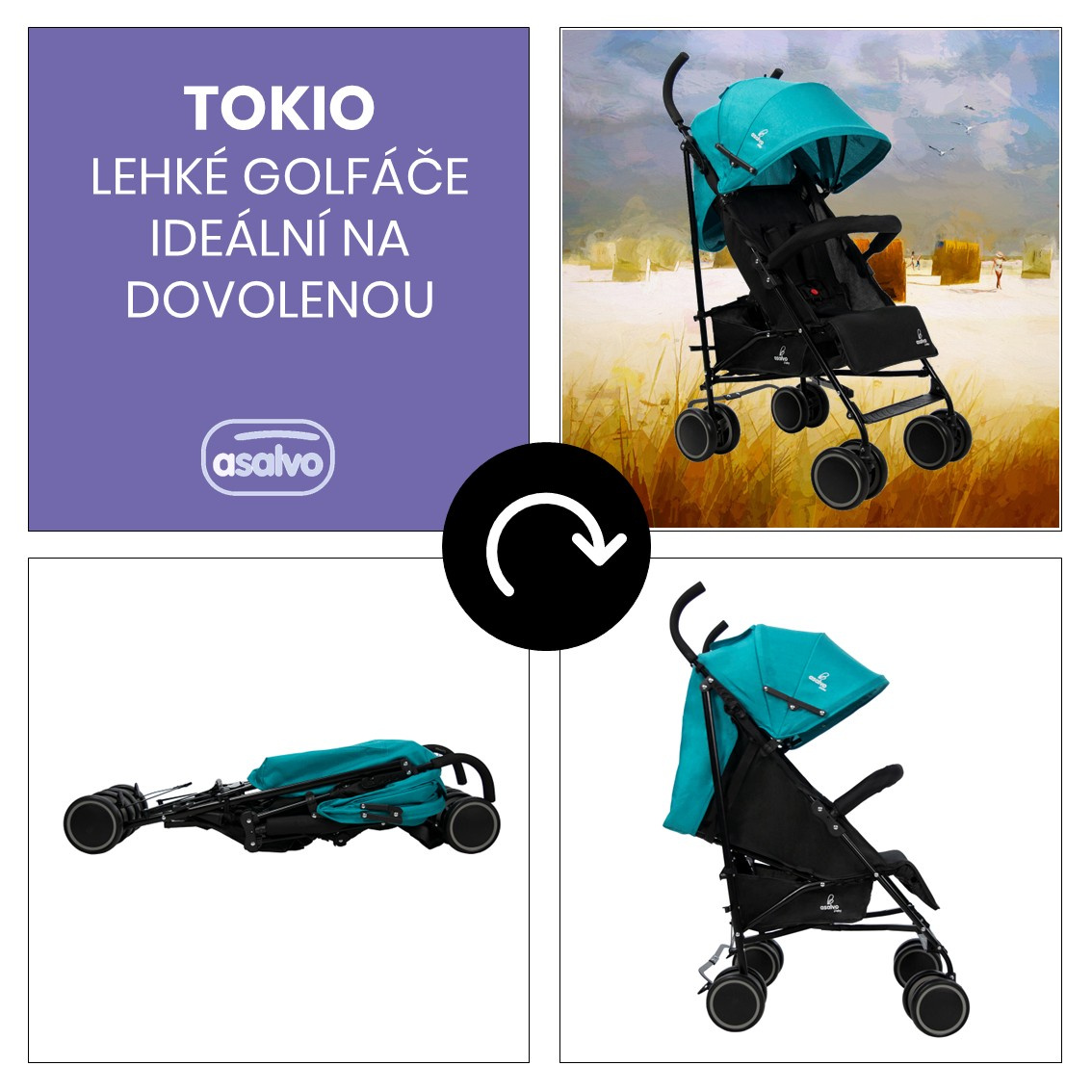 Golfový kočárek Tokio je velmi lehký, váží pouze 5,5 kg. Jedná se o vysoce funkční kočárek s dvojitými koly, která umožňují snadné manévrování. Je vybaven nastavitelnou opěrkou zad a nohou, ochranným obloukem a úložným košíkem.
