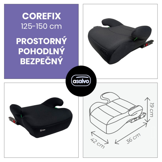 Autosedačka CoreFix, navržená pro děti od 125 do 150 cm, kombinuje bezpečnost a pohodlí s dvojí možností instalace - isofixem a pásem vozidla - pro stabilní a bezpečné upevnění. Její široké, ergonomické sedadlo