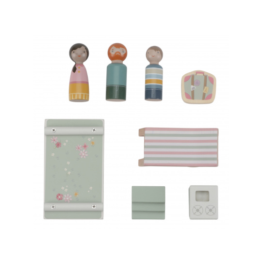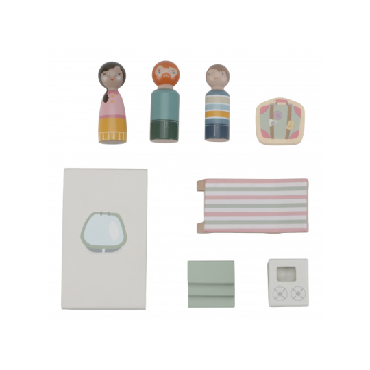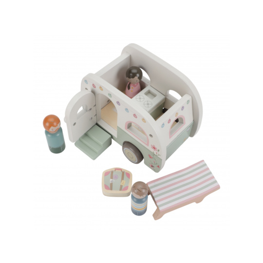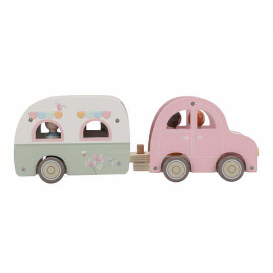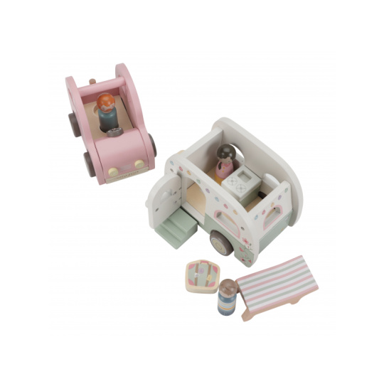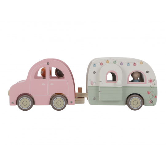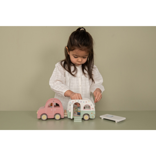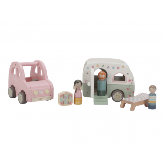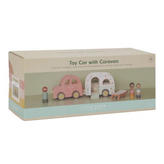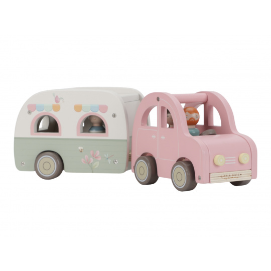 Roztomilé růžové auto s karavanem v kvalitním dřevěném provedení doveze celou rodinku za prázdninovým dobrodružstvím. Karavan má odnímatelnou střechu a otevírací dveře, aby bylo možné rodinku i vybavení dovnitř snadno umístit. Balení obsahuje auto, karavan s odnímatelnou střechou, 3 figurky, kufr, lehátko, vařič a schůdky. Figurky jsou kompatibilní s domečkem pro panenky a dalšími dřevěnými hracími sadami Little Dutch. Vyrobeno z kvalitního dřeva certifikovaného FSC. Rozměry: 32 x 11 x 9,5 cm Vhodné pro děti od 18 měsíců.