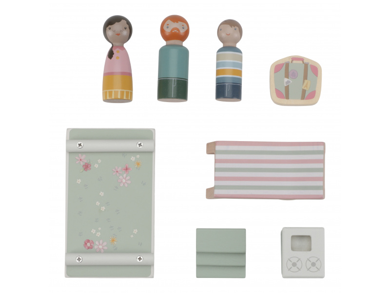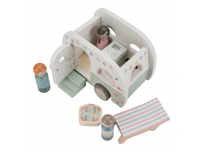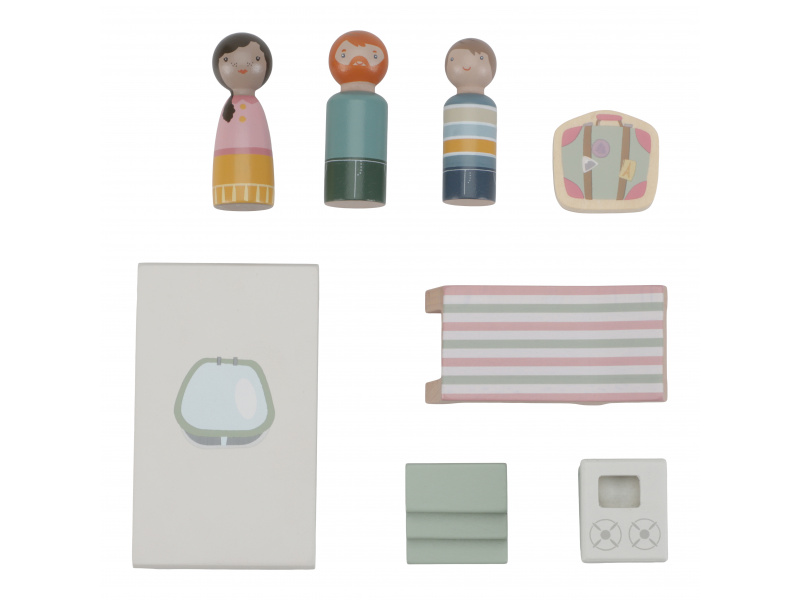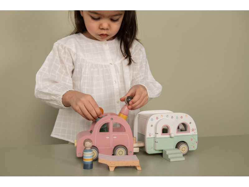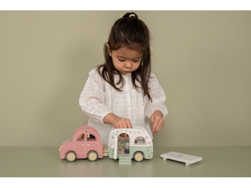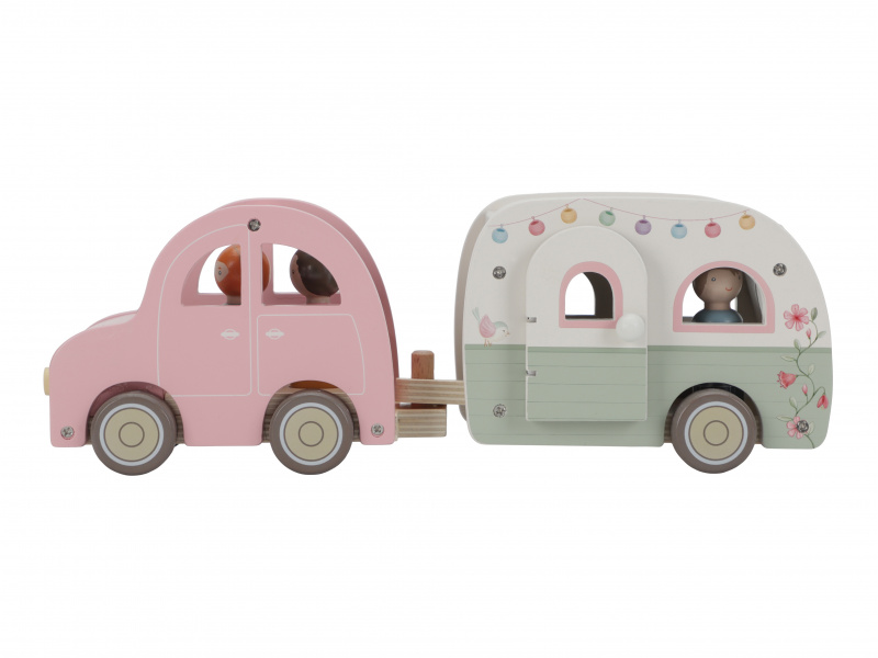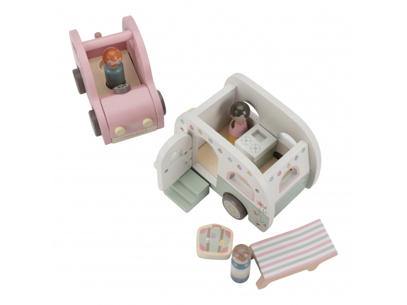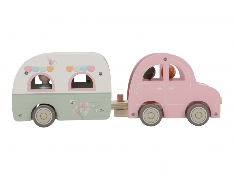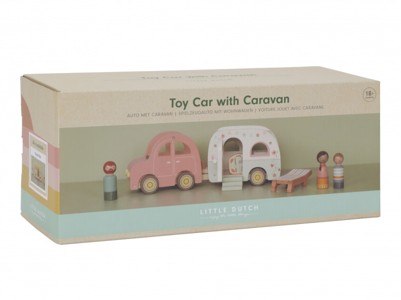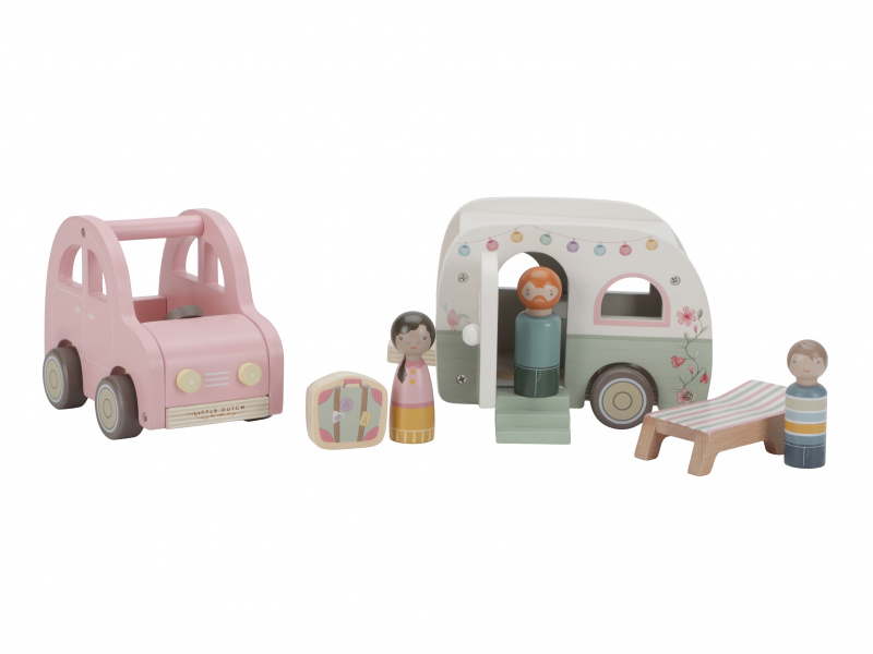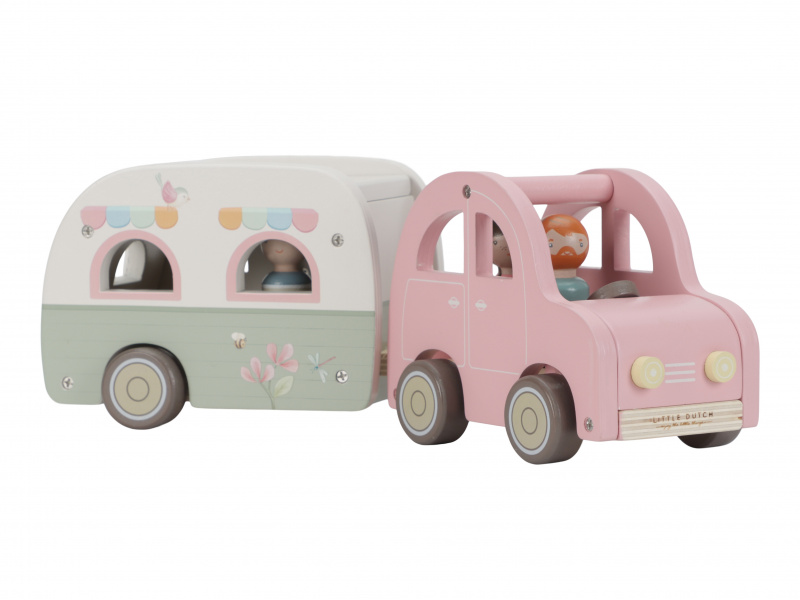 Roztomilé růžové auto s karavanem v kvalitním dřevěném provedení doveze celou rodinku za prázdninovým dobrodružstvím. Karavan má odnímatelnou střechu a otevírací dveře, aby bylo možné rodinku i vybavení dovnitř snadno umístit. Balení obsahuje auto, karavan s odnímatelnou střechou, 3 figurky, kufr, lehátko, vařič a schůdky. Figurky jsou kompatibilní s domečkem pro panenky a dalšími dřevěnými hracími sadami Little Dutch. Vyrobeno z kvalitního dřeva certifikovaného FSC. Rozměry: 32 x 11 x 9,5 cm Vhodné pro děti od 18 měsíců.