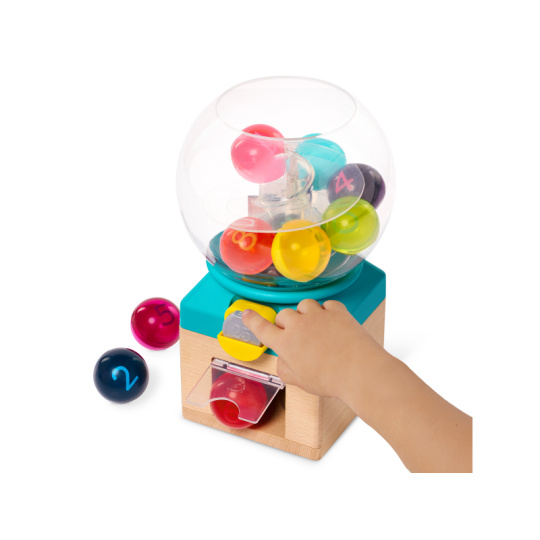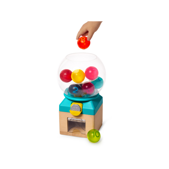 Zábava, barvy a učení v jednom! Stylový retro automat na „žvýkačky“ od B. Toys promění každé hraní v dobrodružství s čísly. Naplňte průhlednou kouli 10 barevnými míčky a stiskněte minci – překvapení je na světě! Děti budou nadšeně sledovat, jak míčky vyjíždějí ven po točité rampě, a při tom se naučí poznávat barvy i čísla od 1 do 10. Pevná dřevěná základna zajišťuje stabilitu a elegantní vzhled – hračka je tak i krásným doplňkem dětského pokoje. • Obsahuje 10 barevných míčků s čísly a základnu s mincí • Stiskem mince se uvolní míček a děti hádají, jaké číslo vyjede • Podporuje hrubou motoriku, koordinaci oko-ruka, poznávání barev a čísel Rozměry: 15,3 × 16,3 × 26,4 cm Vhodné pro děti od 12 měsíců.