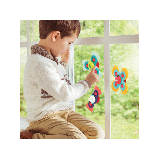 Oblíbené spinnery v provedení pro nejmenší nabízí stejnou zábavu, jako klasický fidget spinner, ale jejich provedení je přizpůsobeno dětem již od 10 měsíců. Baby spinnery mají měkké, pružné okraje a při otáčení vydávají zvuk, který dítě zaujme. Pohyblivé korálky na hračce i různorodé textury a výrazné barvy budou dítě lákat ke zkoumání. Přísavka umožňuje spinner připevnit vodorovně i vertikálně na jakýkoli hladký povrch, např. na pult jídelní židličky, na vanu, na okno apod. Rozměry: 4-dílný 14 x 14 x 4,3 cm, 3-dílný 13,5 x 12 x 4,2 cm, 2-dílný 13 x 5,3 x 4,4 cm Vhodné pro děti od 10 měsíců.