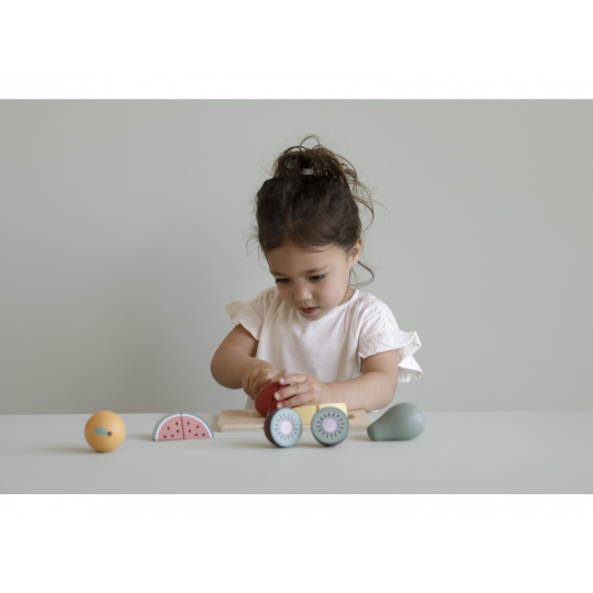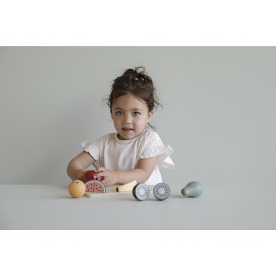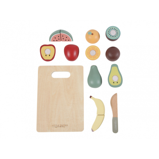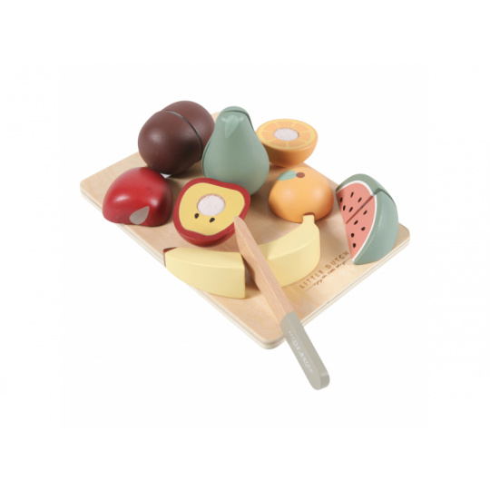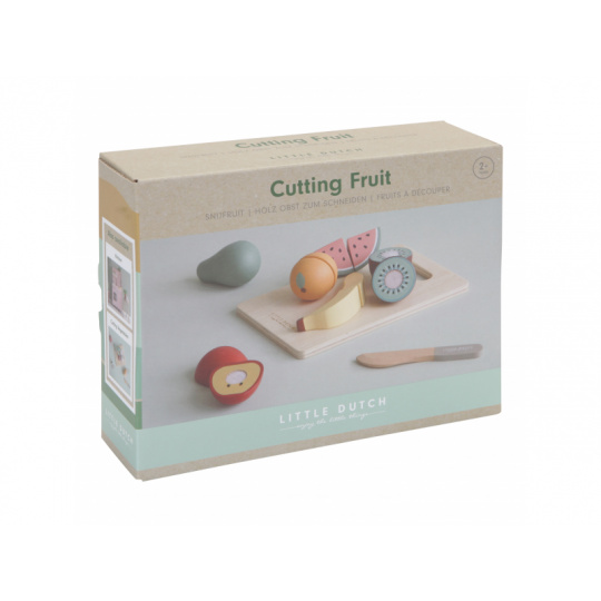 Ovoce je potřeba před servírováním nakrájet! Tato dřevěná sada obsahuje 6 druhů ovoce (jablko, banán, kiwi, hrušku, pomeranč a meloun), dřevěný nožík a krájecí prkénko. Každý kousek zeleniny je možné rozdělit na dva kusy a opět spojit pomocí suchého zipu. Rozměry: 21 x 16,7 x 6 cm Vhodné pro děti od 2 let.