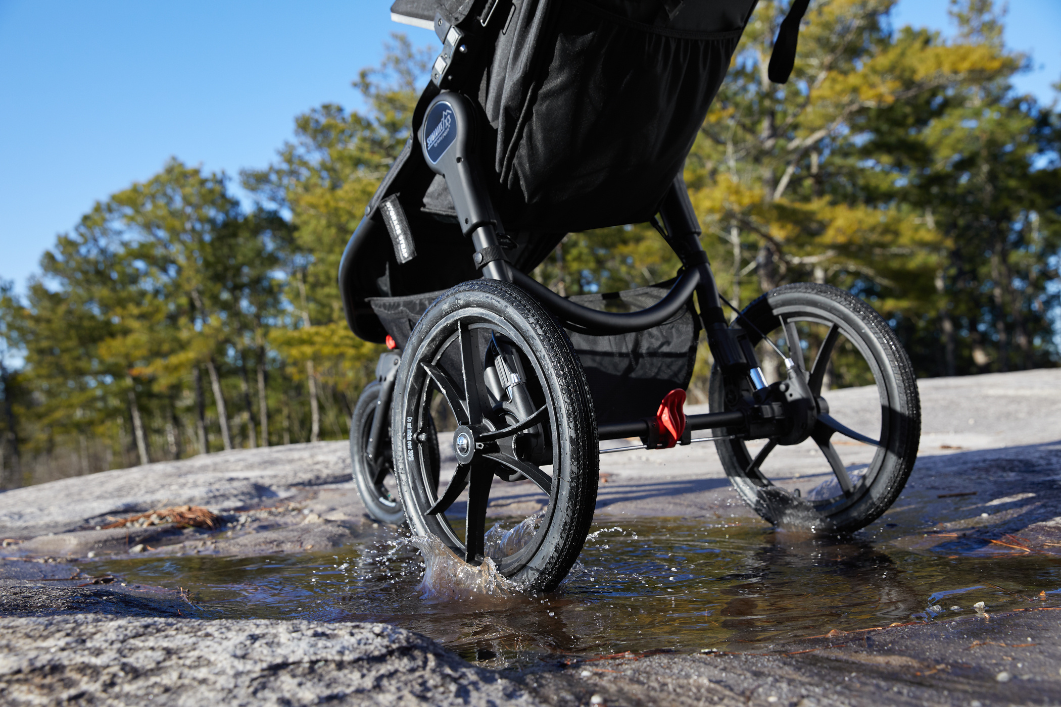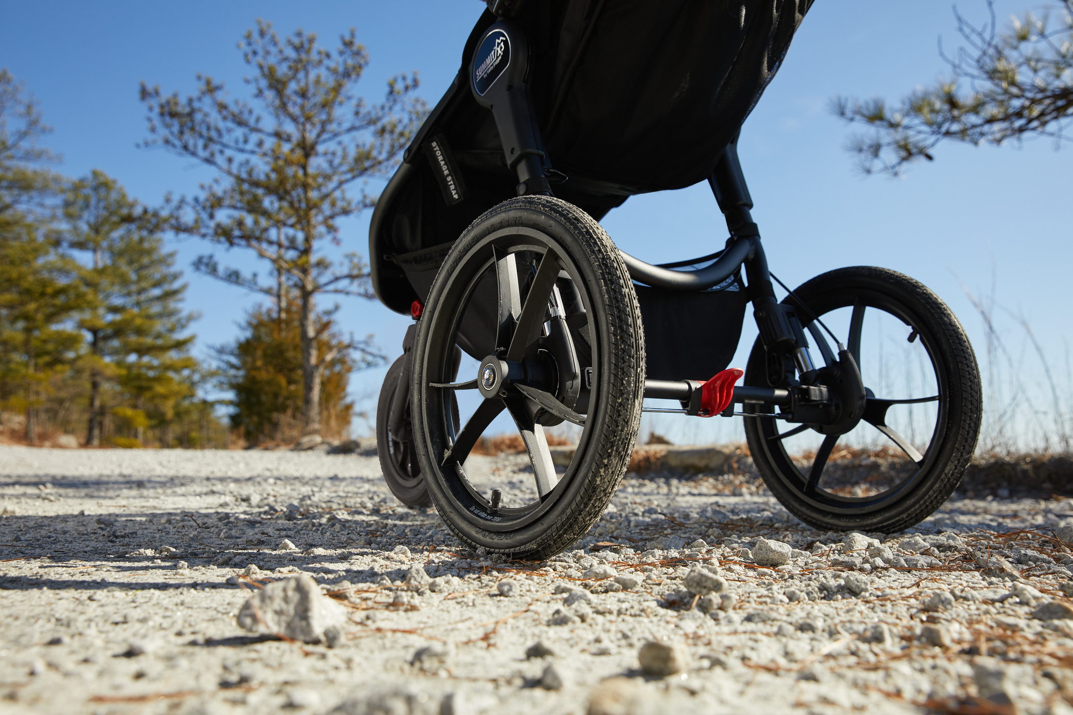 ODPRUŽENÍ VŠECH KOL // Summit ™ X3 má 12 "a 16" vzduchem naplněná gumová kola s odpružením 3x3, díky nimž je jízda po jakémkoli terénu tou nejhladší jízdou, ať už v režimu joggingu nebo při běžné jízdě s kočárkem.