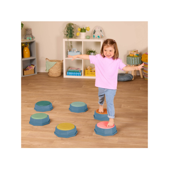 Balanční stupínky Balance & Hop poskytnou vašim dětem zábavu a zároveň pomáhají rozvíjet jejich rovnováhu, koordinaci a hrubou motoriku. Sada obsahující 6 stupínků nabízí mnoho způsobů použití, takže pokaždé můžete vymyslet novou, zajímavou variantu. Každý stupínek má jinou texturu na horní barevné straně. Balanční stupínky je možné kombinovat se samostatně prodávanou překážkovou dráhou Balance & Hop i sadou sadou překážek a stupínků Balance & Build. Vhodné pro děti od 3 let.