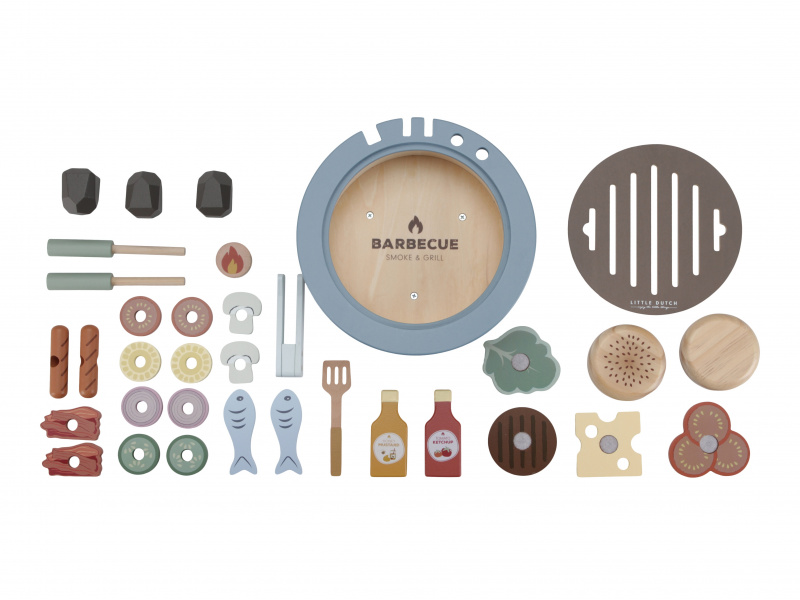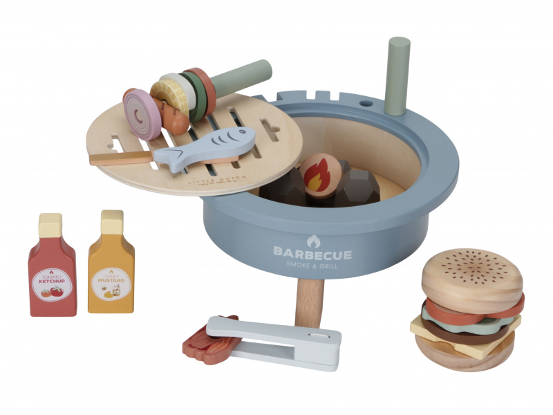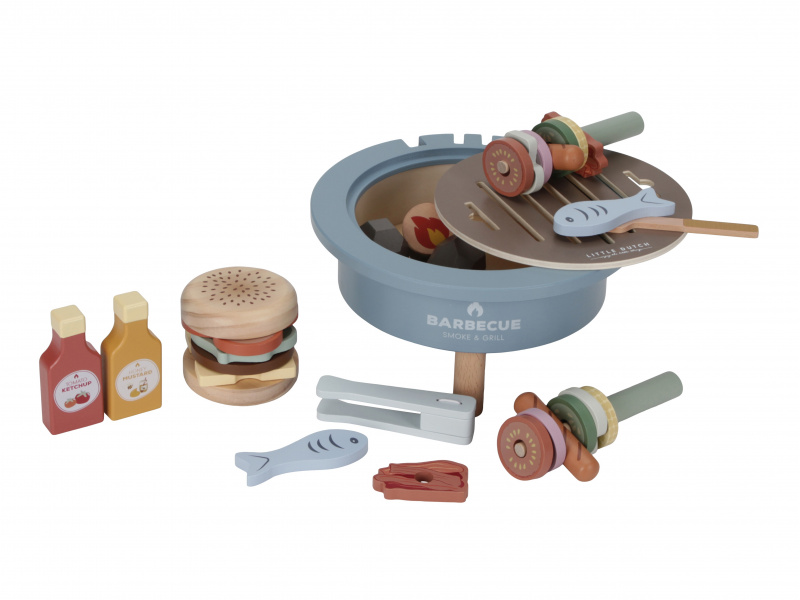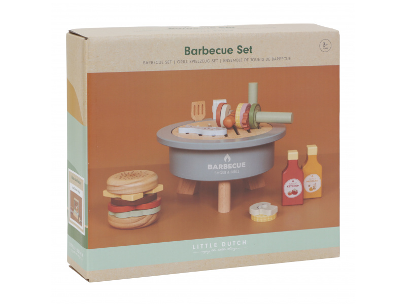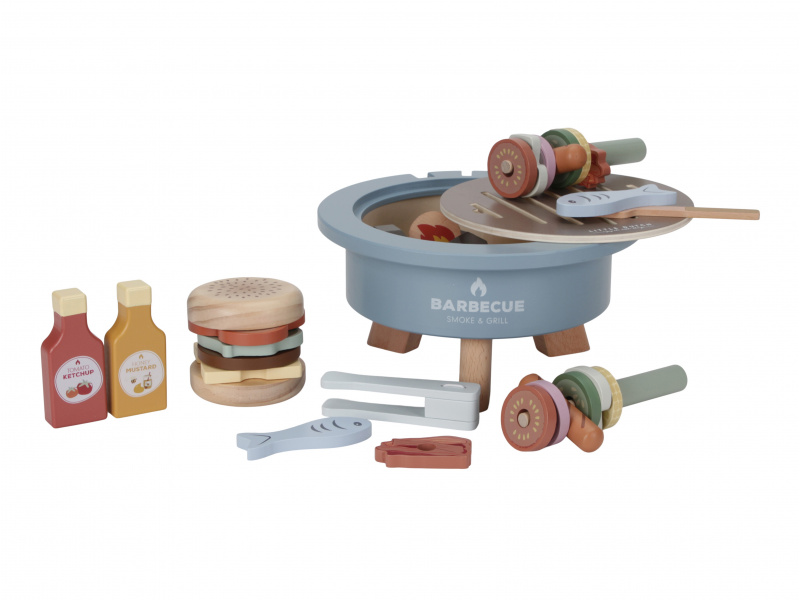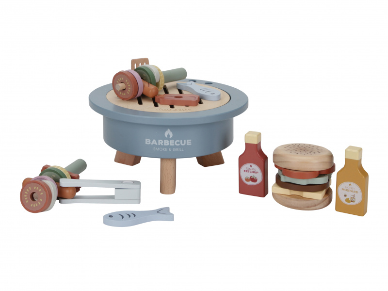 S touto bohatě vybavenou sadou na grilování má váš malý kuchař či kuchařka po ruce vše potřebné k přípravě letní barbecue party. Dali byste si zelenino-masový špíz, hamburger nebo grilovanou rybu? Než si vyberete, na co máte chuť, váš kuchař či kuchařka naplní gril dřevěným uhlím, aby se gril správně nahřál. Součástí 34-dílné sady je kečup, hořčice, houska na hamburger, rajčata, cibule, cuketa, kukuřice, salát, sýr, klobásy, houby, slanina, ryby, kleště, špízové jehly, obracečka a dřevěné uhlí. Tato dřevěná hračka poskytne vašemu dítěti hodiny kreativní hry, ať už griluje pro panenky, plyšáky nebo ostatní členy rodiny. Vyrobeno z kvalitního dřeva certifikovaného FSC. Rozměry: 24,5 x 24,5 x 12,2cm Vhodné pro děti od 3 let.