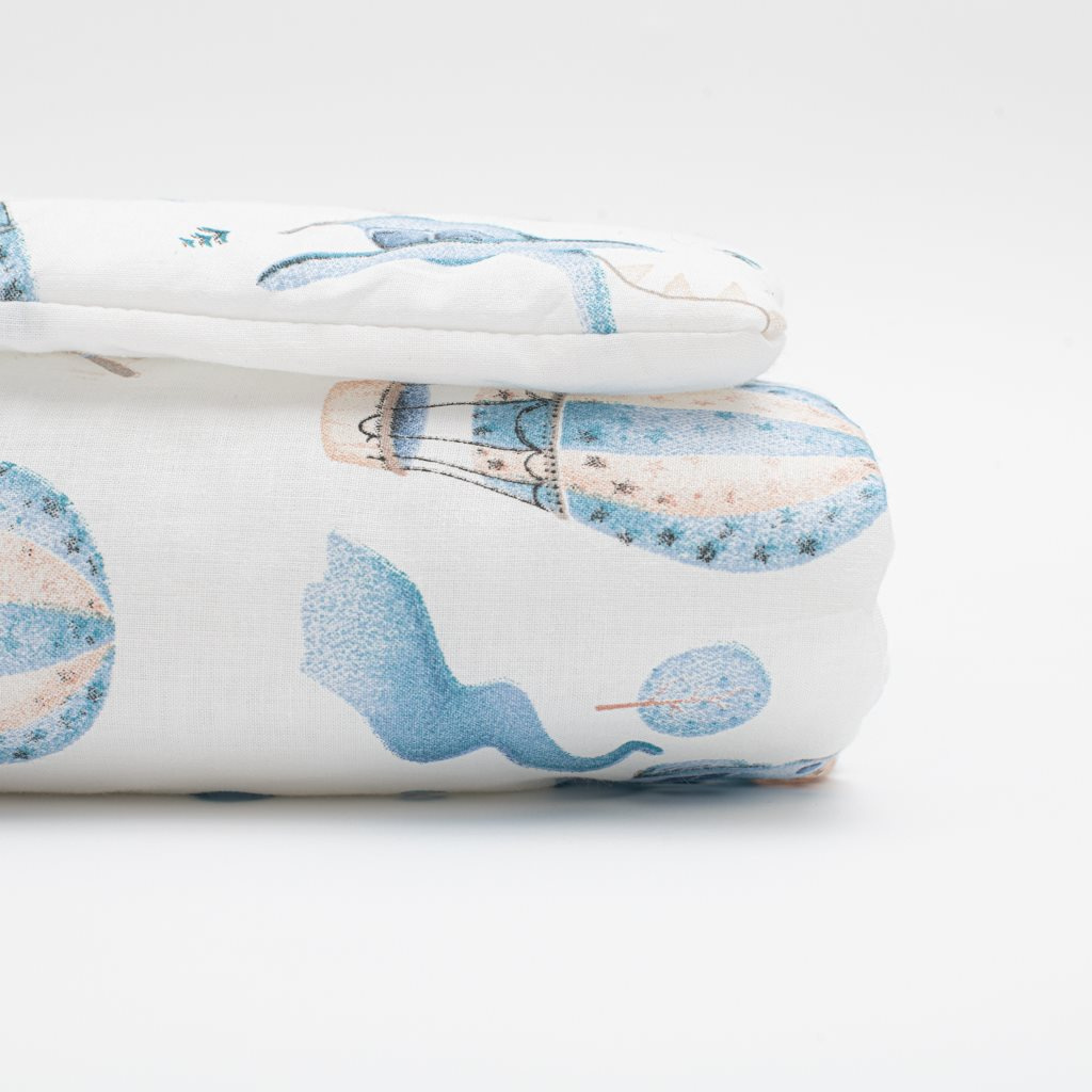 Nádherný bavlněný set do kočárku New Baby Romance. Set obsahuje polštářek a peřinku s potiskem pohádkového dobrodružství v oblacích. Vše je vyplněno antialergickým vláknem. Set je ušitý z vysoce kvalitní bavlny. Bavlněný set luxusně a jemně pohladí a zahřeje pokožku vašeho miminka. Rozměry: polštář: cca 32x25 cm, peřinka: cca 82x68 cm. Složení: povlak 100% bavlna, výplň 100% polyester.