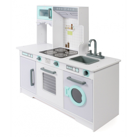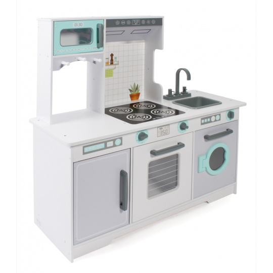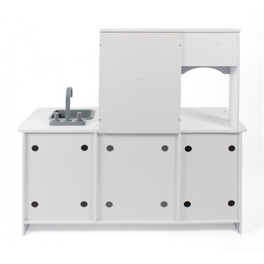 S touto skvělou kuchyní na hraní zažijí vaše děti spostu zábavy. Součástí kuchyně je mrazák, lednice se samolepkou výrobníku ledu, pohyblivá batrerie s dřezem, mnoho úlložných prostorů, velká trouba a varnými ploténkami a nastavitelnáými ovládacími prvky, mikrovlná trouba, telefon a věšák na utěrky. Materiál: dřevo, plast, rozměry: 91x30x