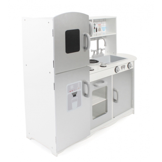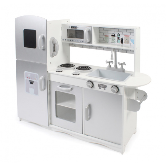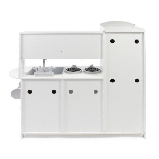 | S touto skvělou kuchyní na hraní zažijí vaše děti spostu zábavy. Součástí kuchyně je mrazák, lednice se samolepkou výrobníku ledu, pohyblivá batrerie s dřezem, mnoho úlložných prostorů, velká trouba a varnými ploténkami a nastavitelnáými ovládacími prvky, mikrovlná trouba, telefon a věšák na utěrky. Materiál: dřevo, plast, rozměry: 91x30x87 cm, hmotnost: 15kg. |