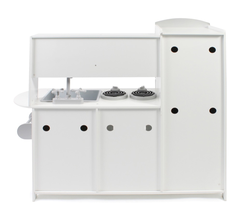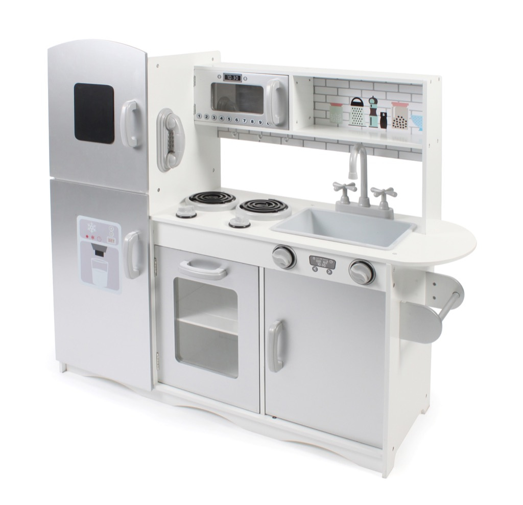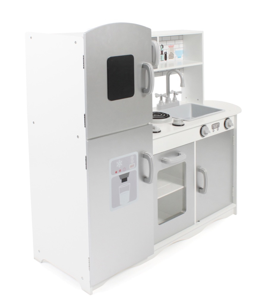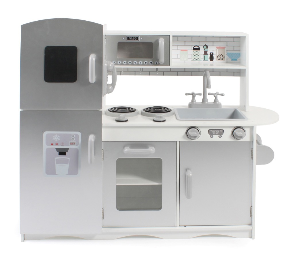 | S touto skvělou kuchyní na hraní zažijí vaše děti spostu zábavy. Součástí kuchyně je mrazák, lednice se samolepkou výrobníku ledu, pohyblivá batrerie s dřezem, mnoho úlložných prostorů, velká trouba a varnými ploténkami a nastavitelnáými ovládacími prvky, mikrovlná trouba, telefon a věšák na utěrky. Materiál: dřevo, plast, rozměry: 91x30x87 cm, hmotnost: 15kg. |