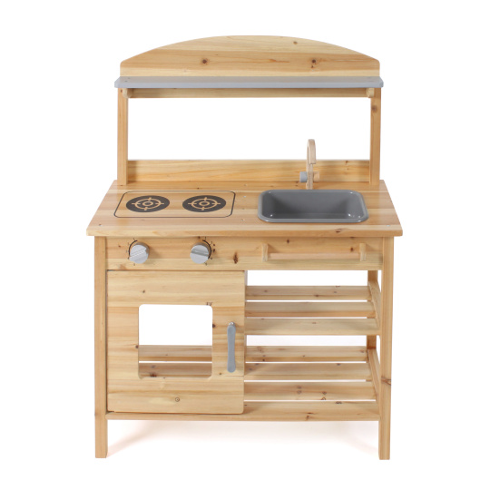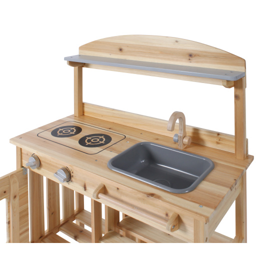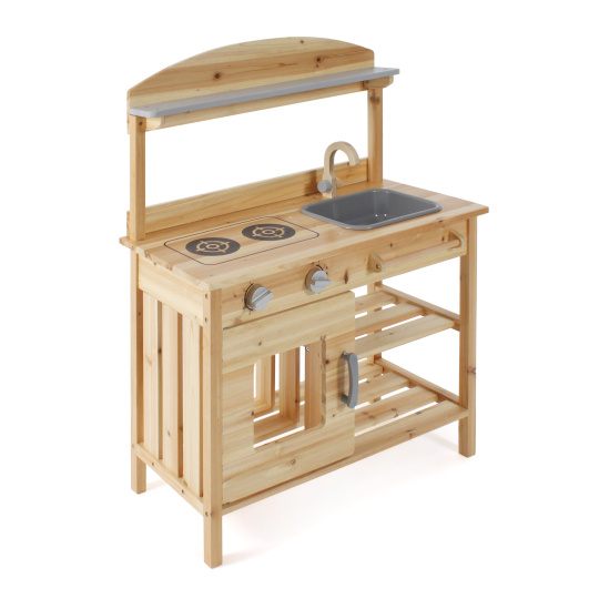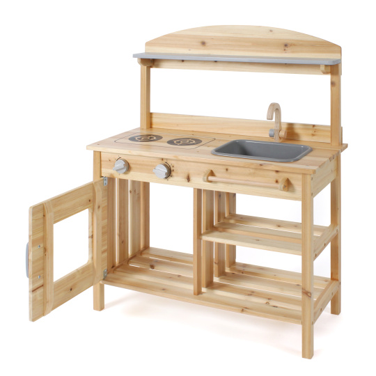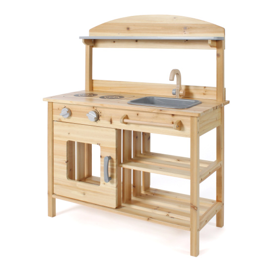 | Krásná dřevěná kuchyň z jedlového dřeva, KTEROU JE MOŽNÉ MÍT PO CELOU DOBU NA ZAHRADĚ VENKU. Je vybavena 2 varnými ploténkami, troubou s ovládacími knoflíky a odnímatelným dřezem a baterií. Pod dřezem je tyč na pověčení utěrky. Materiál,rozměry: šířka je 68 cm, výška pultu 84 cm. |