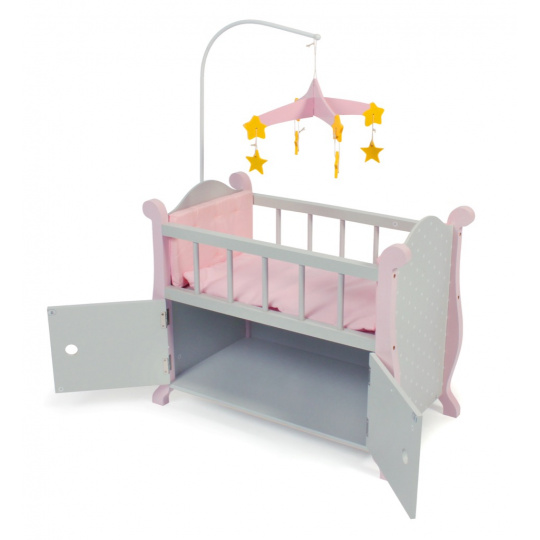 Postýlka s úložným prostorem má měkké polstrování, nad postýlkou je zavěšen kolotoč pro panenku.