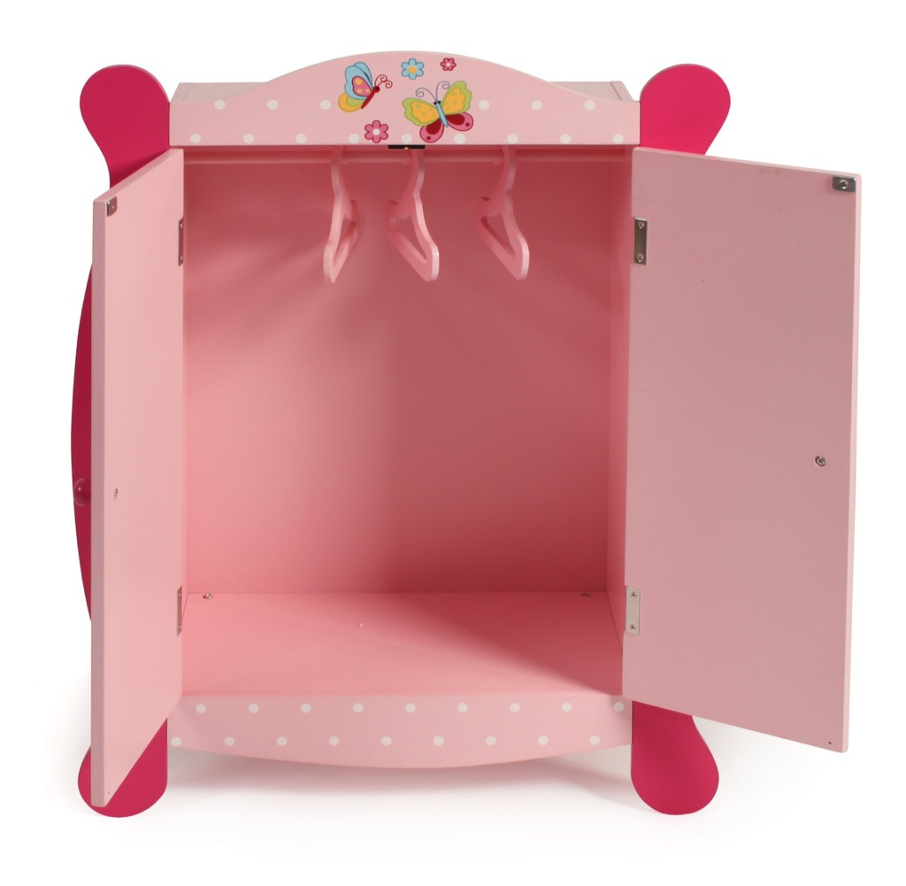 | Růžový šatník pro panenky z velmi kvalitního dřevěného materiálu. Povrch je lakovaný, ozdobený puntíky a motýly. Uvnitř šatníku je tyč na ramínka a tři ramínka. |