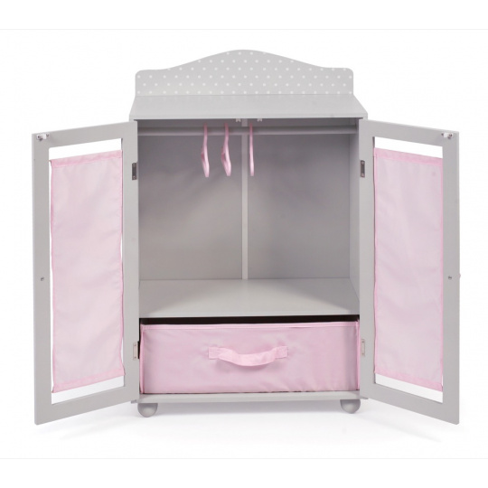 Veliká skříň pro panenky má tyč na ramínka, 3 ramínka a vyjímatelný box.