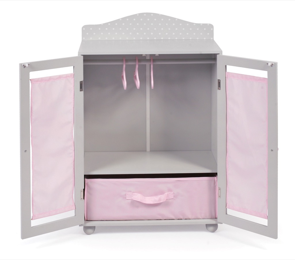 Veliká skříň pro panenky má tyč na ramínka, 3 ramínka a vyjímatelný box.