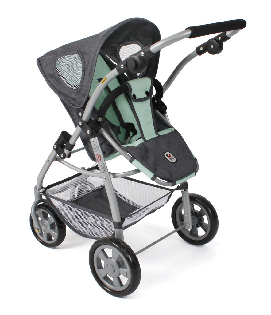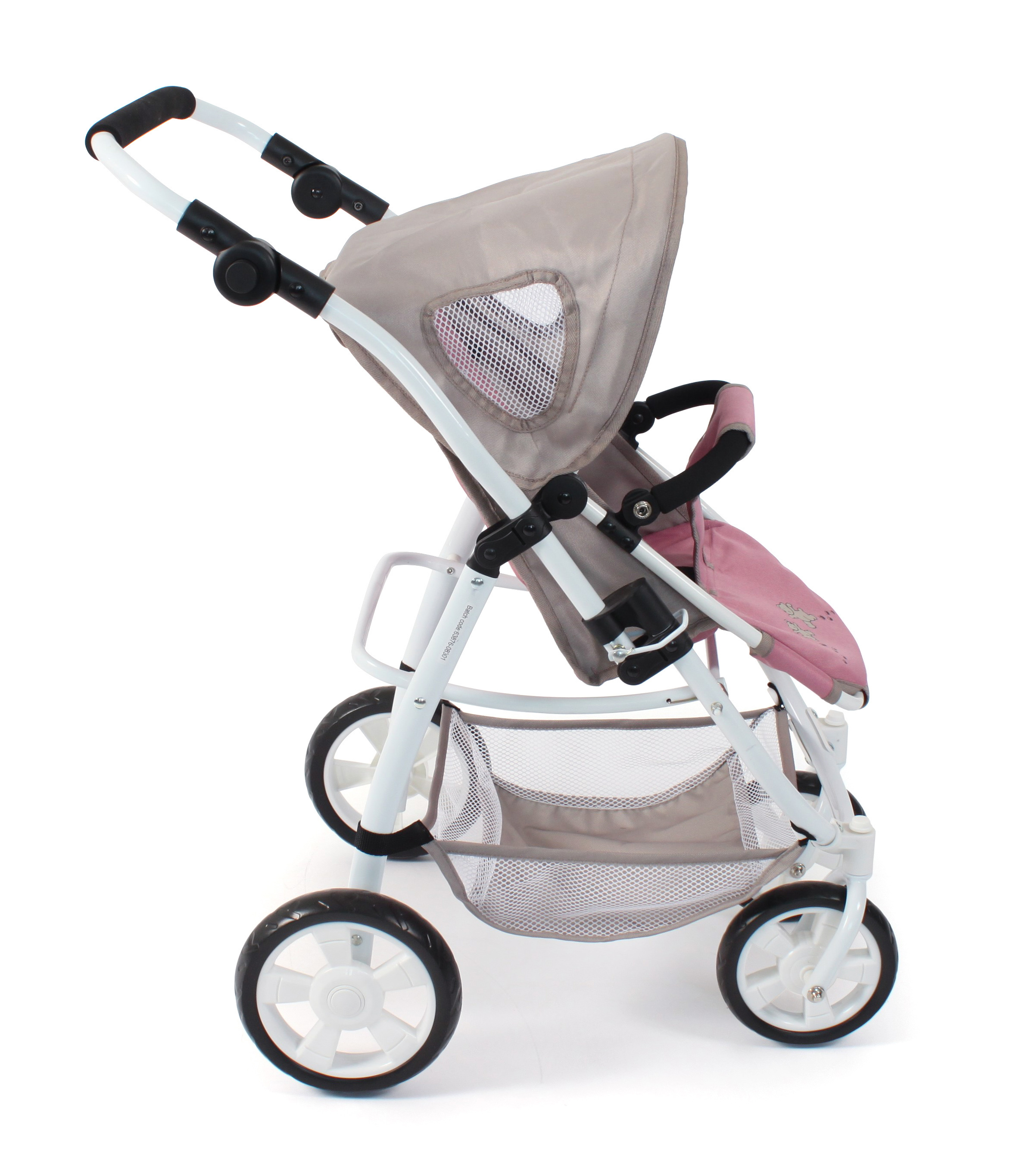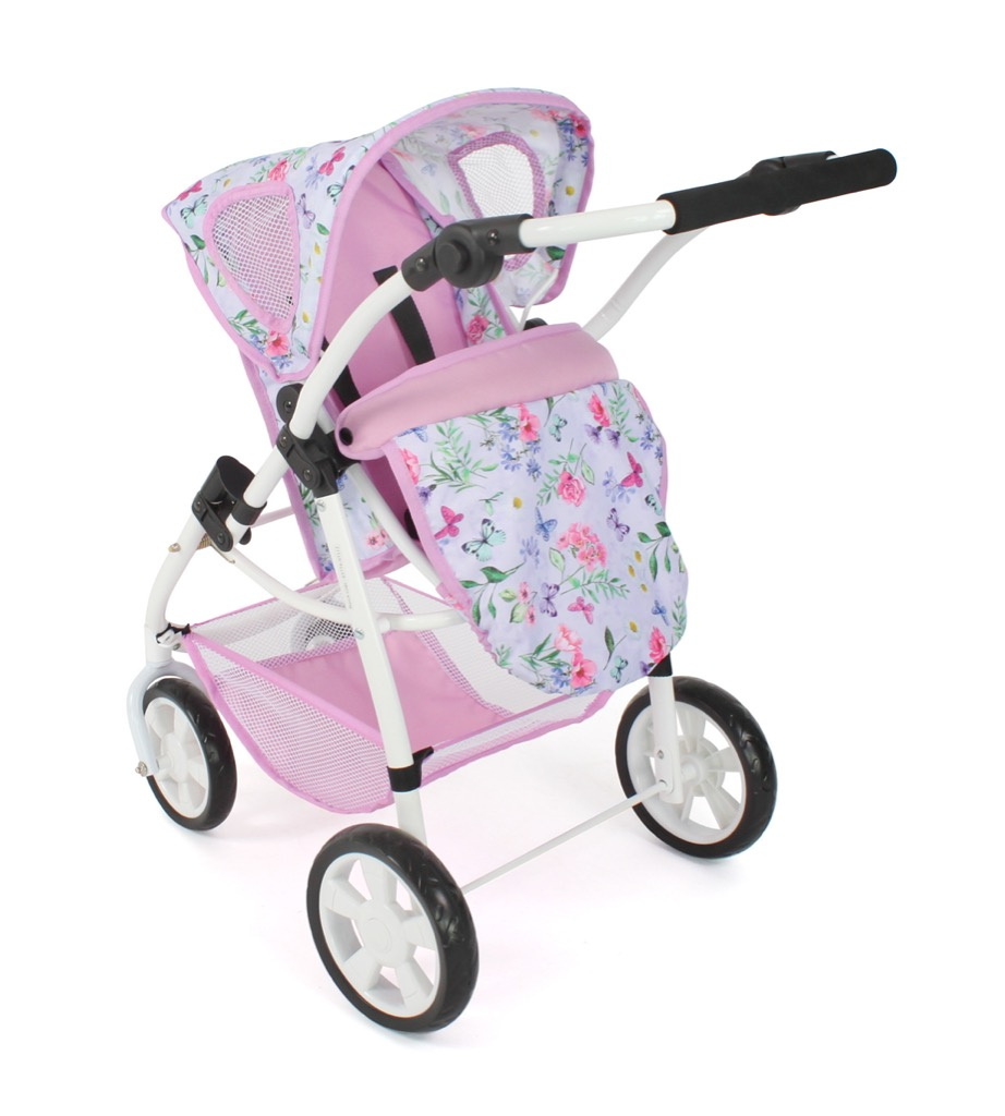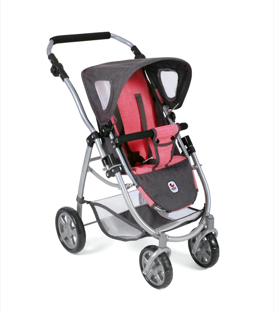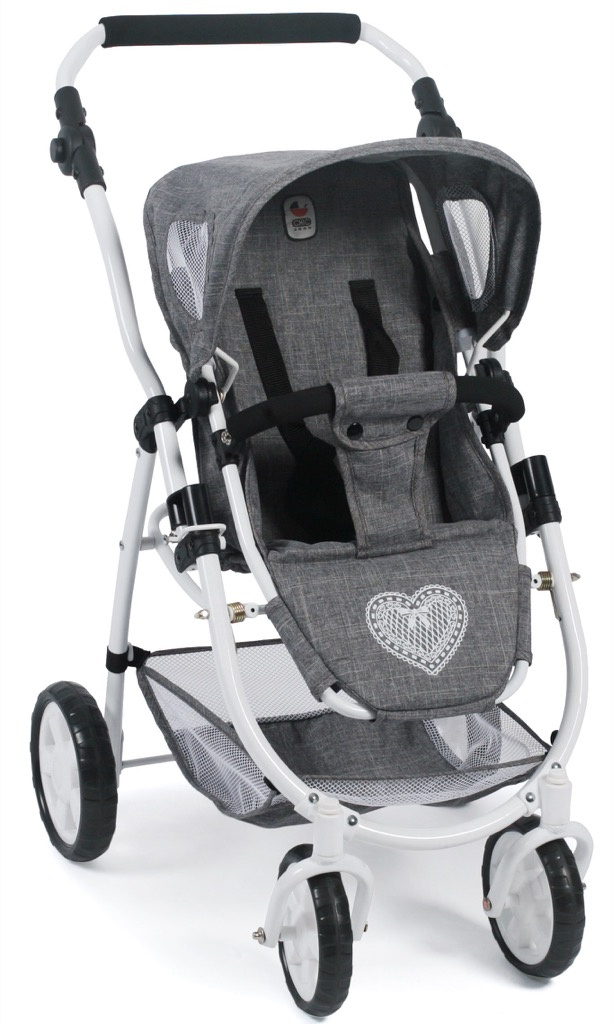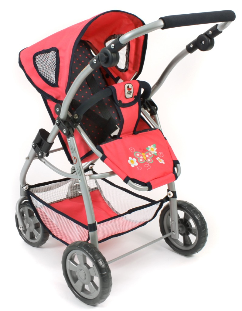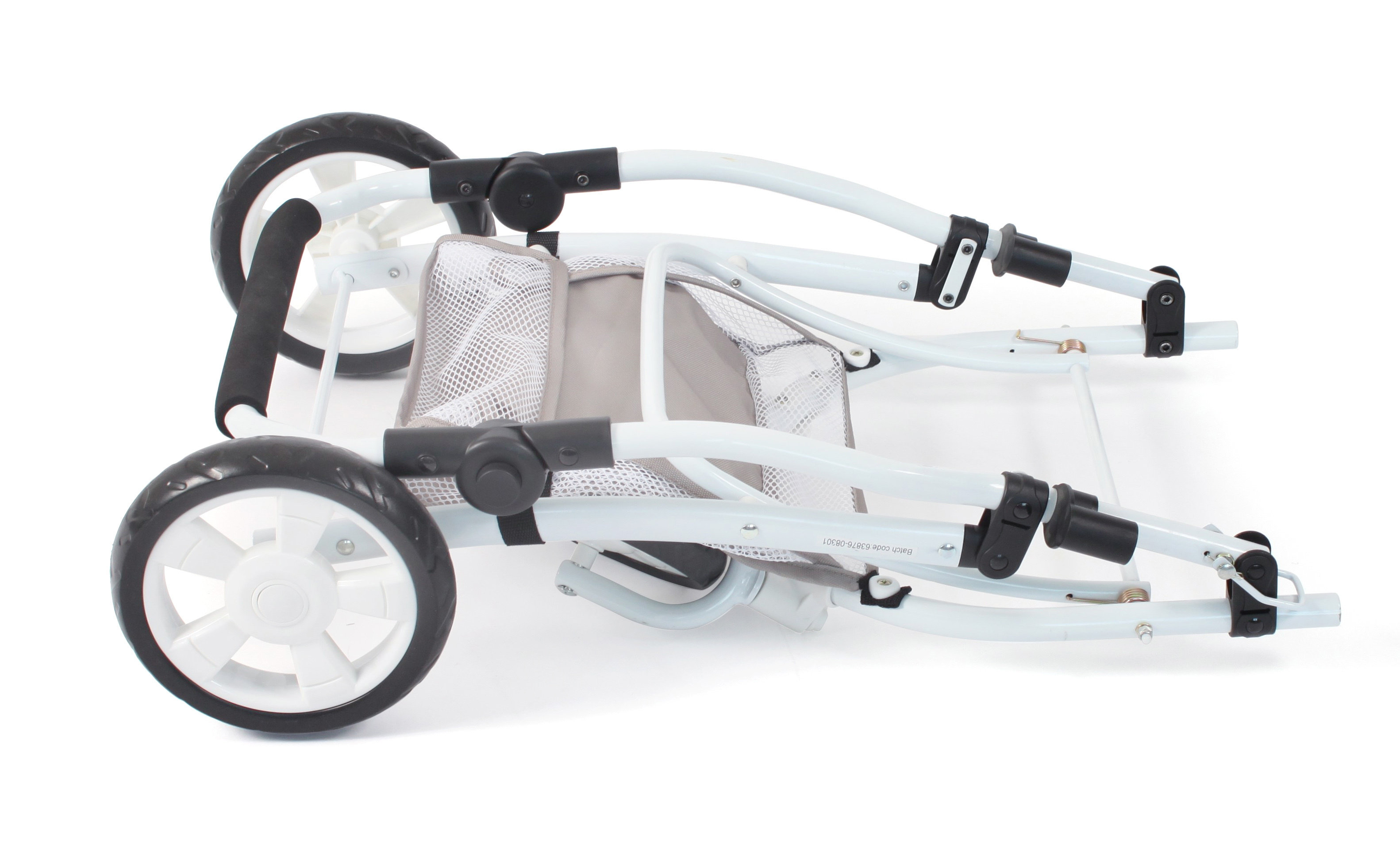 Korbičky lze složit na plocho pro transport nebo uskladnění. Sportovní korba má hrazdu a pás na upínání panenky. V hluboké korbě je slamníček. Korbička je vybavena ušima pro snadné přenášení, autosedačka je vybavena klasickým madlem, jako je to u sedaček pro dětská miminka. Přední kolečka se otáčejí kolem svislé osy. Kočárek má nastavitelnou rukojeť, samozřejmostí je síťka na drobnosti ve spodu kostry.