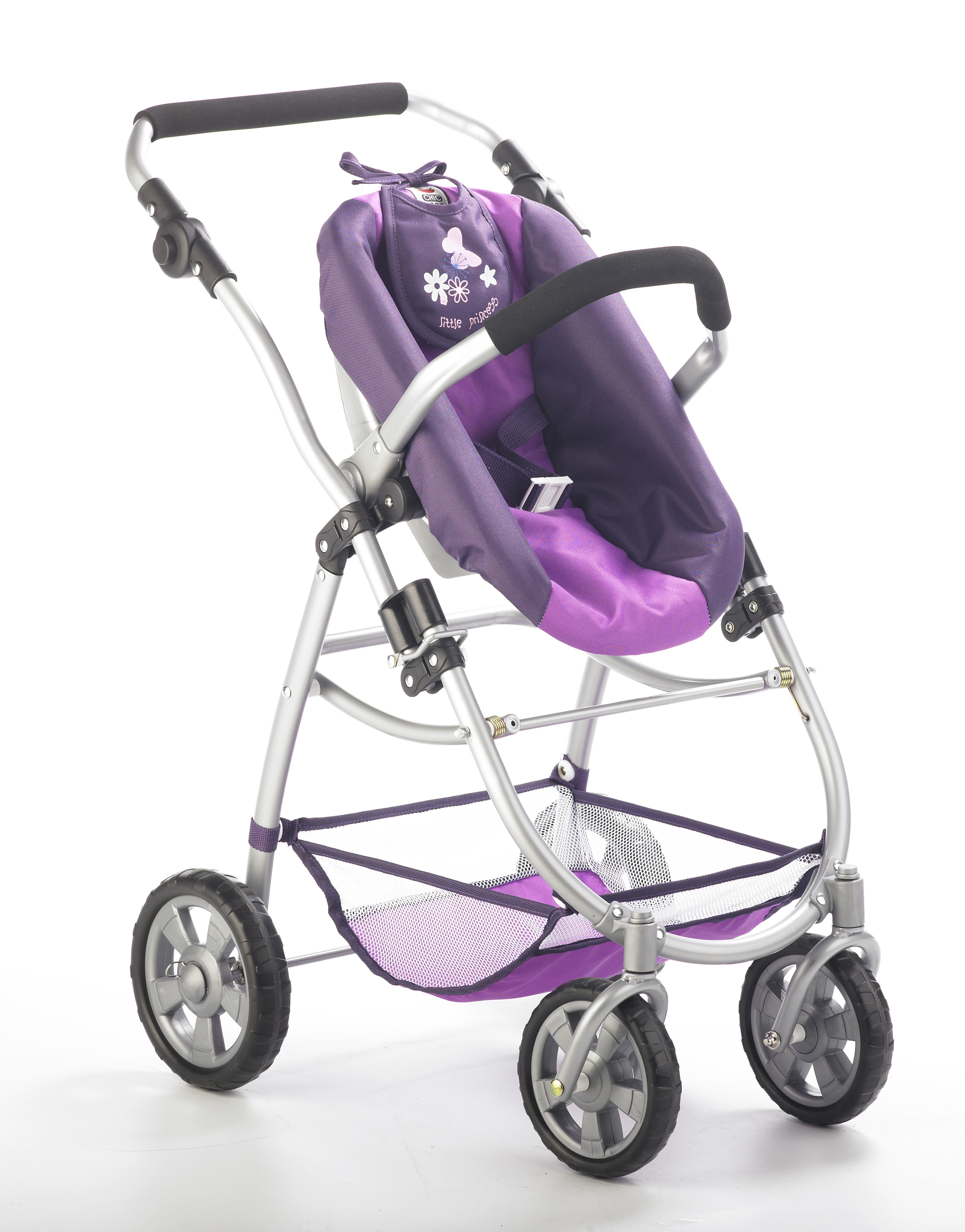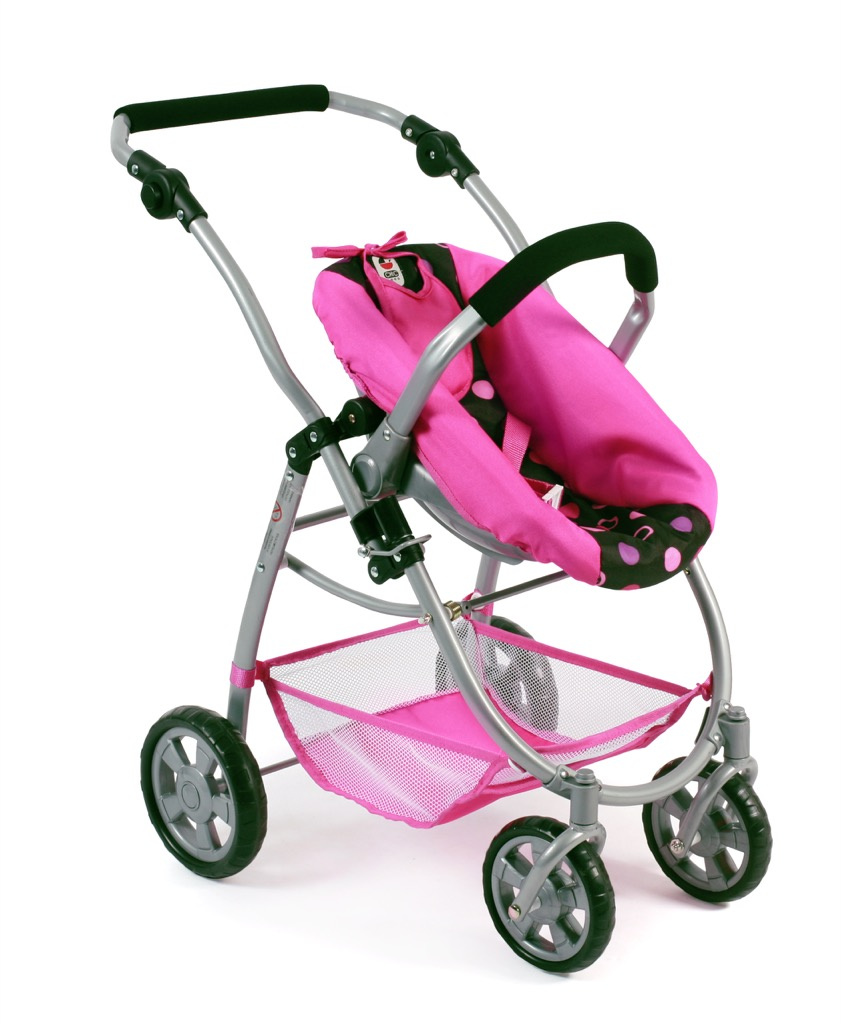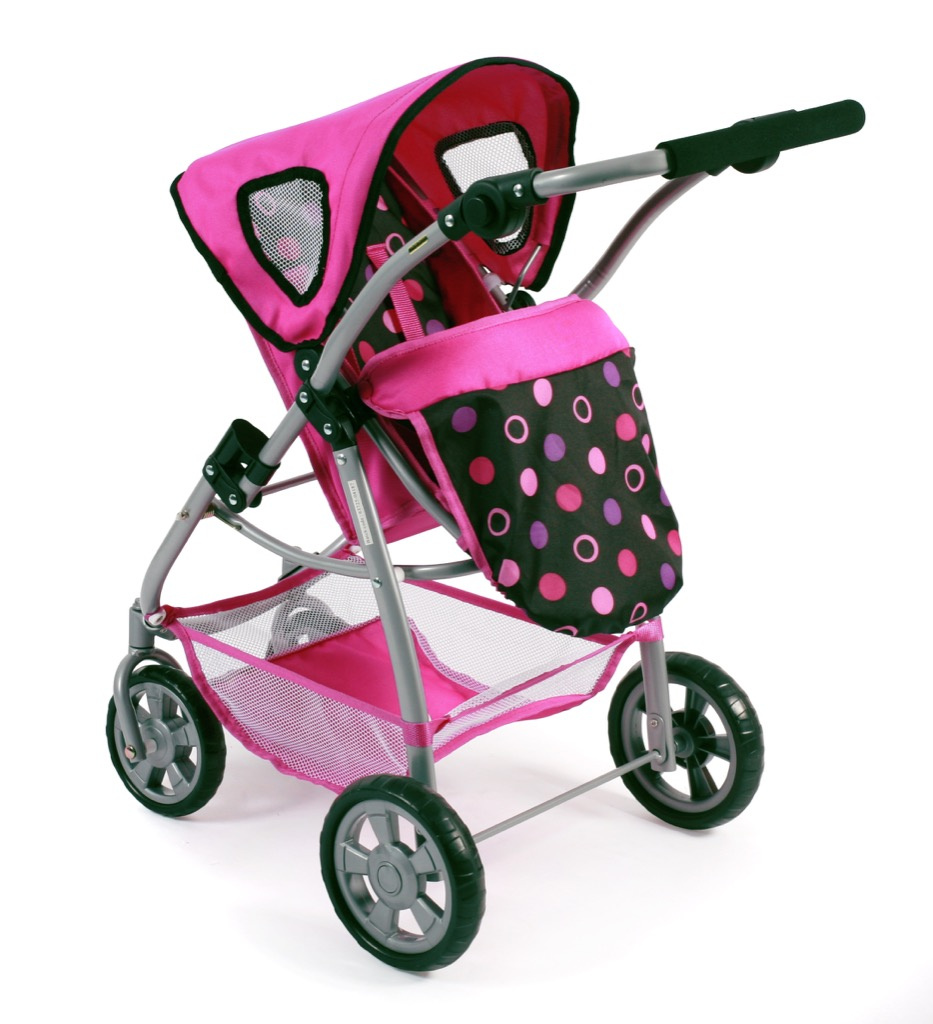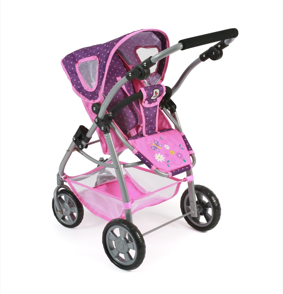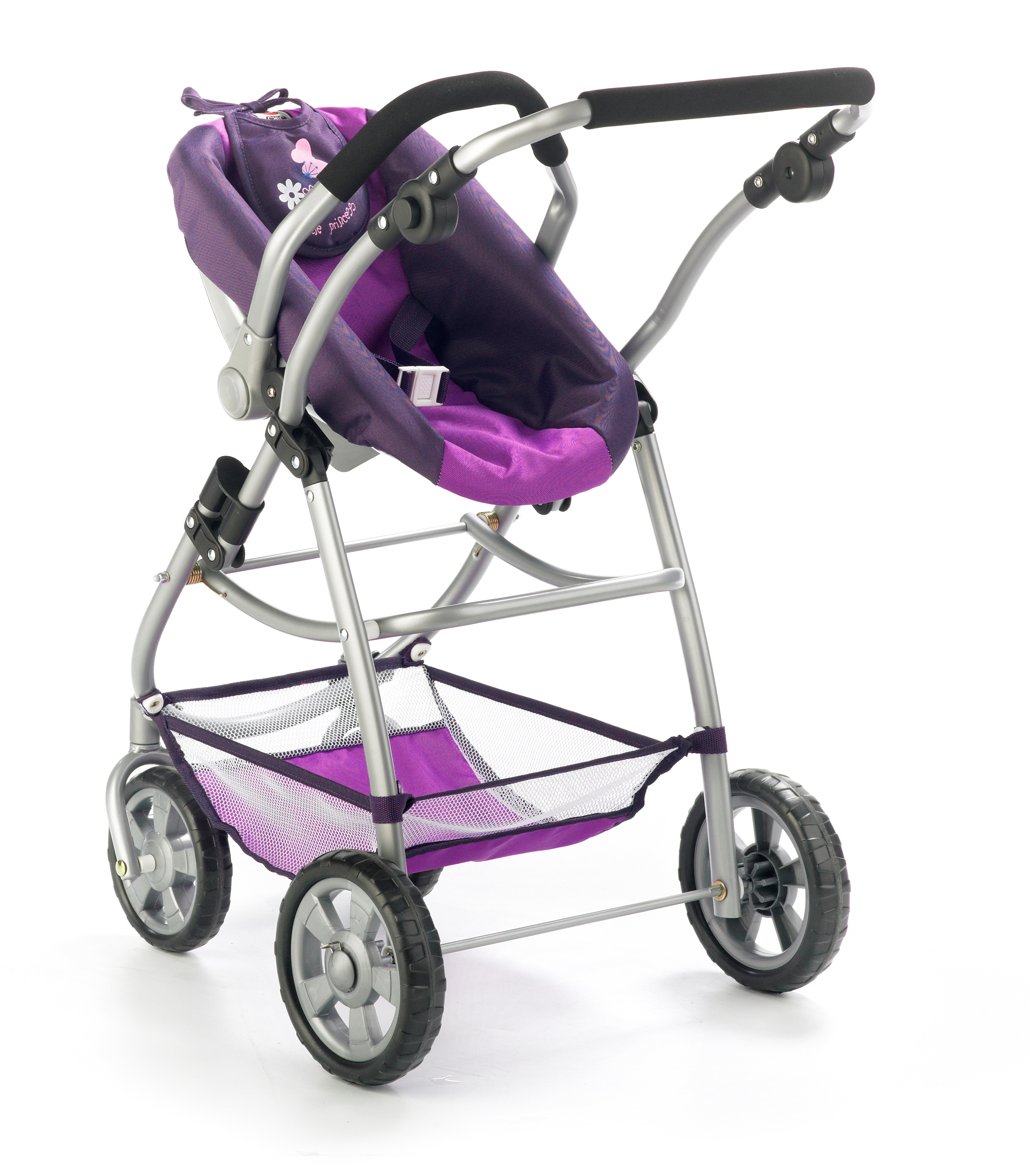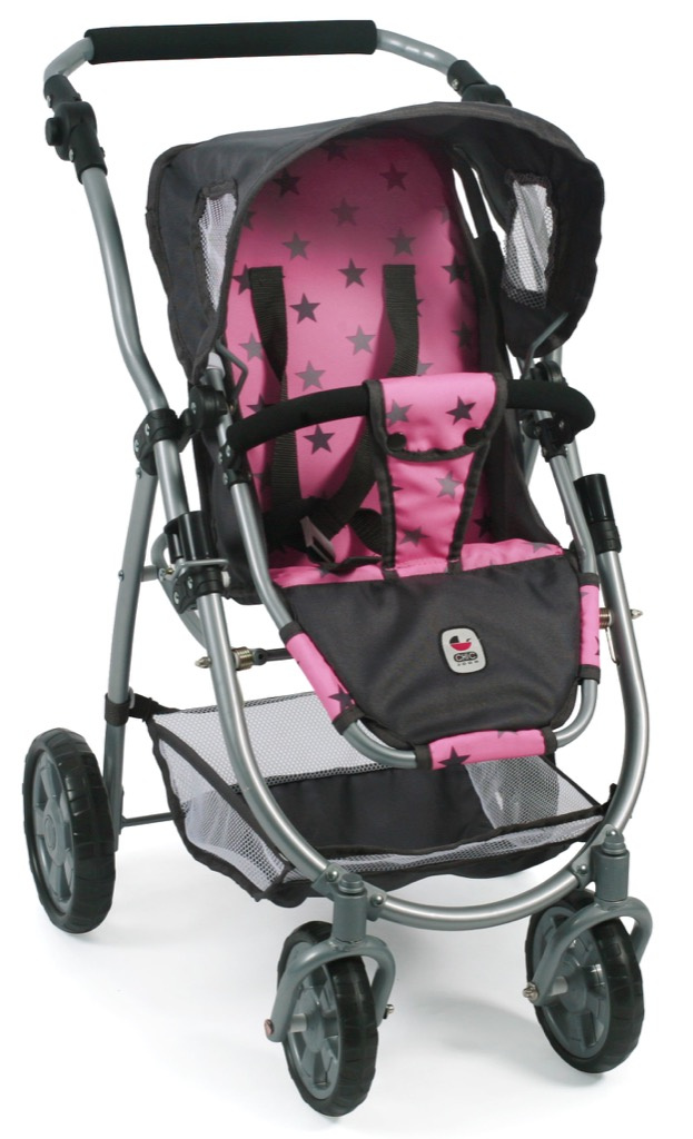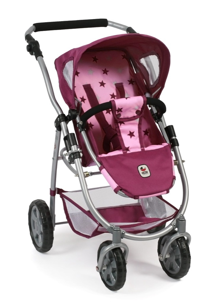 Korbičky lze složit na plocho pro transport nebo uskladnění. Sportovní korba má hrazdu a pás na upínání panenky. V hluboké korbě je slamníček. Korbička je vybavena ušima pro snadné přenášení, autosedačka je vybavena klasickým madlem, jako je to u sedaček pro dětská miminka. Přední kolečka se otáčejí kolem svislé osy. Kočárek má nastavitelnou rukojeť, samozřejmostí je síťka na drobnosti ve spodu kostry.