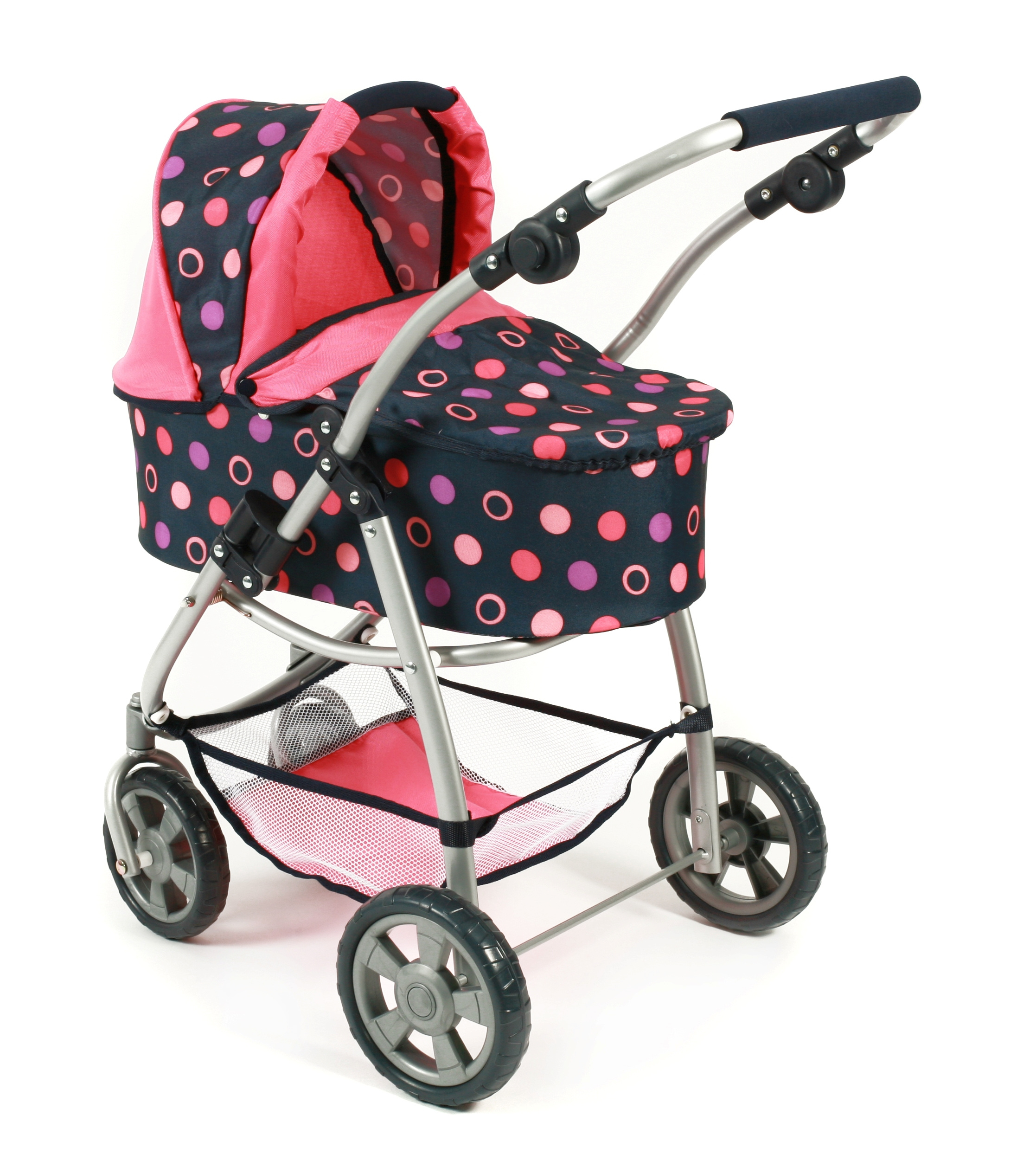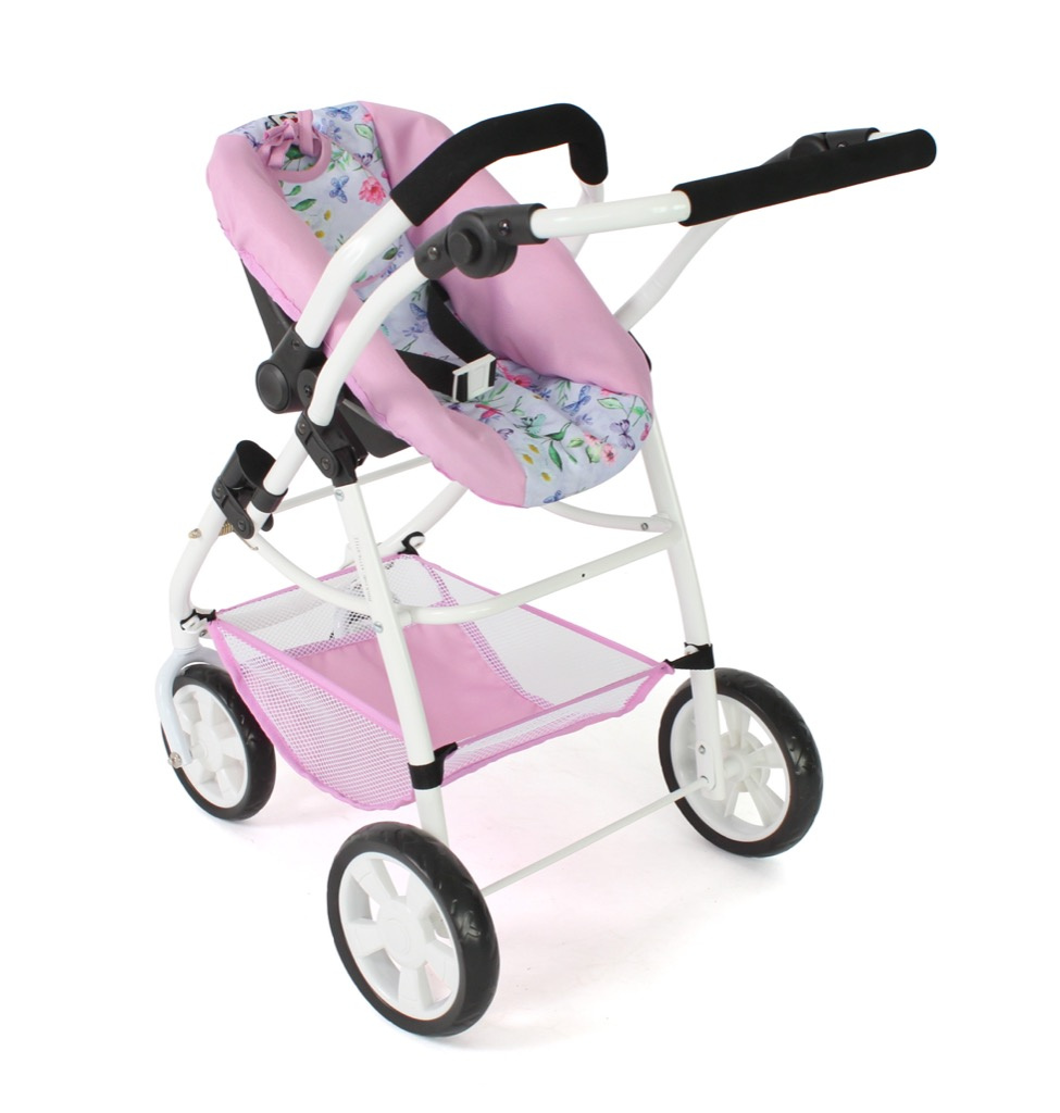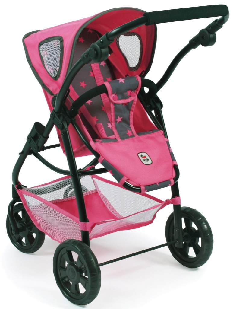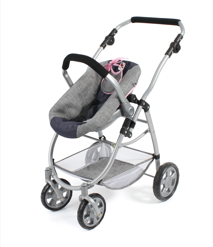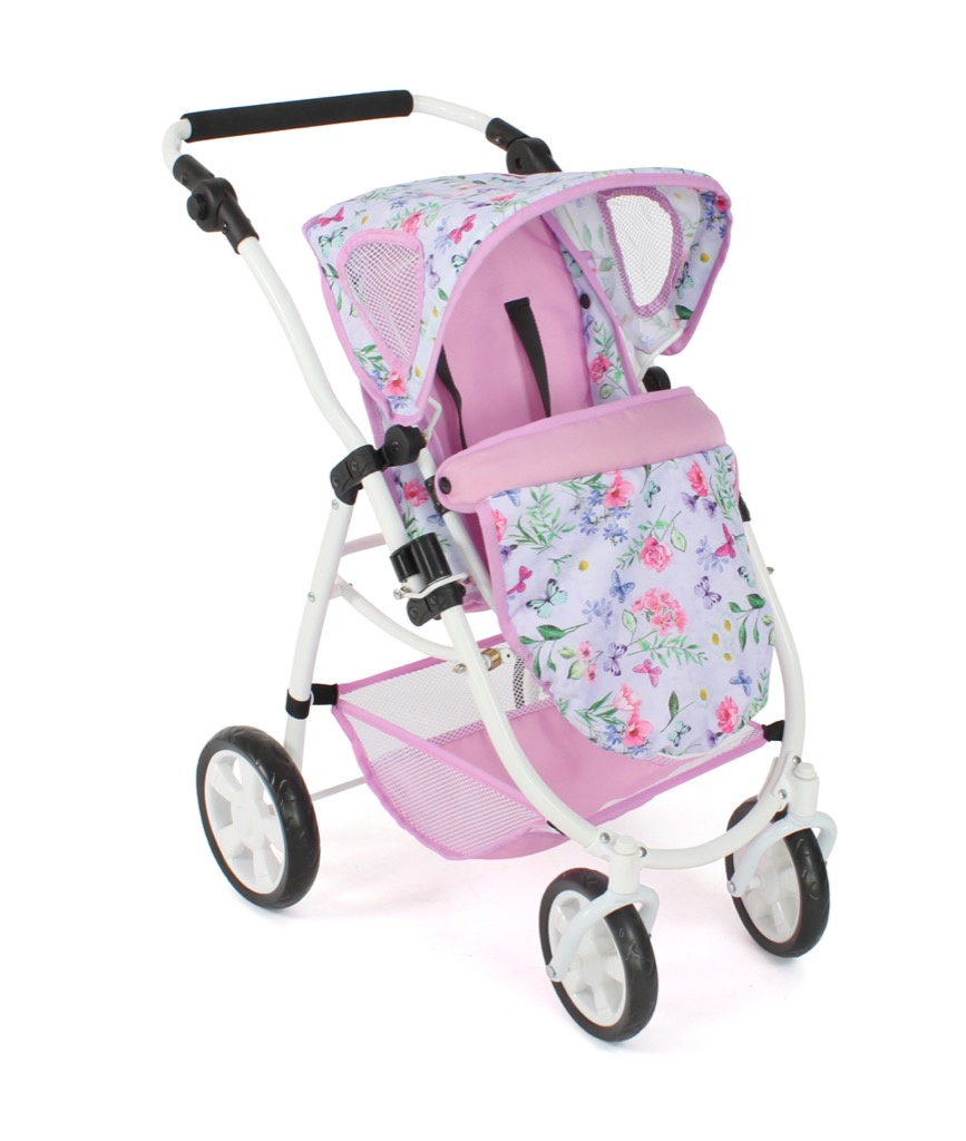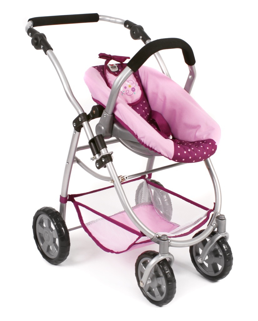 Korbičky lze složit na plocho pro transport nebo uskladnění. Sportovní korba má hrazdu a pás na upínání panenky. V hluboké korbě je slamníček. Korbička je vybavena ušima pro snadné přenášení, autosedačka je vybavena klasickým madlem, jako je to u sedaček pro dětská miminka. Přední kolečka se otáčejí kolem svislé osy. Kočárek má nastavitelnou rukojeť, samozřejmostí je síťka na drobnosti ve spodu kostry.
