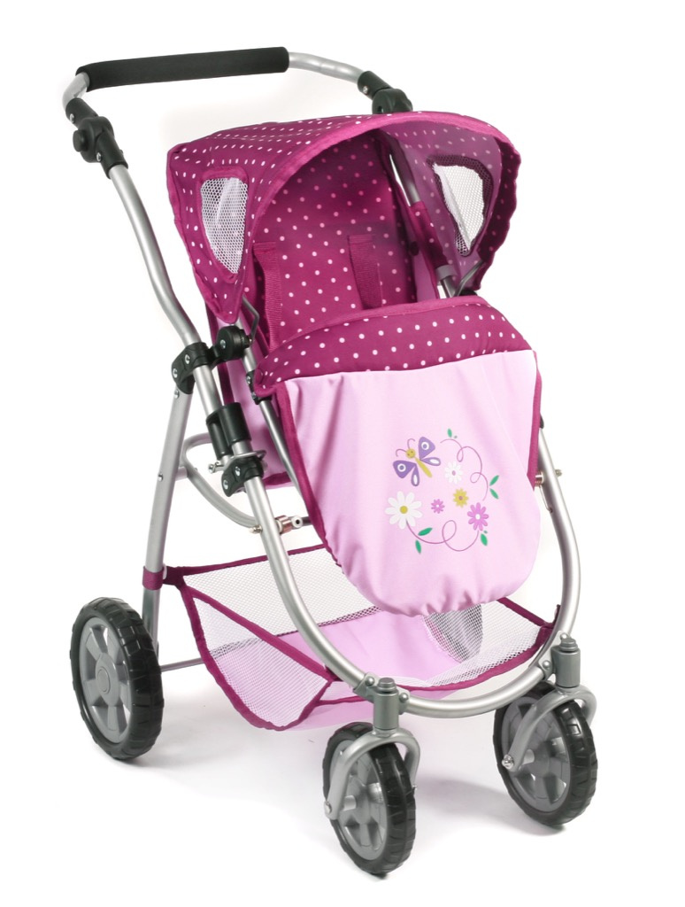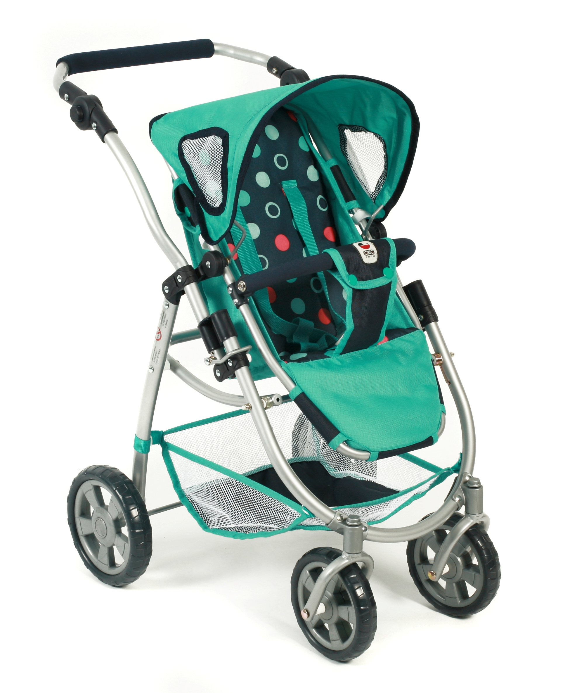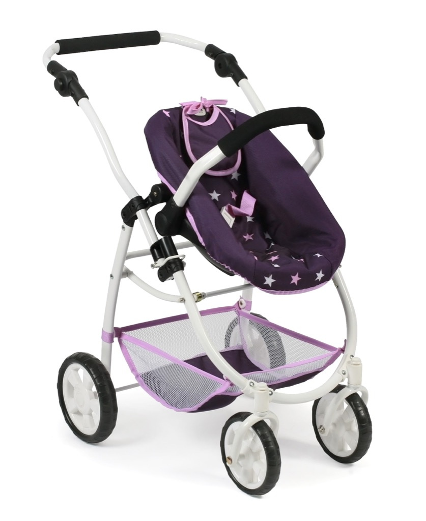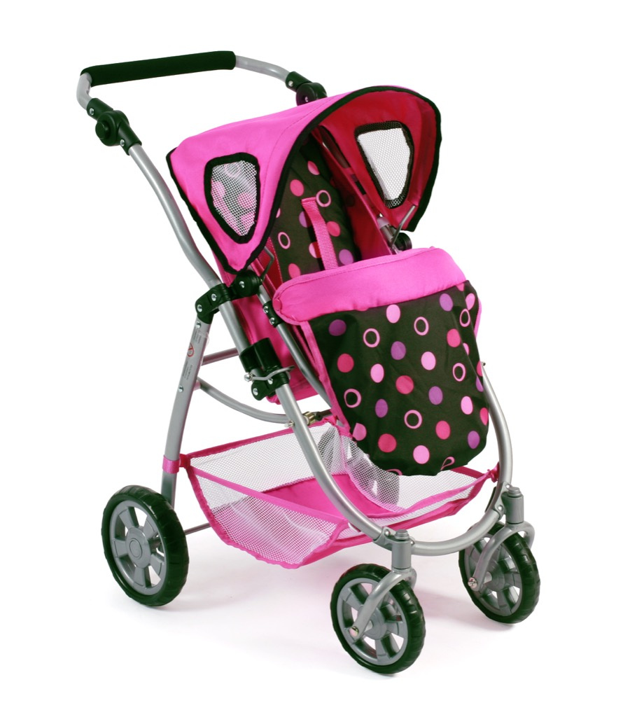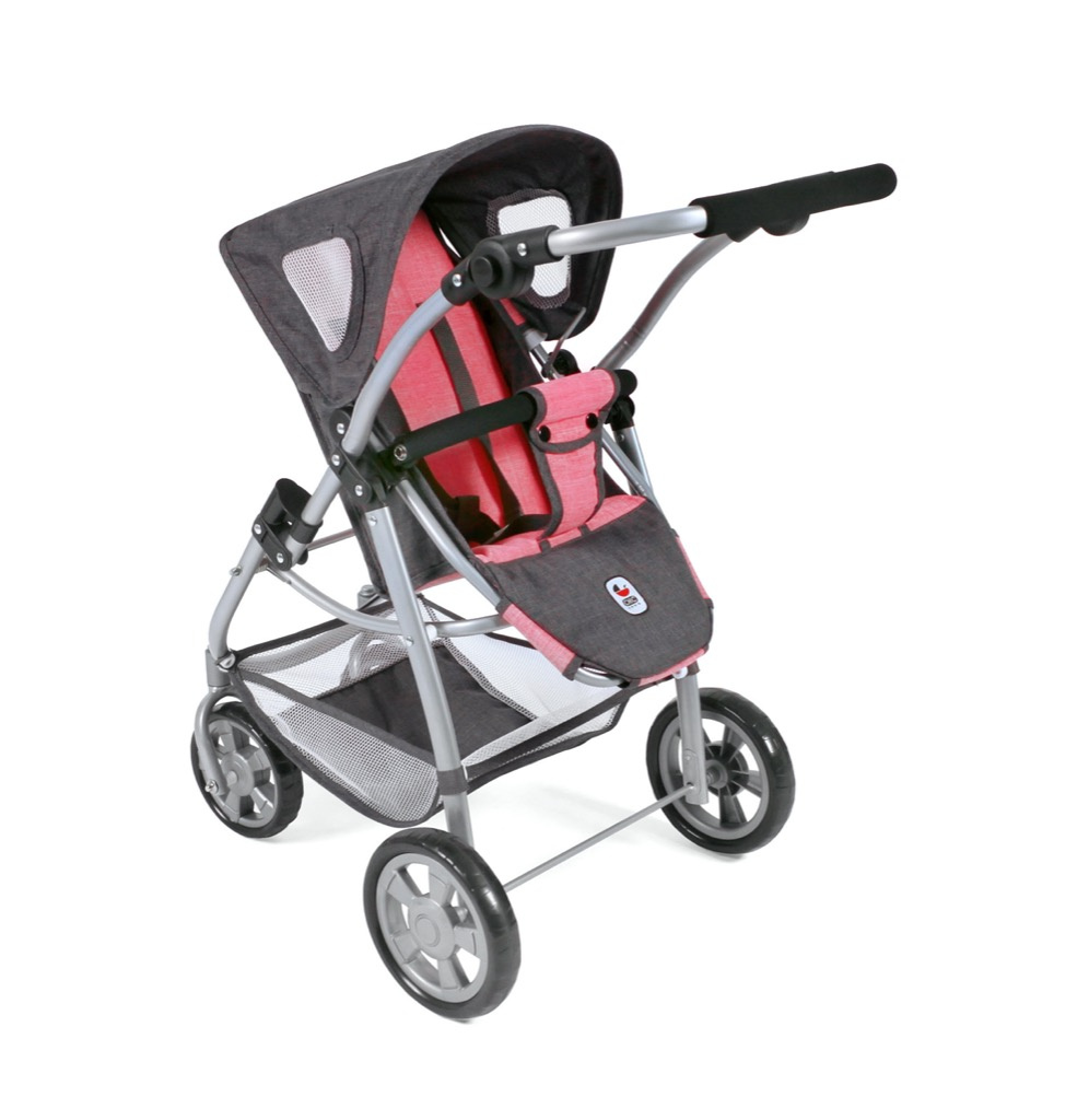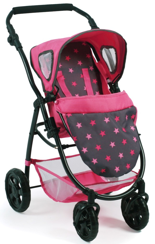 Korbičky lze složit na plocho pro transport nebo uskladnění. Sportovní korba má hrazdu a pás na upínání panenky. V hluboké korbě je slamníček. Korbička je vybavena ušima pro snadné přenášení, autosedačka je vybavena klasickým madlem, jako je to u sedaček pro dětská miminka. Přední kolečka se otáčejí kolem svislé osy. Kočárek má nastavitelnou rukojeť, samozřejmostí je síťka na drobnosti ve spodu kostry.