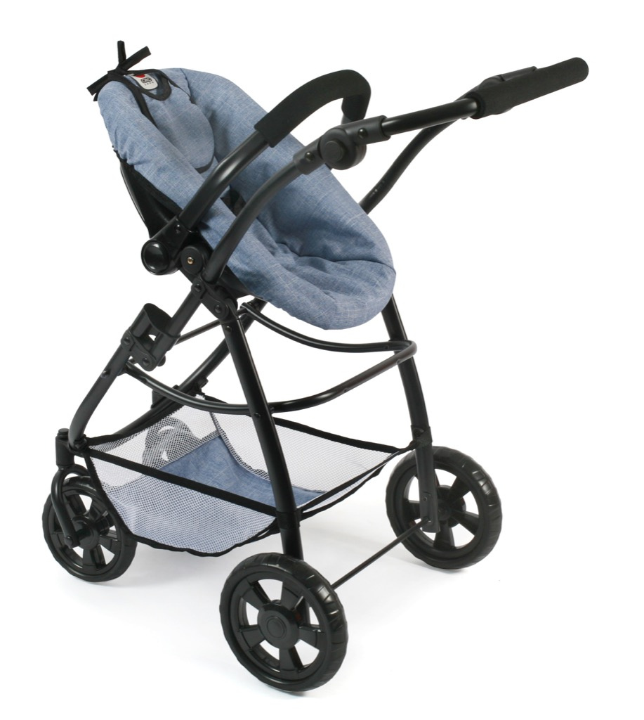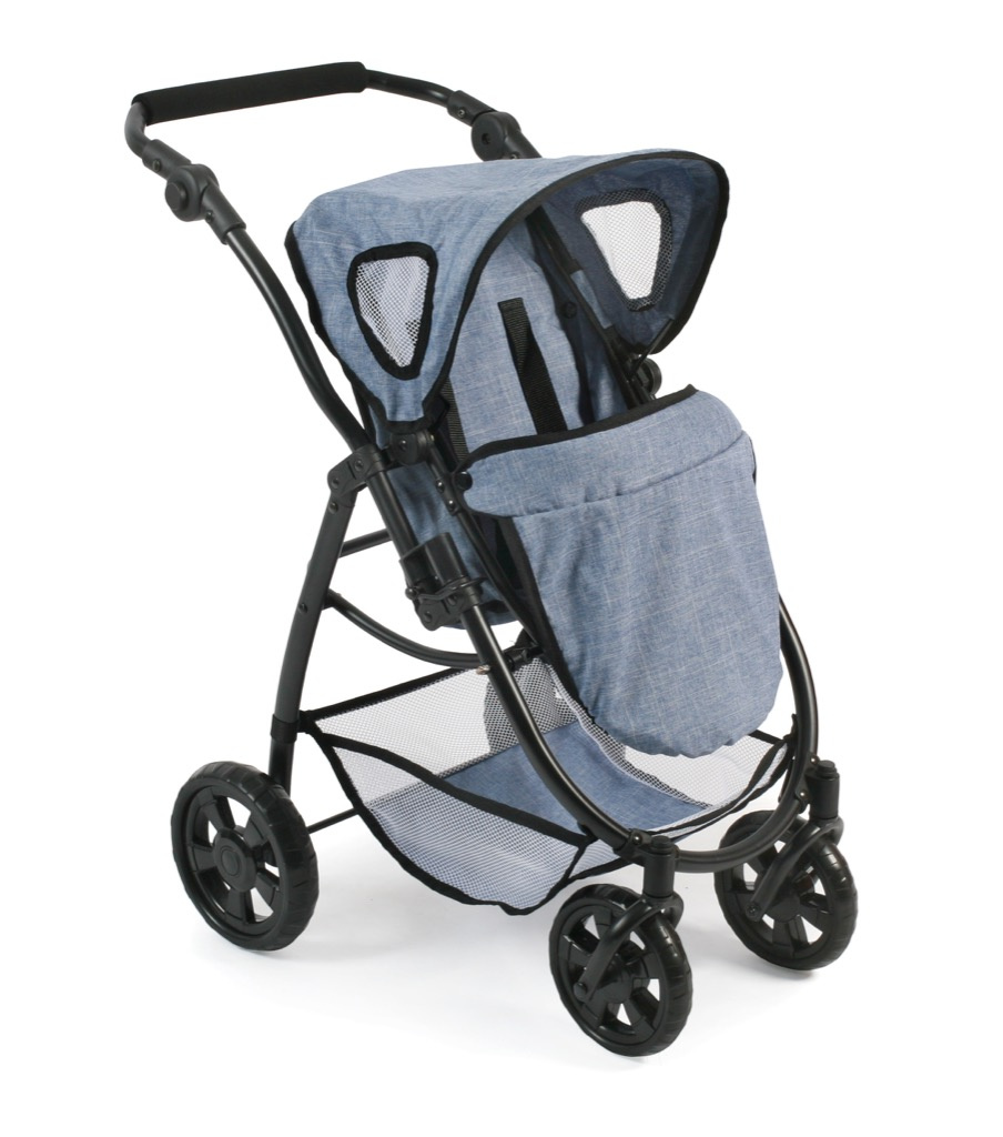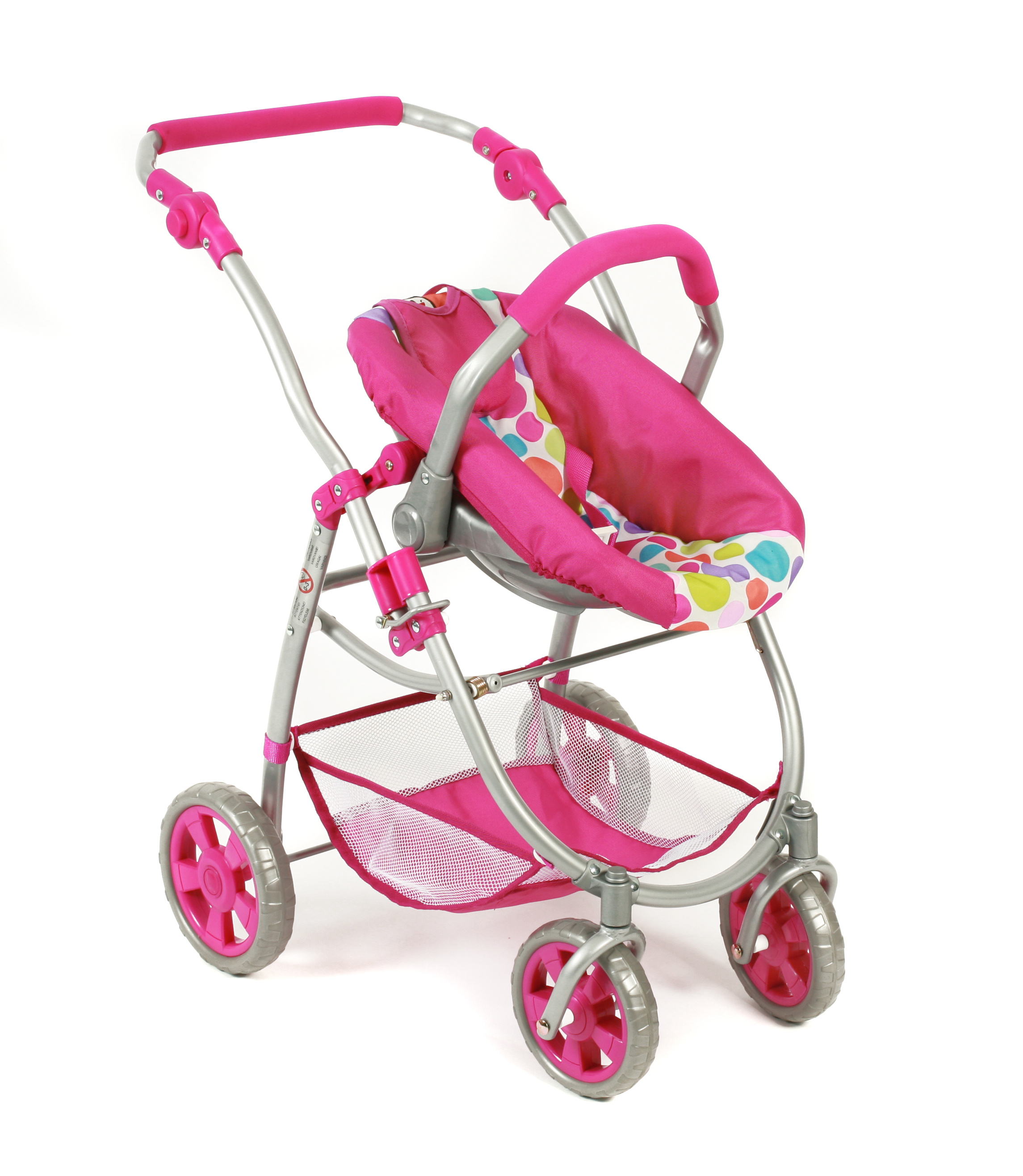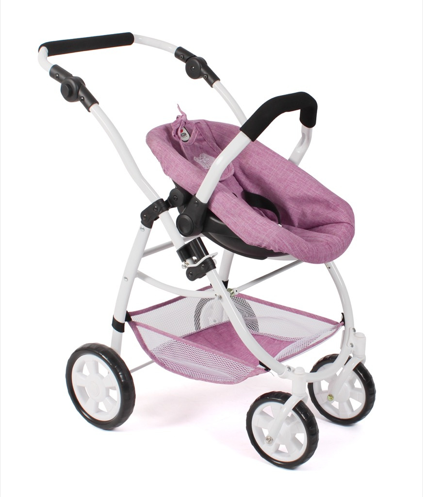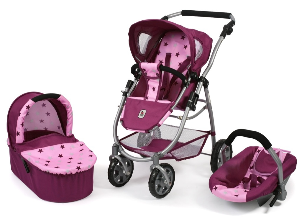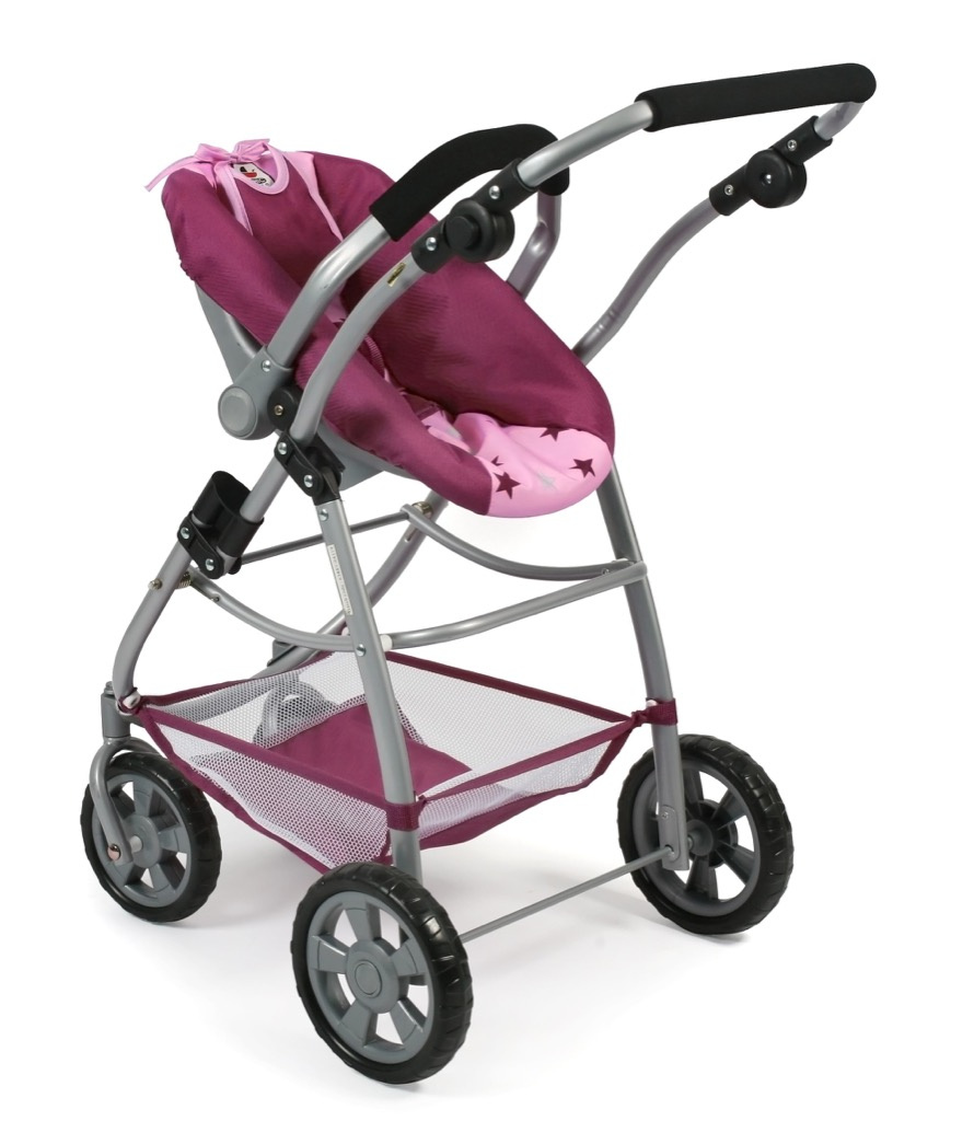 Korbičky lze složit na plocho pro transport nebo uskladnění. Sportovní korba má hrazdu a pás na upínání panenky. V hluboké korbě je slamníček. Korbička je vybavena ušima pro snadné přenášení, autosedačka je vybavena klasickým madlem, jako je to u sedaček pro dětská miminka. Přední kolečka se otáčejí kolem svislé osy. Kočárek má nastavitelnou rukojeť, samozřejmostí je síťka na drobnosti ve spodu kostry.