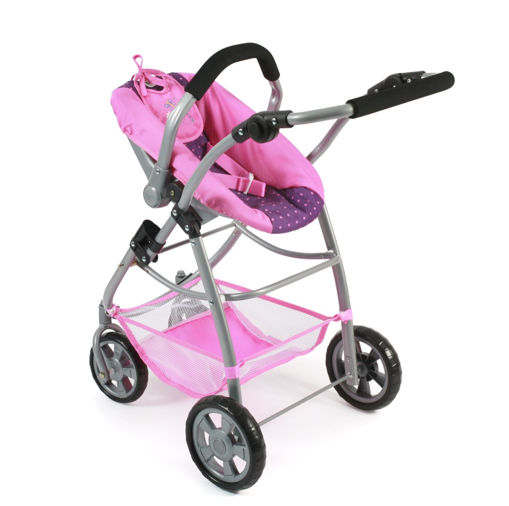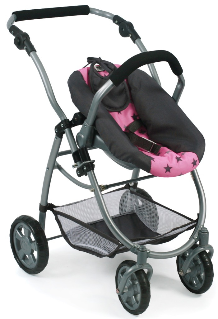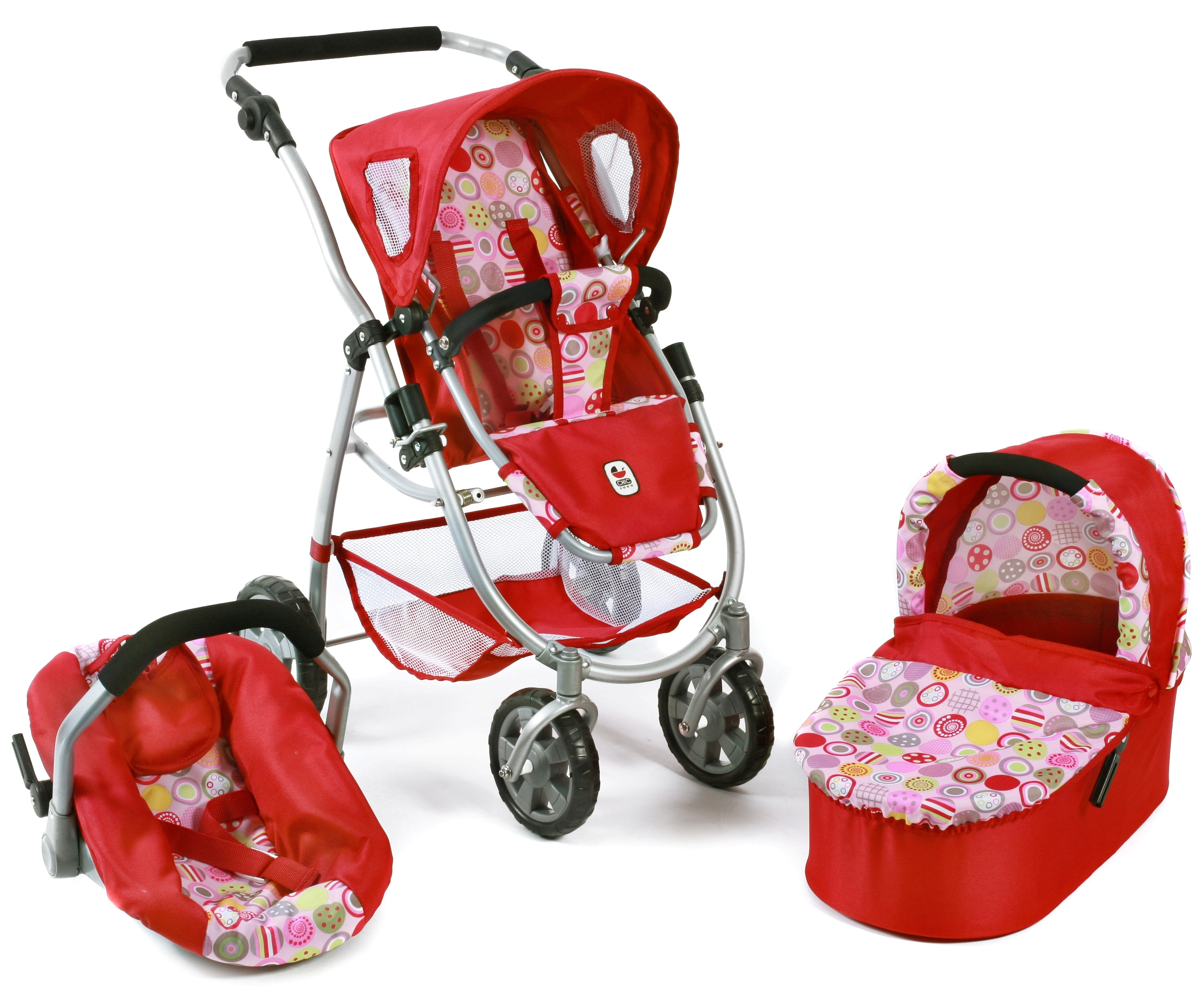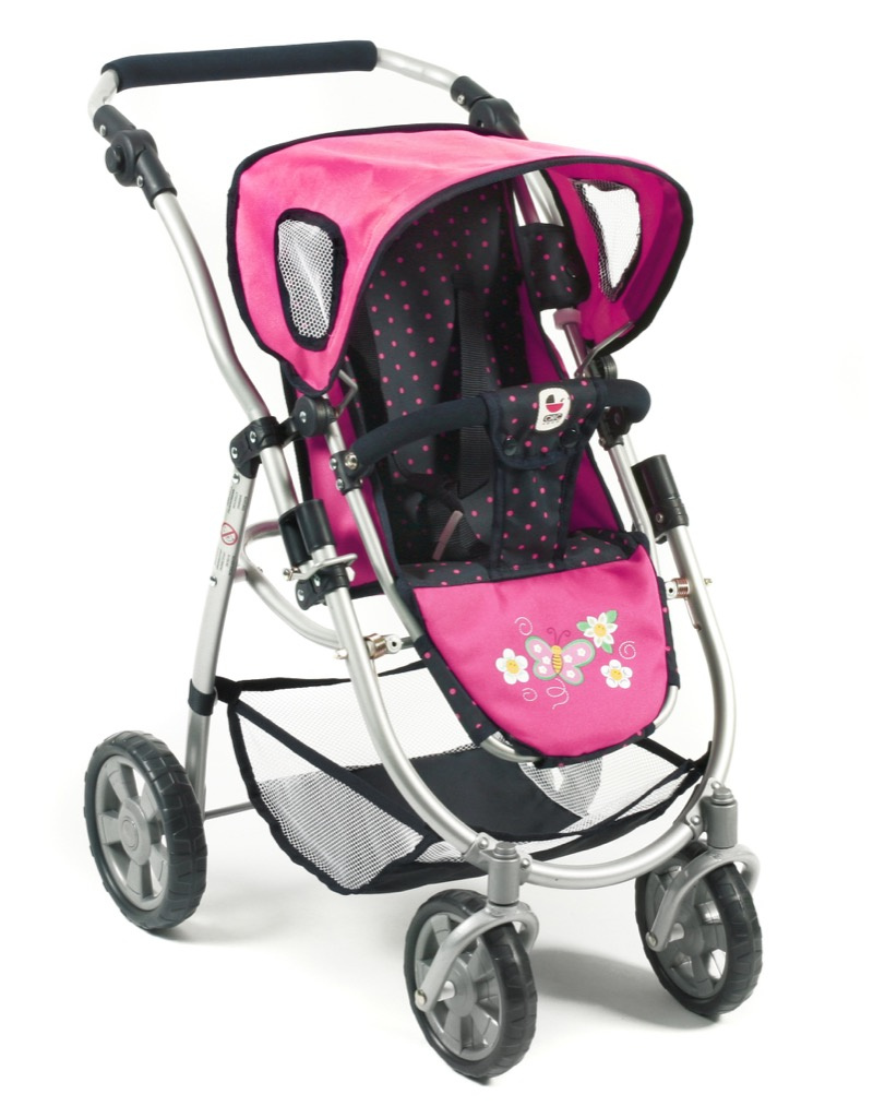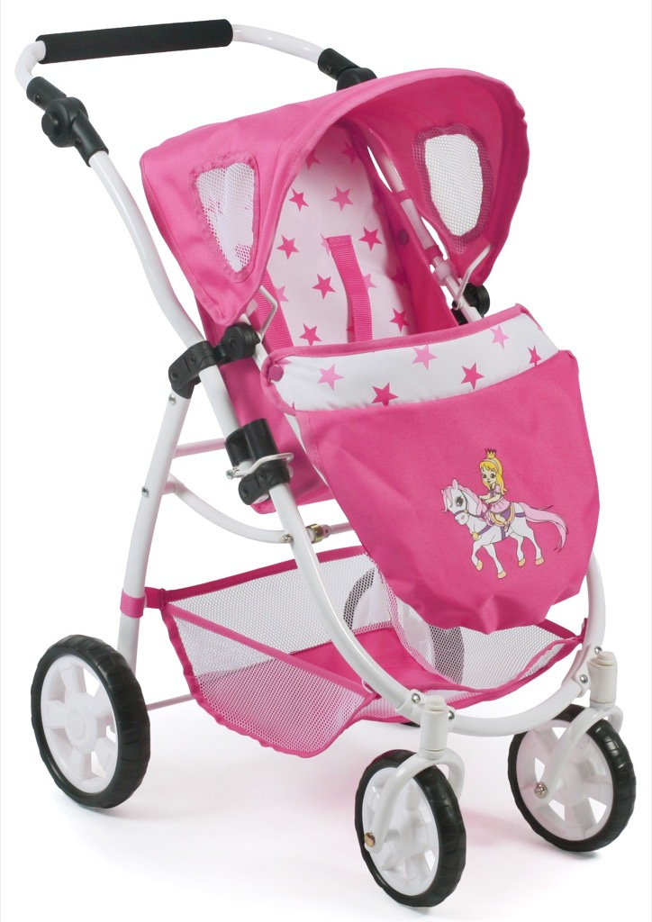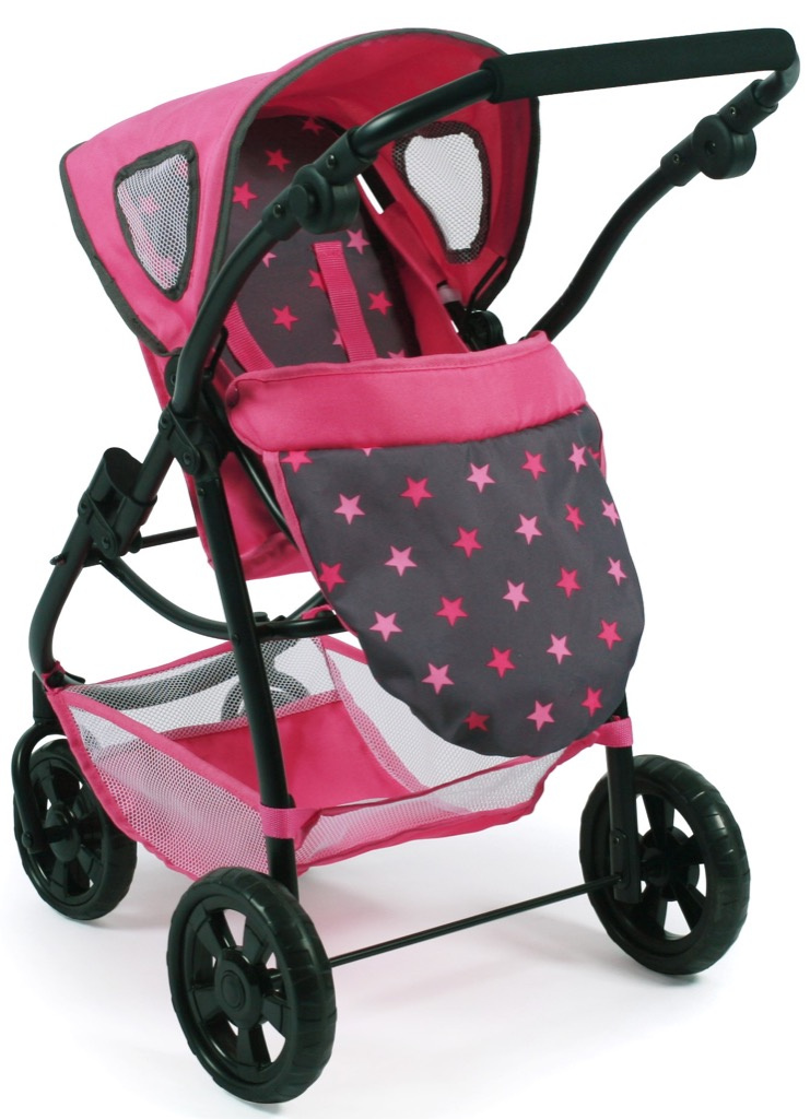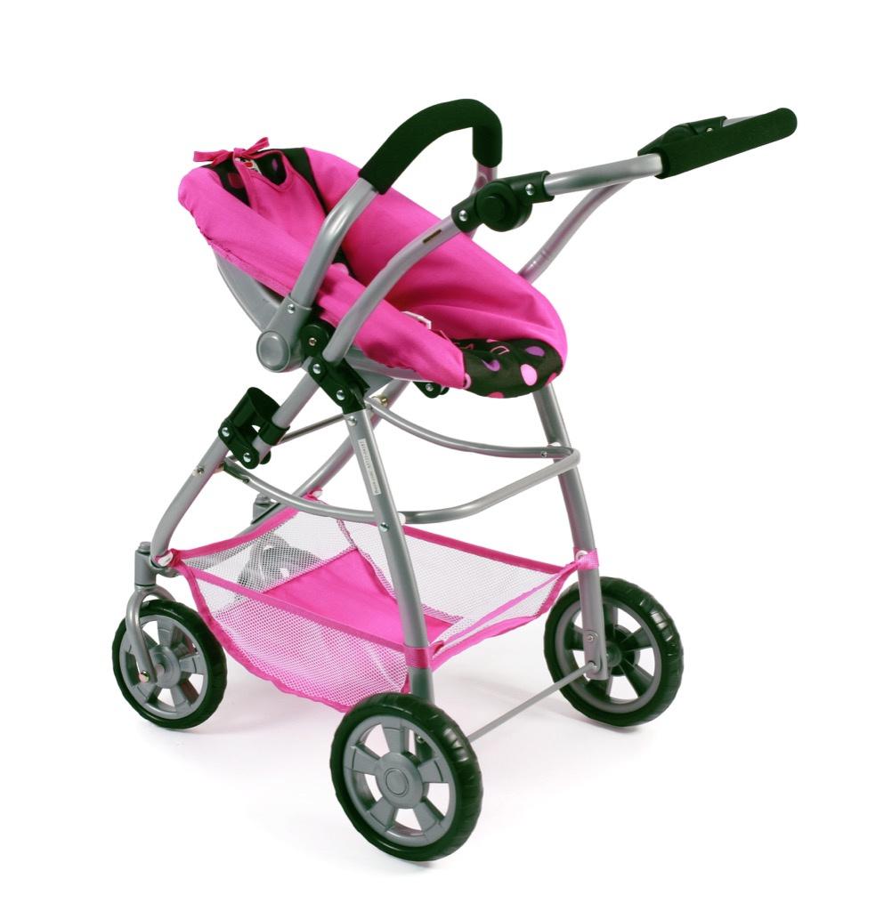 Korbičky lze složit na plocho pro transport nebo uskladnění. Sportovní korba má hrazdu a pás na upínání panenky. V hluboké korbě je slamníček. Korbička je vybavena ušima pro snadné přenášení, autosedačka je vybavena klasickým madlem, jako je to u sedaček pro dětská miminka. Přední kolečka se otáčejí kolem svislé osy. Kočárek má nastavitelnou rukojeť, samozřejmostí je síťka na drobnosti ve spodu kostry.