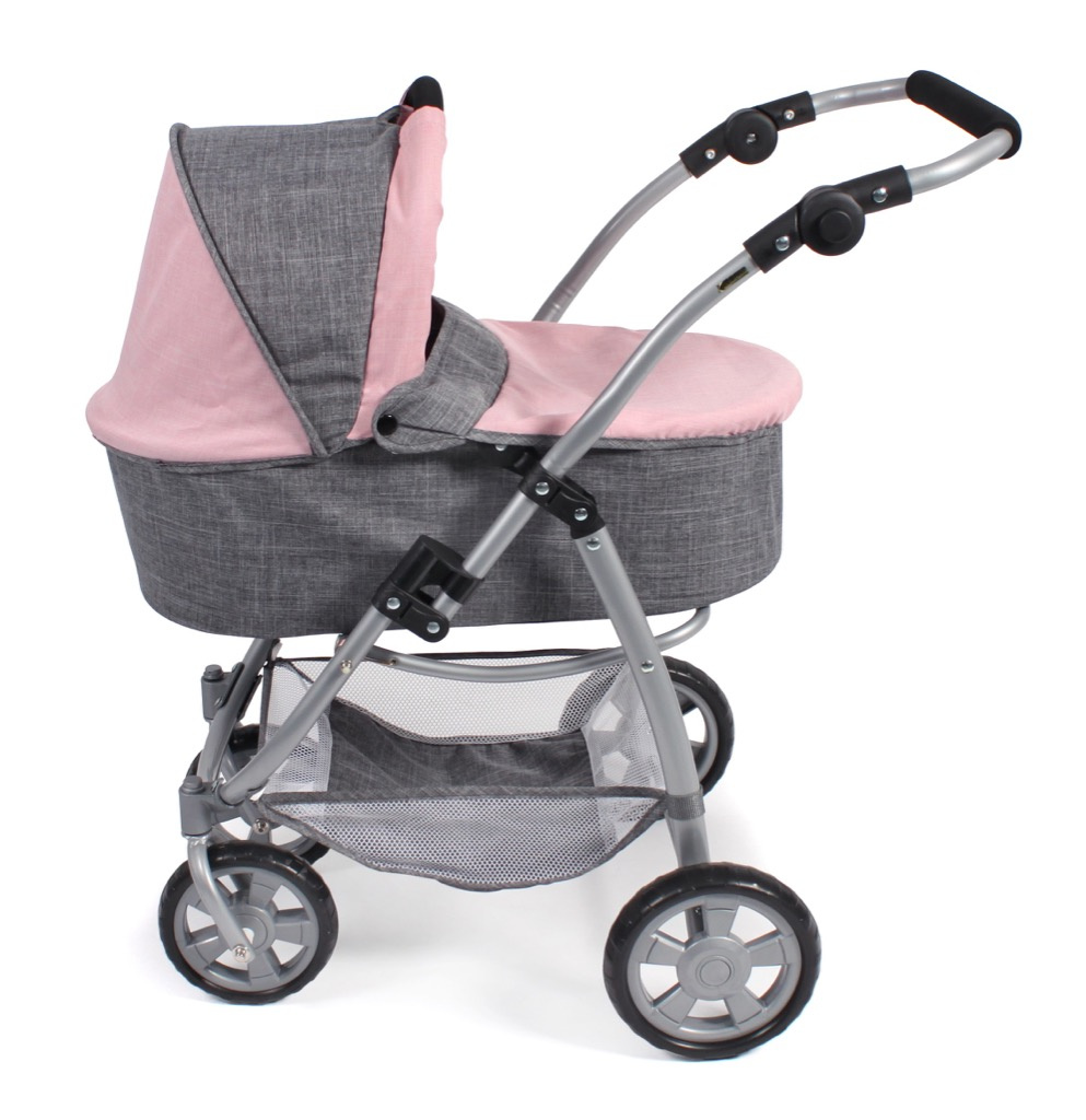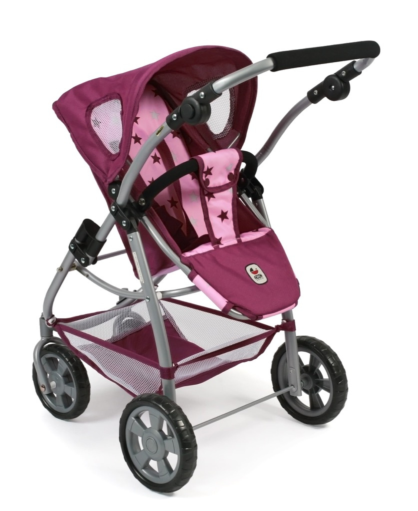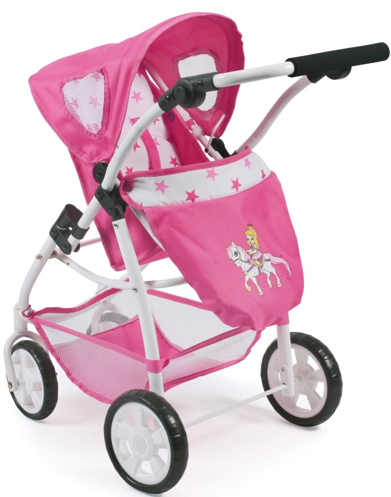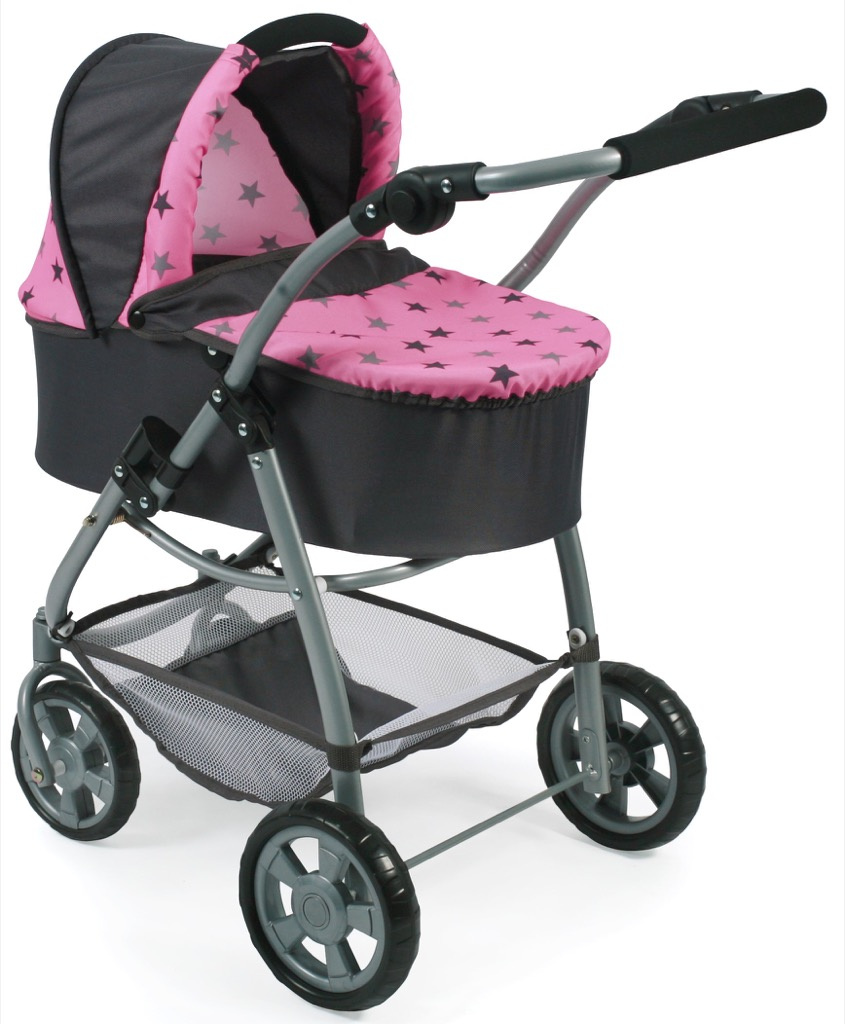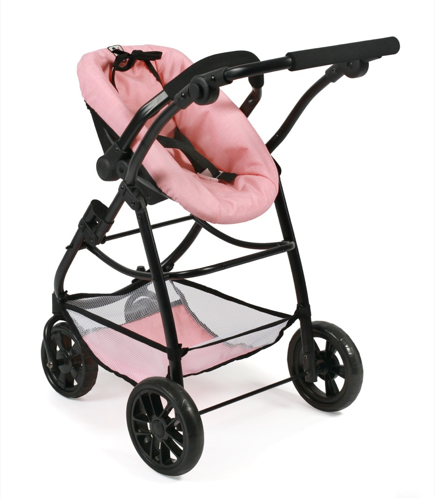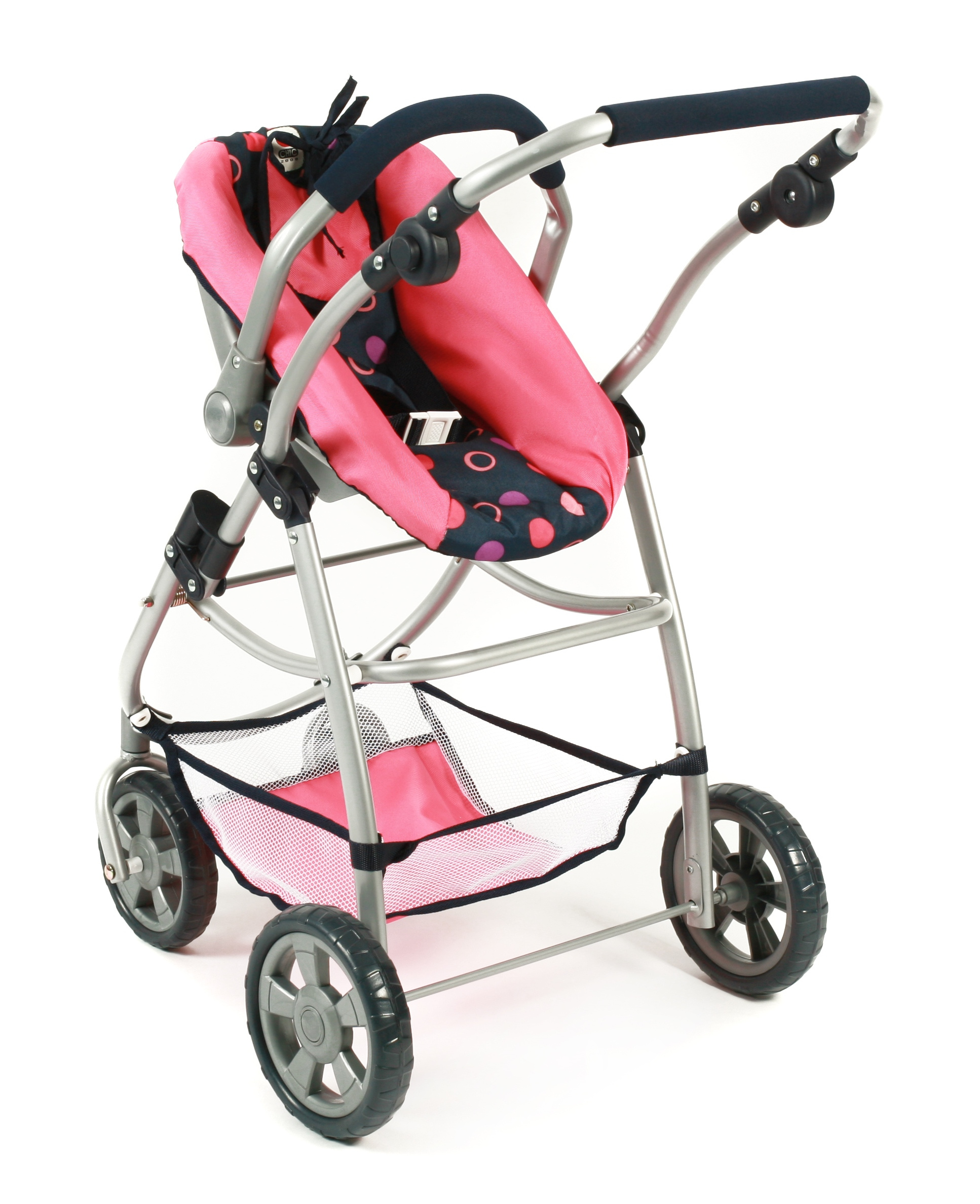Korbičky lze složit na plocho pro transport nebo uskladnění. Sportovní korba má hrazdu a pás na upínání panenky. V hluboké korbě je slamníček. Korbička je vybavena ušima pro snadné přenášení, autosedačka je vybavena klasickým madlem, jako je to u sedaček pro dětská miminka. Přední kolečka se otáčejí kolem svislé osy. Kočárek má nastavitelnou rukojeť, samozřejmostí je síťka na drobnosti ve spodu kostry.