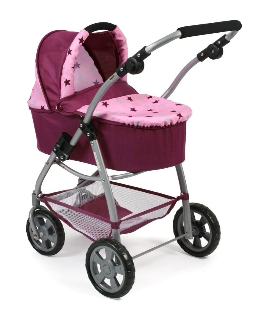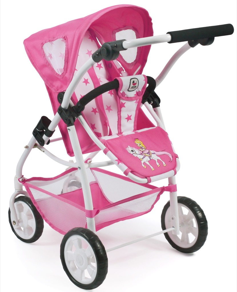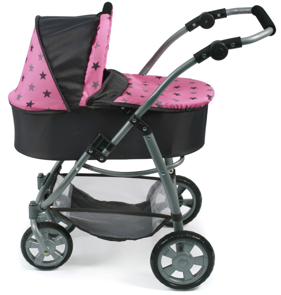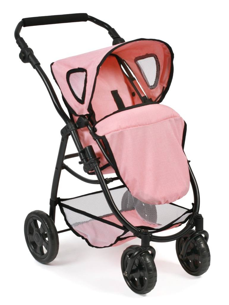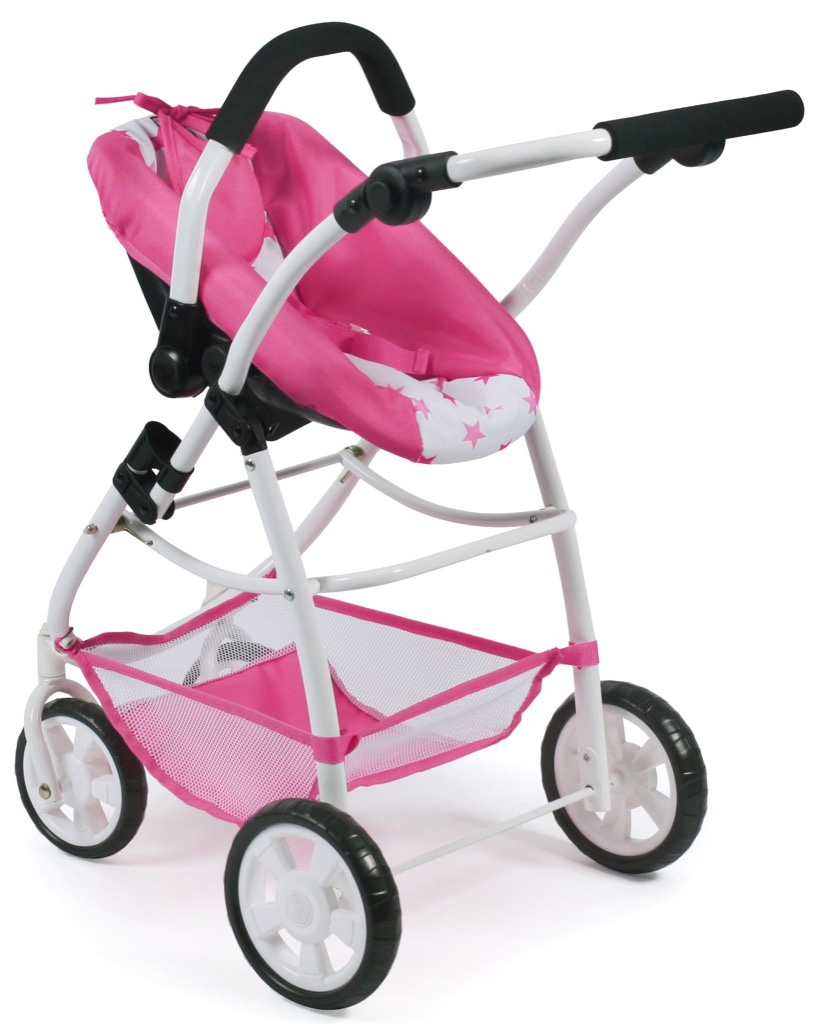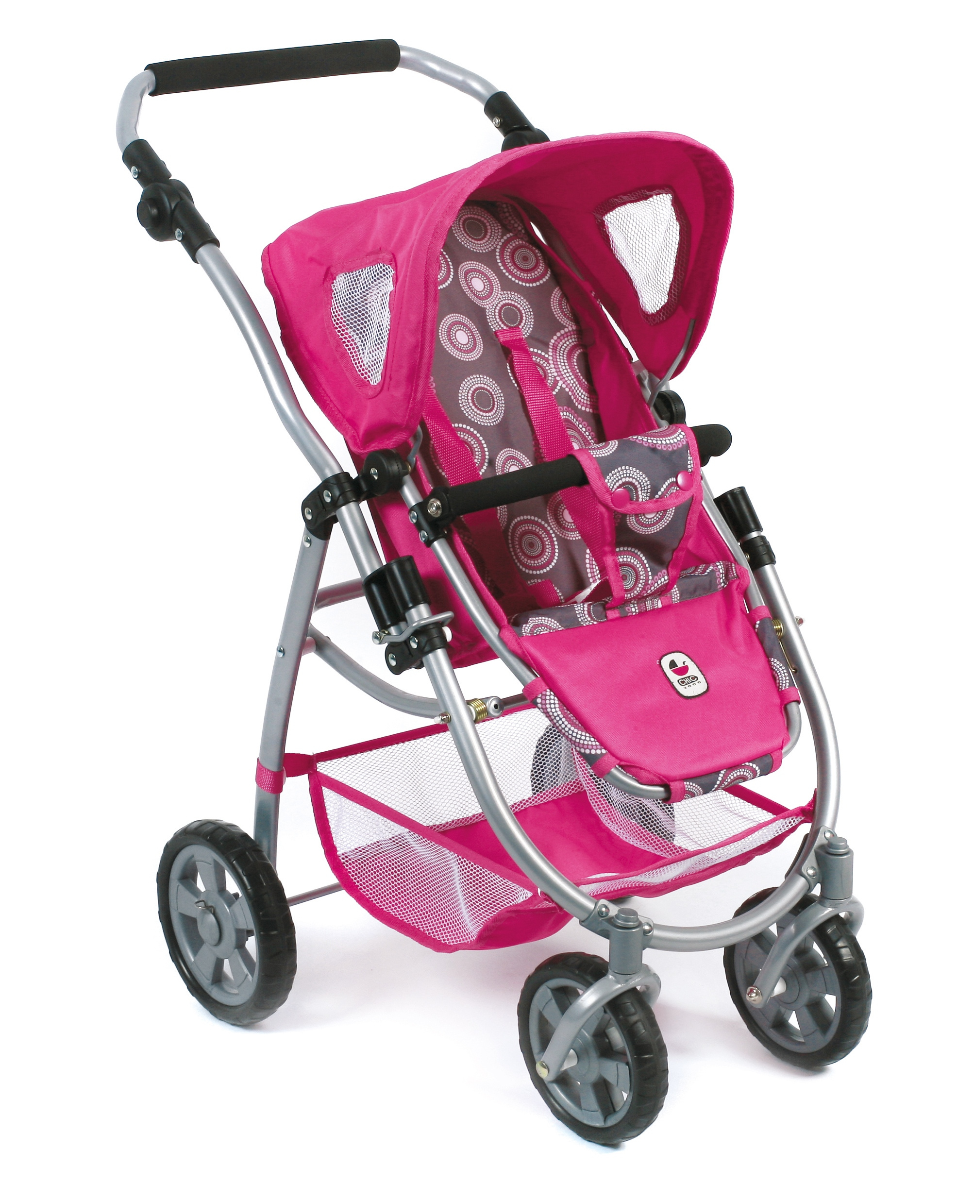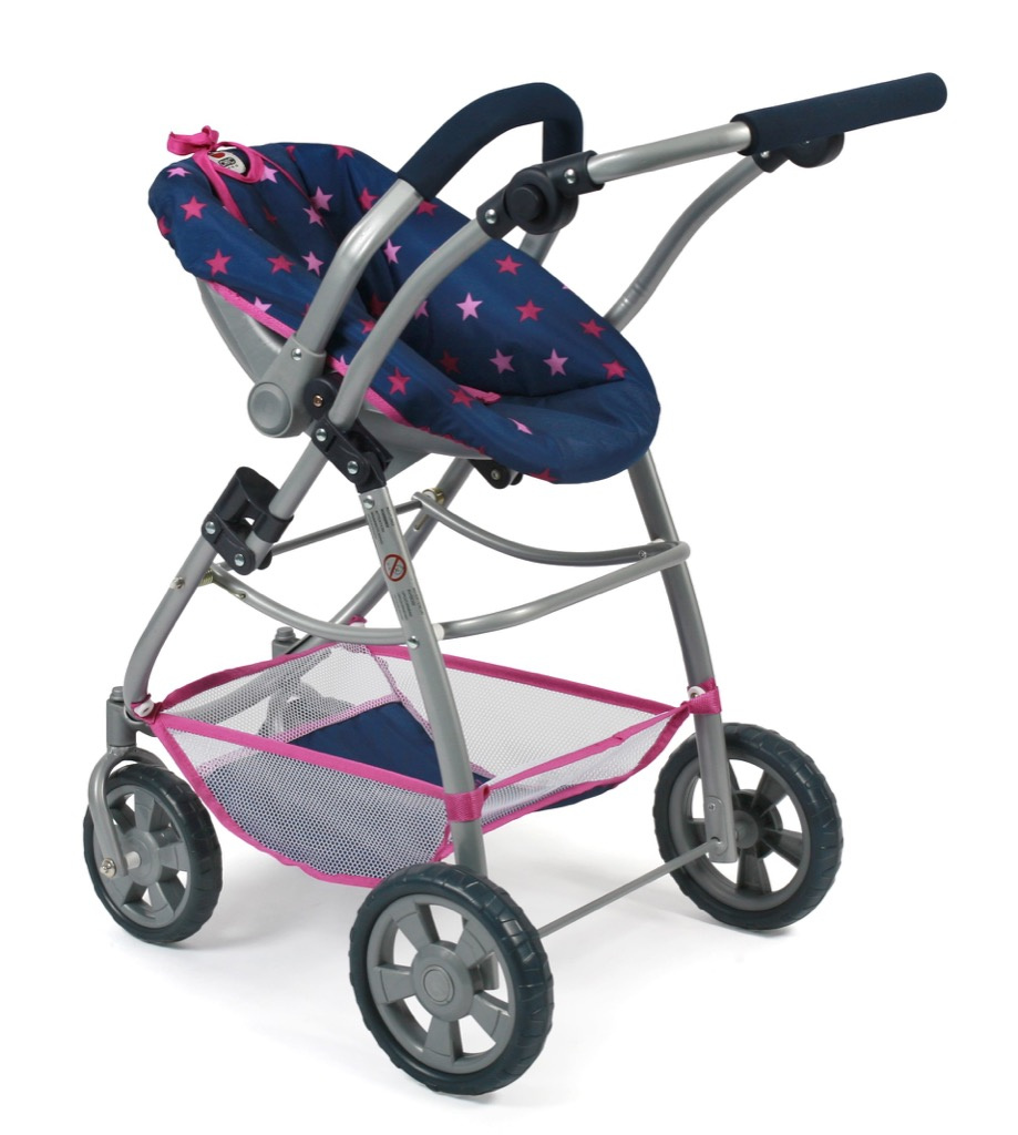 Korbičky lze složit na plocho pro transport nebo uskladnění. Sportovní korba má hrazdu a pás na upínání panenky. V hluboké korbě je slamníček. Korbička je vybavena ušima pro snadné přenášení, autosedačka je vybavena klasickým madlem, jako je to u sedaček pro dětská miminka. Přední kolečka se otáčejí kolem svislé osy. Kočárek má nastavitelnou rukojeť, samozřejmostí je síťka na drobnosti ve spodu kostry.