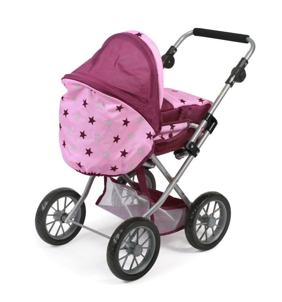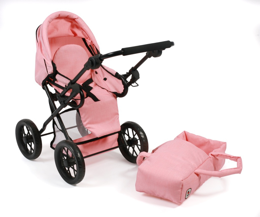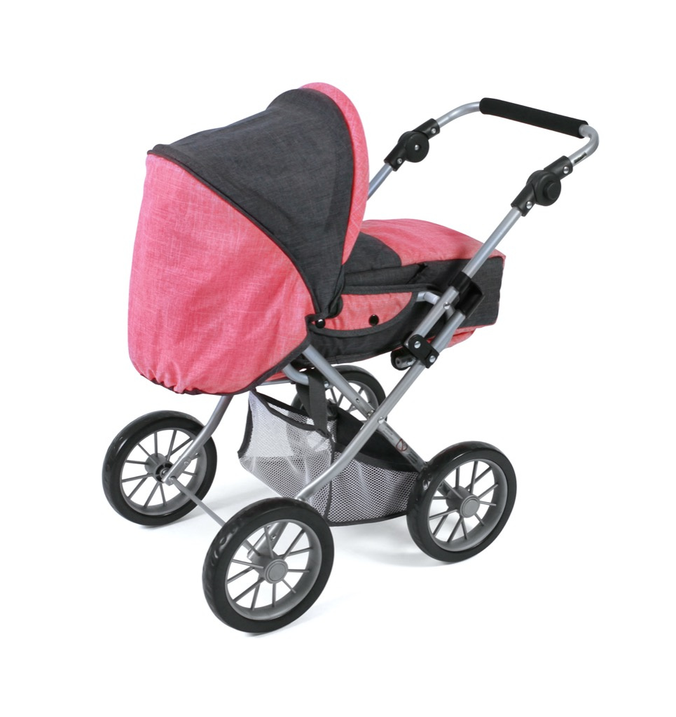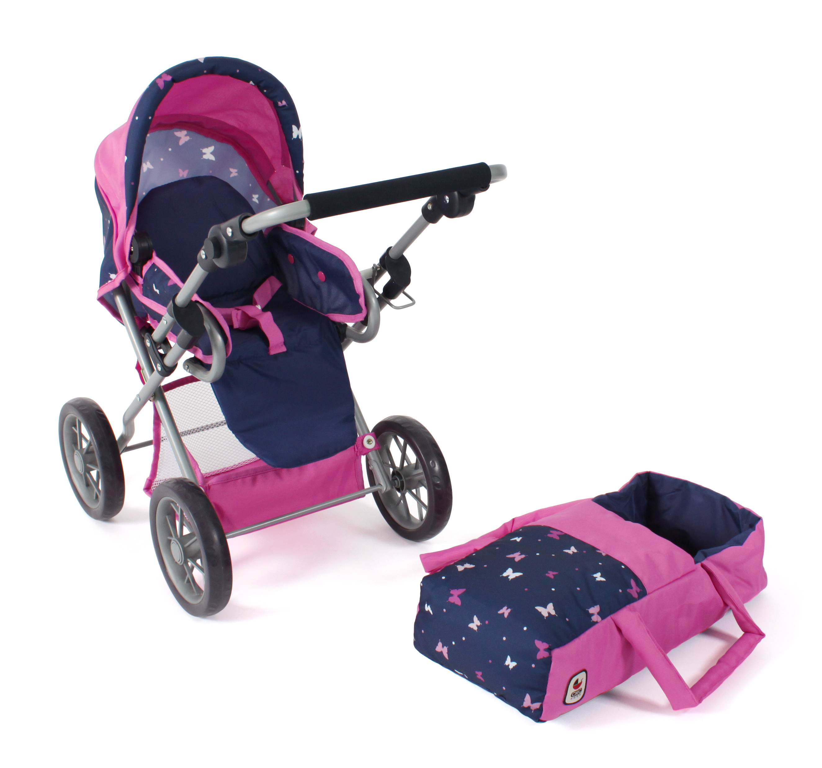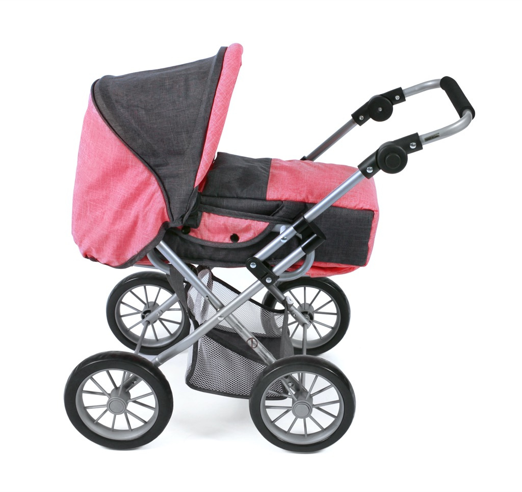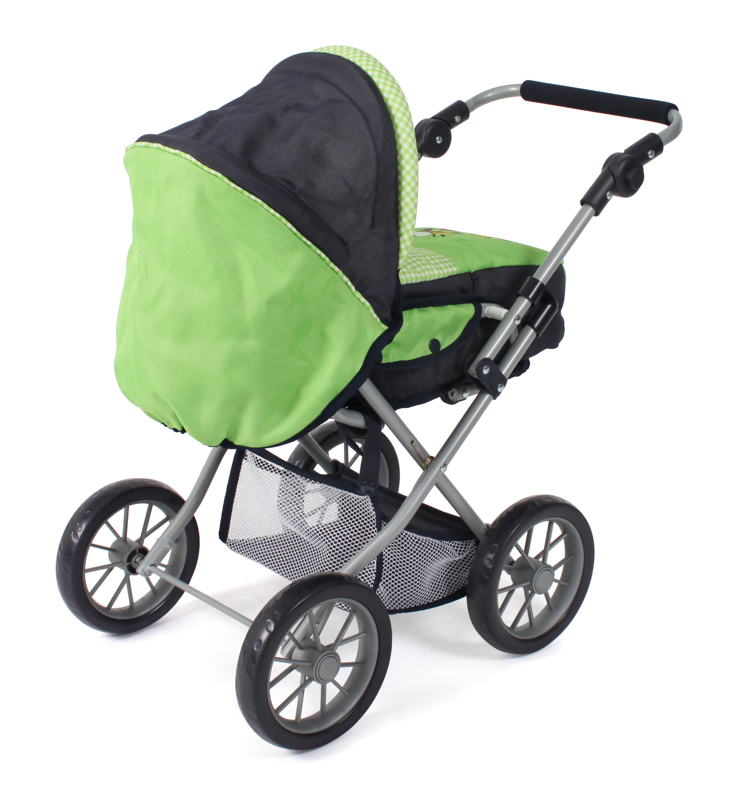 | Kombinovaný kočárek pro panenky - trojkombinace. Kočárek má nastavitelnou rukojeť. Vyjímatelnou tašku, která je součástí kočárku, je možné použít i samostatně jako tašku na panenku. Boudička je sklápěcí, a taktéž opěradlo kočárku. Kočárek má vespod konstrukce košík pro uložení drobností. Ke kočárku se dá koupit přebalovací taška na rukojeť ve stejné barvě. Vyrobeno německou firmou BAYER CHIC. výška 68cm šířka 37cm délka 64cm |