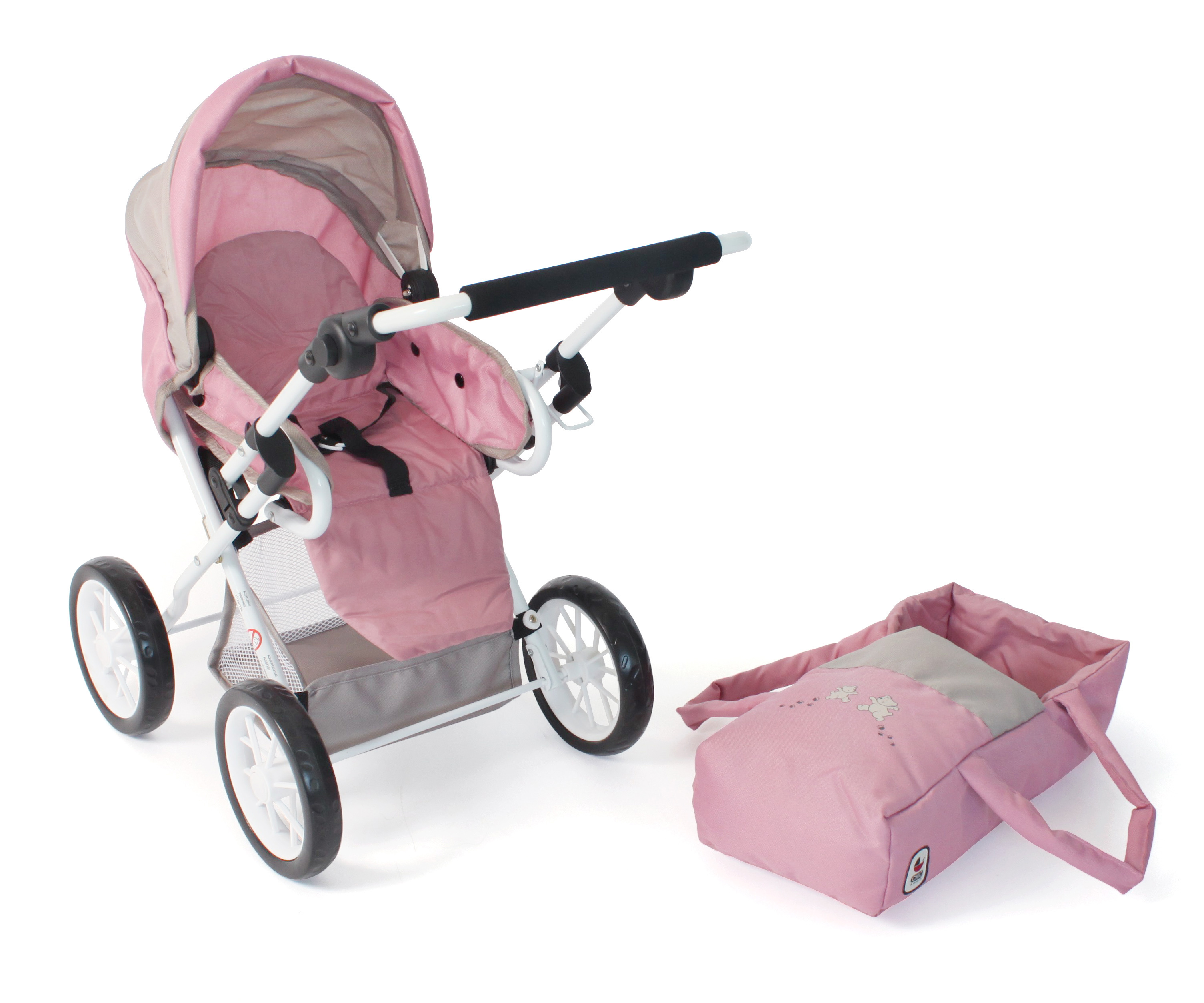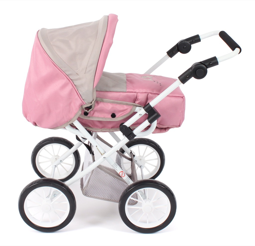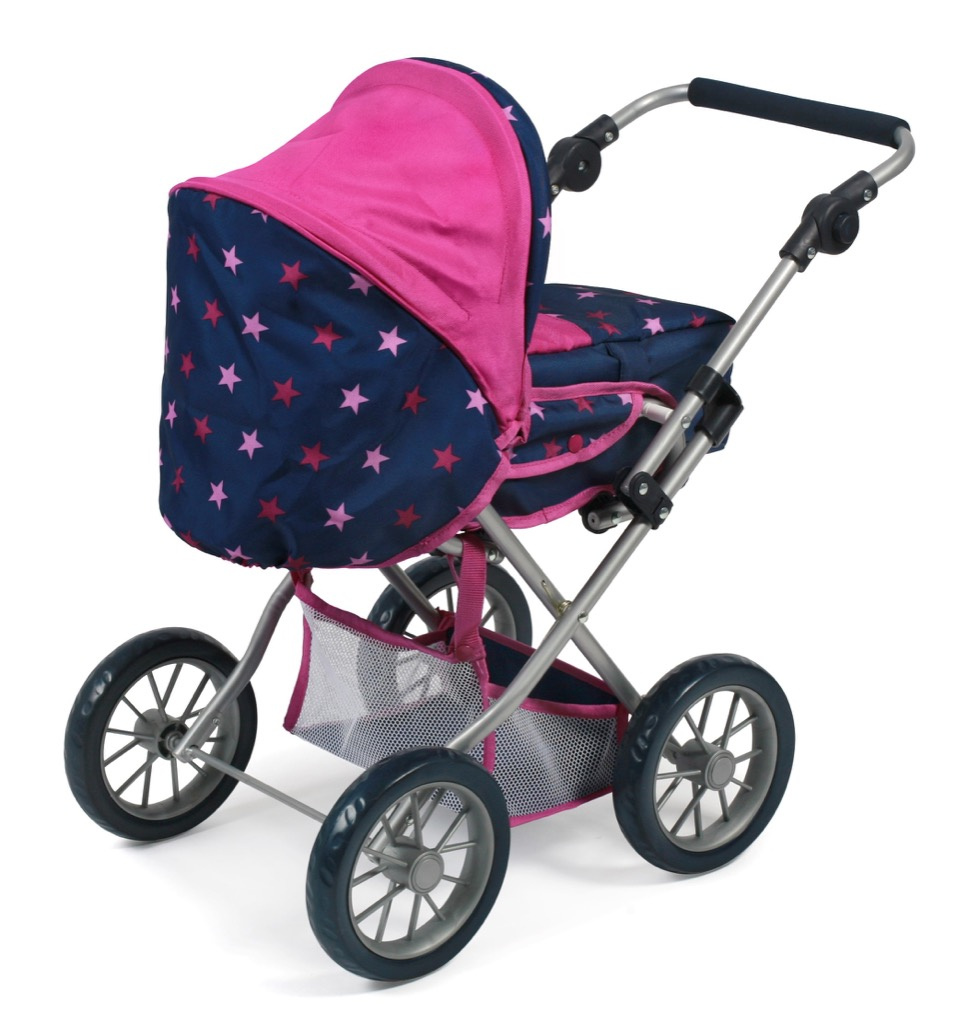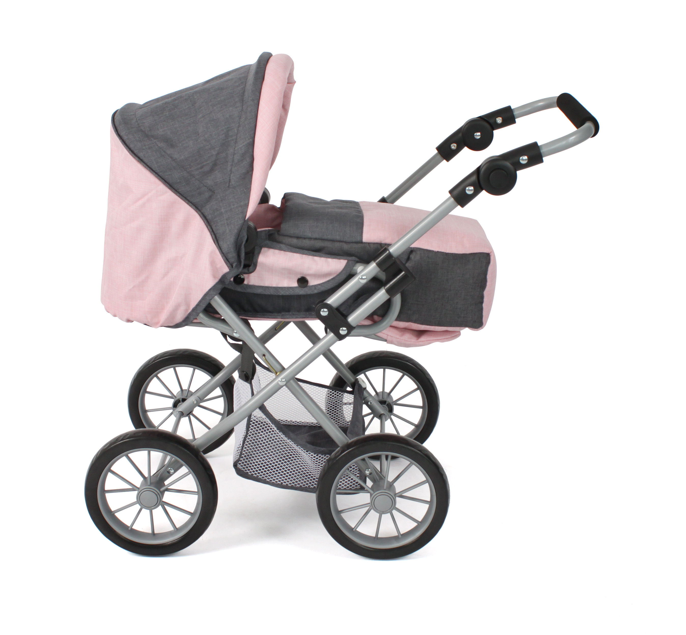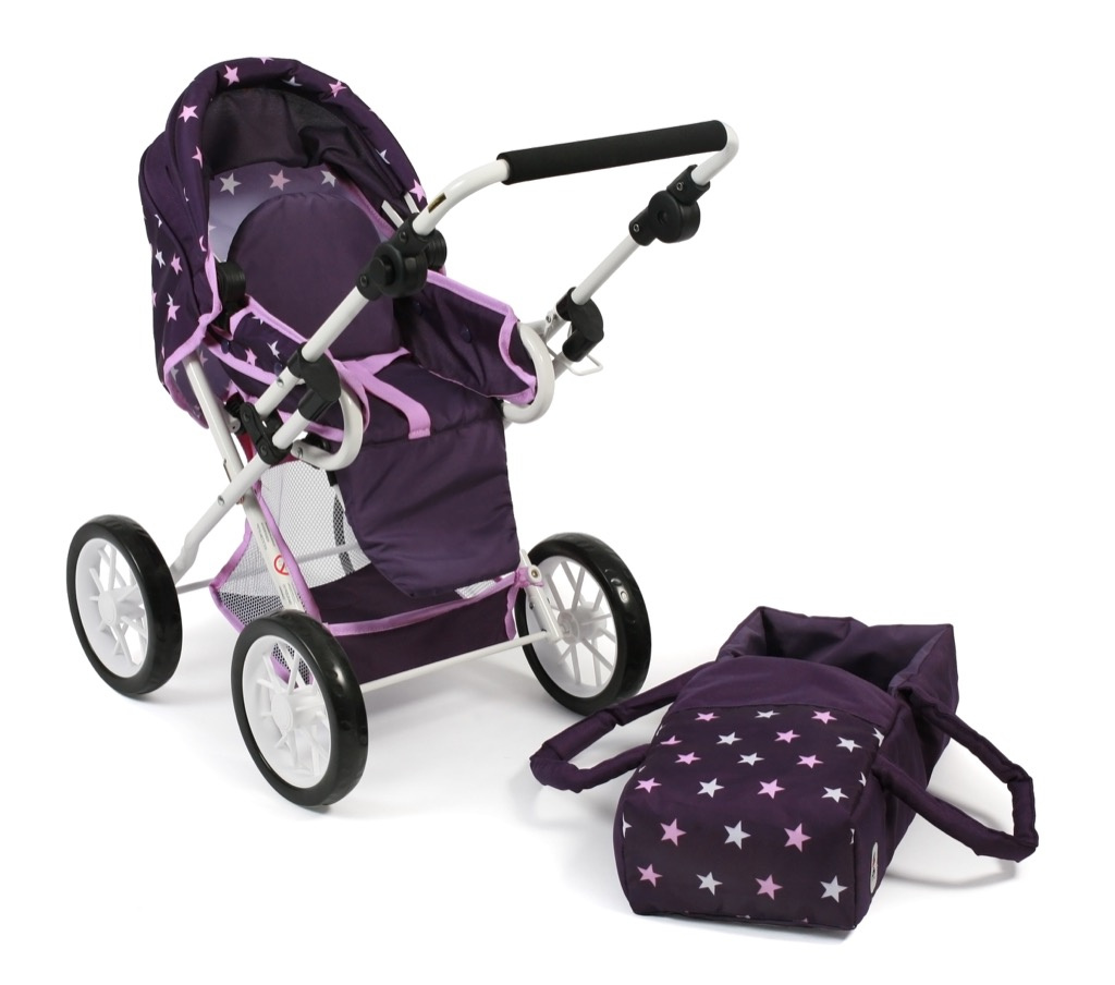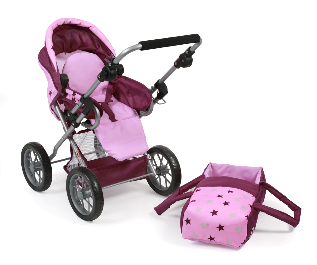| Kombinovaný kočárek pro panenky - trojkombinace. Kočárek má nastavitelnou rukojeť. Vyjímatelnou tašku, která je součástí kočárku, je možné použít i samostatně jako tašku na panenku. Boudička je sklápěcí, a taktéž opěradlo kočárku. Kočárek má vespod konstrukce košík pro uložení drobností. Ke kočárku se dá koupit přebalovací taška na rukojeť ve stejné barvě. Vyrobeno německou firmou BAYER CHIC. výška 68cm šířka 37cm délka 64cm |