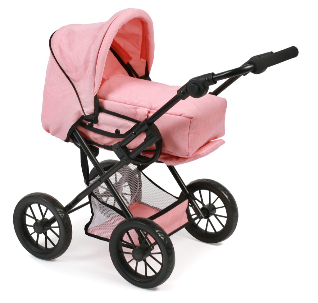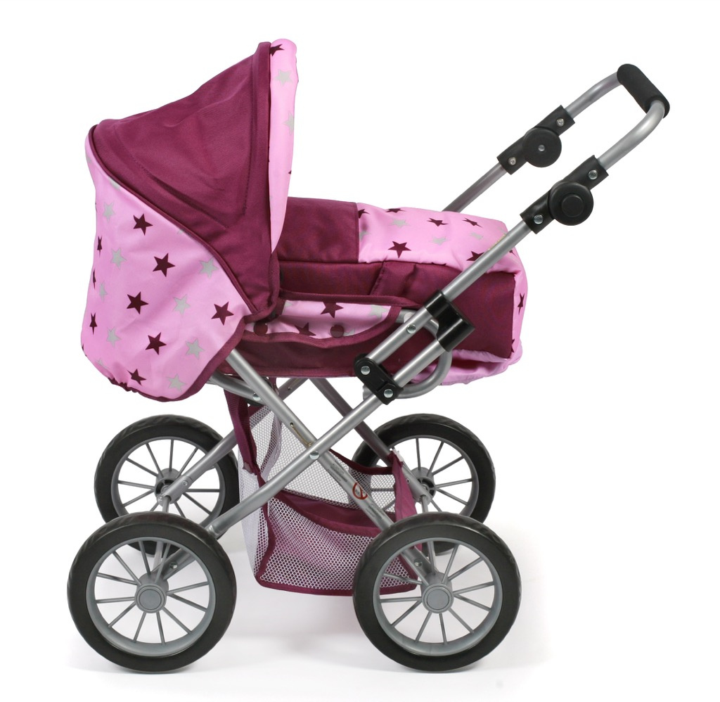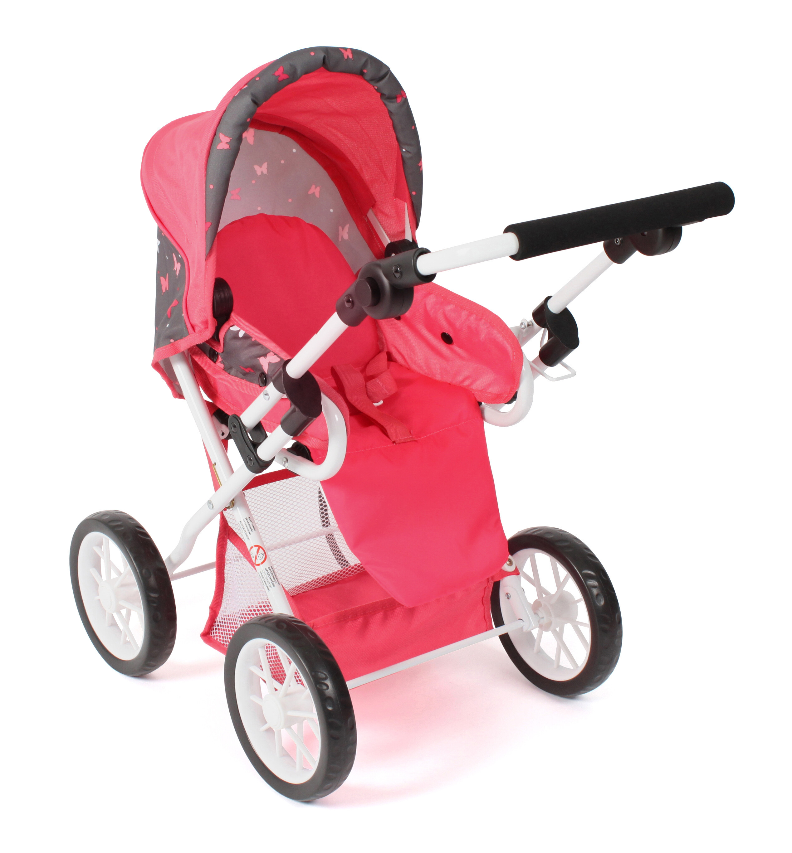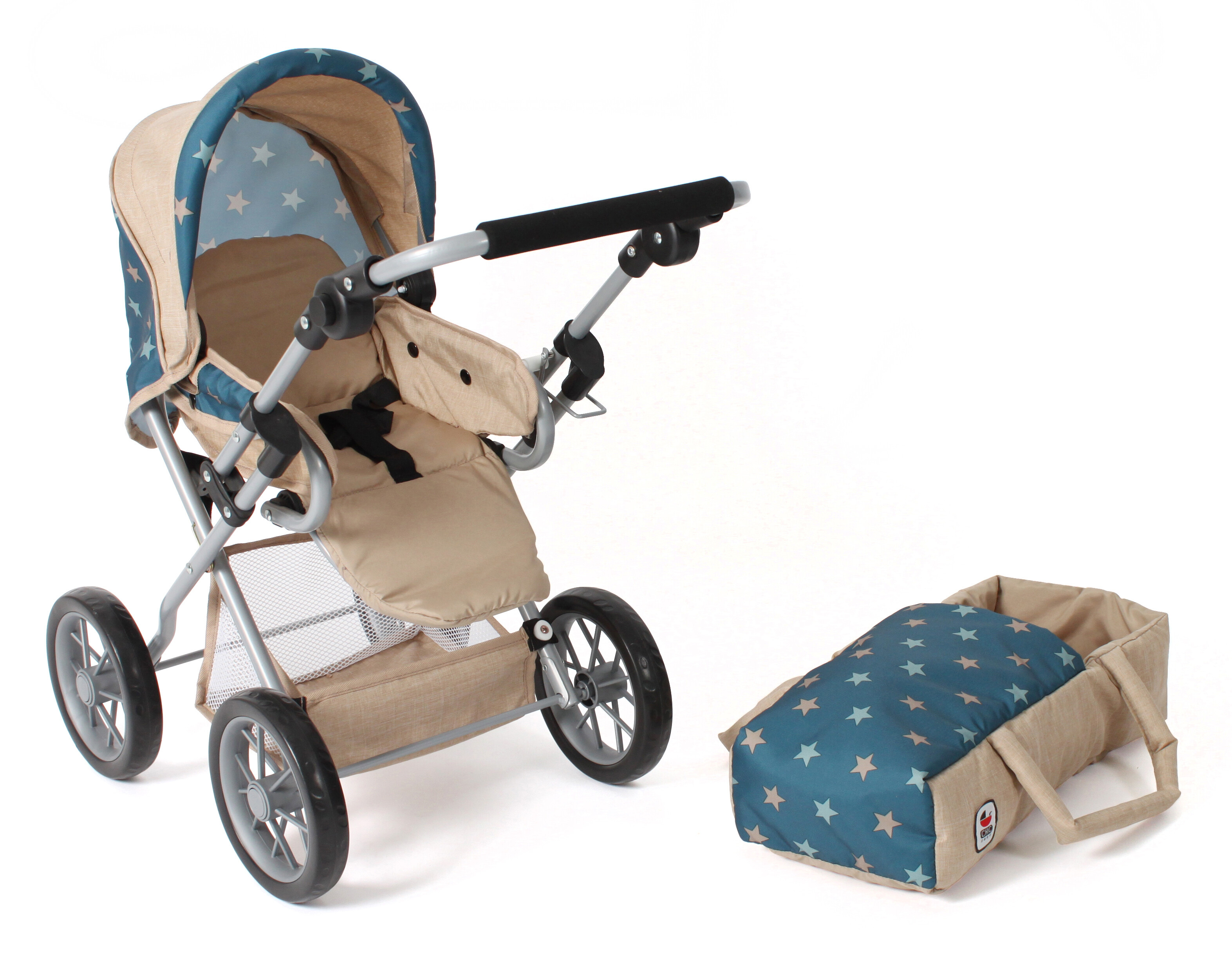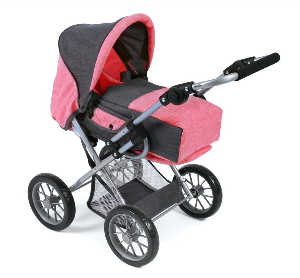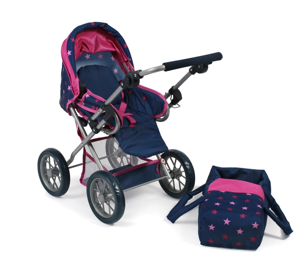 | Kombinovaný kočárek pro panenky - trojkombinace. Kočárek má nastavitelnou rukojeť. Vyjímatelnou tašku, která je součástí kočárku, je možné použít i samostatně jako tašku na panenku. Boudička je sklápěcí, a taktéž opěradlo kočárku. Kočárek má vespod konstrukce košík pro uložení drobností. Ke kočárku se dá koupit přebalovací taška na rukojeť ve stejné barvě. Vyrobeno německou firmou BAYER CHIC. výška 68cm šířka 37cm délka 64cm |