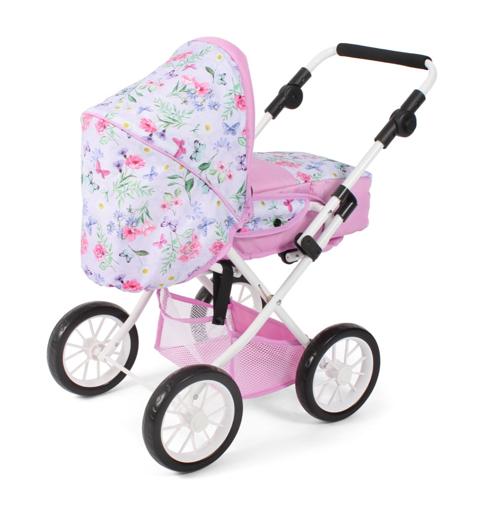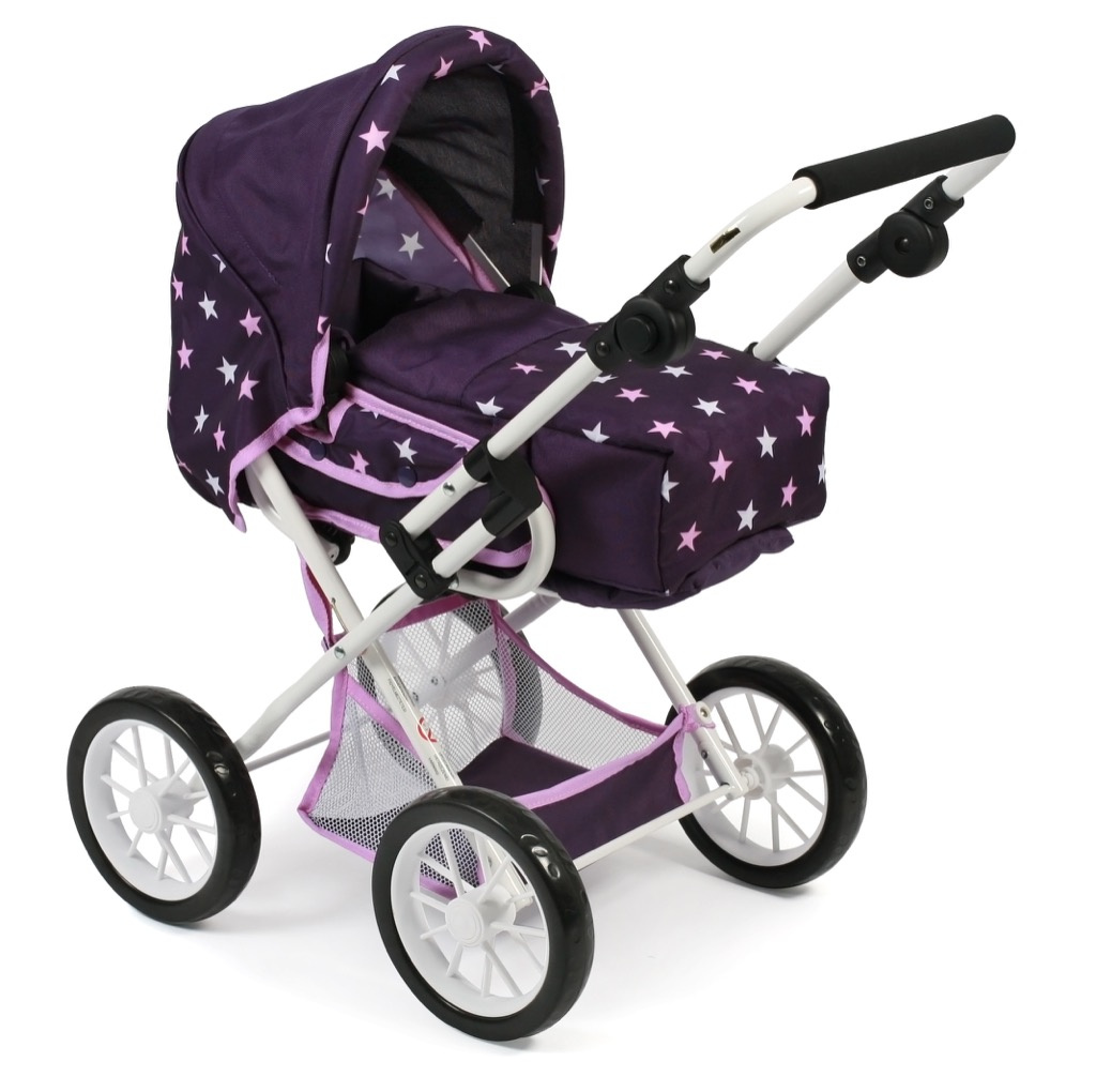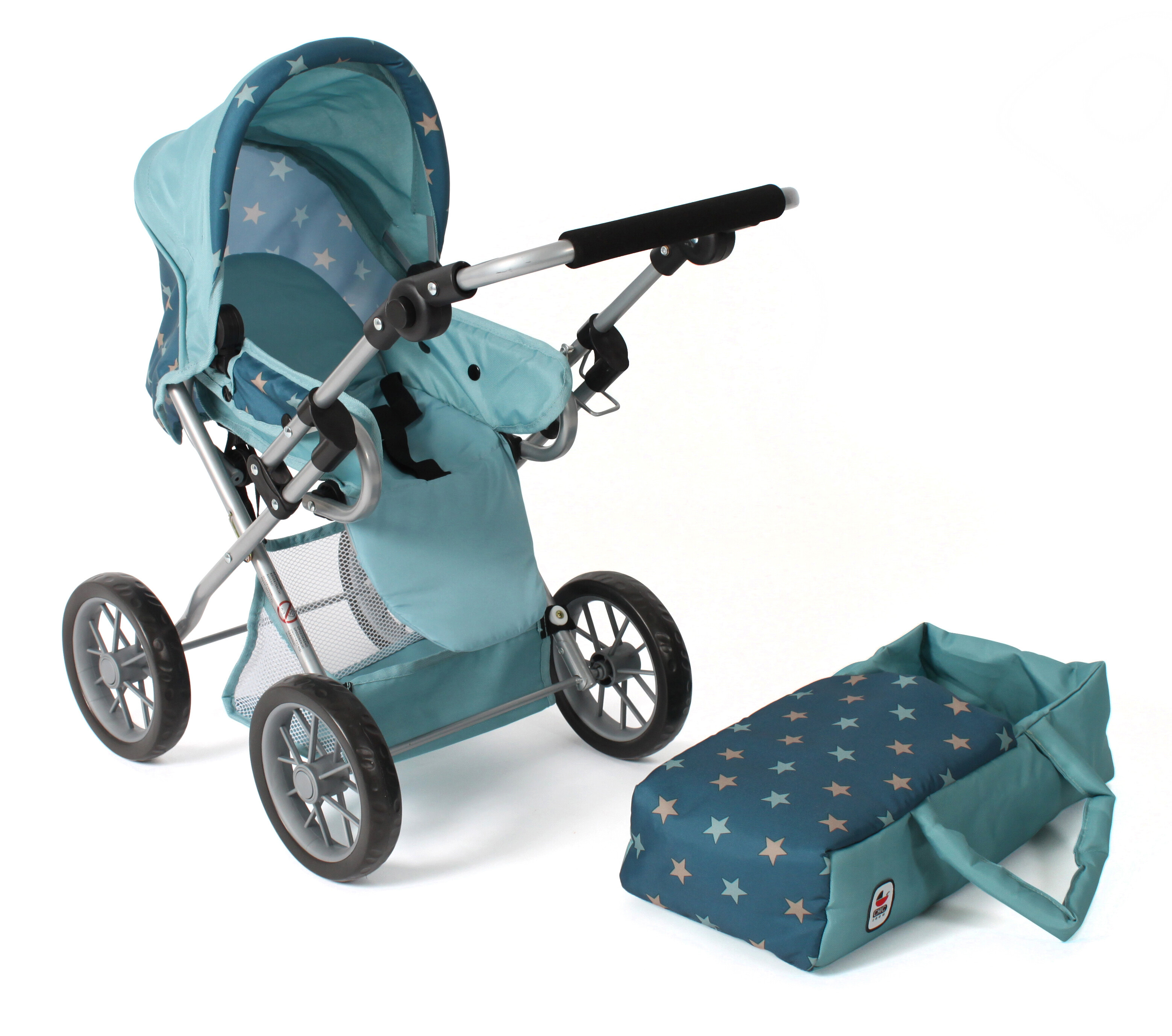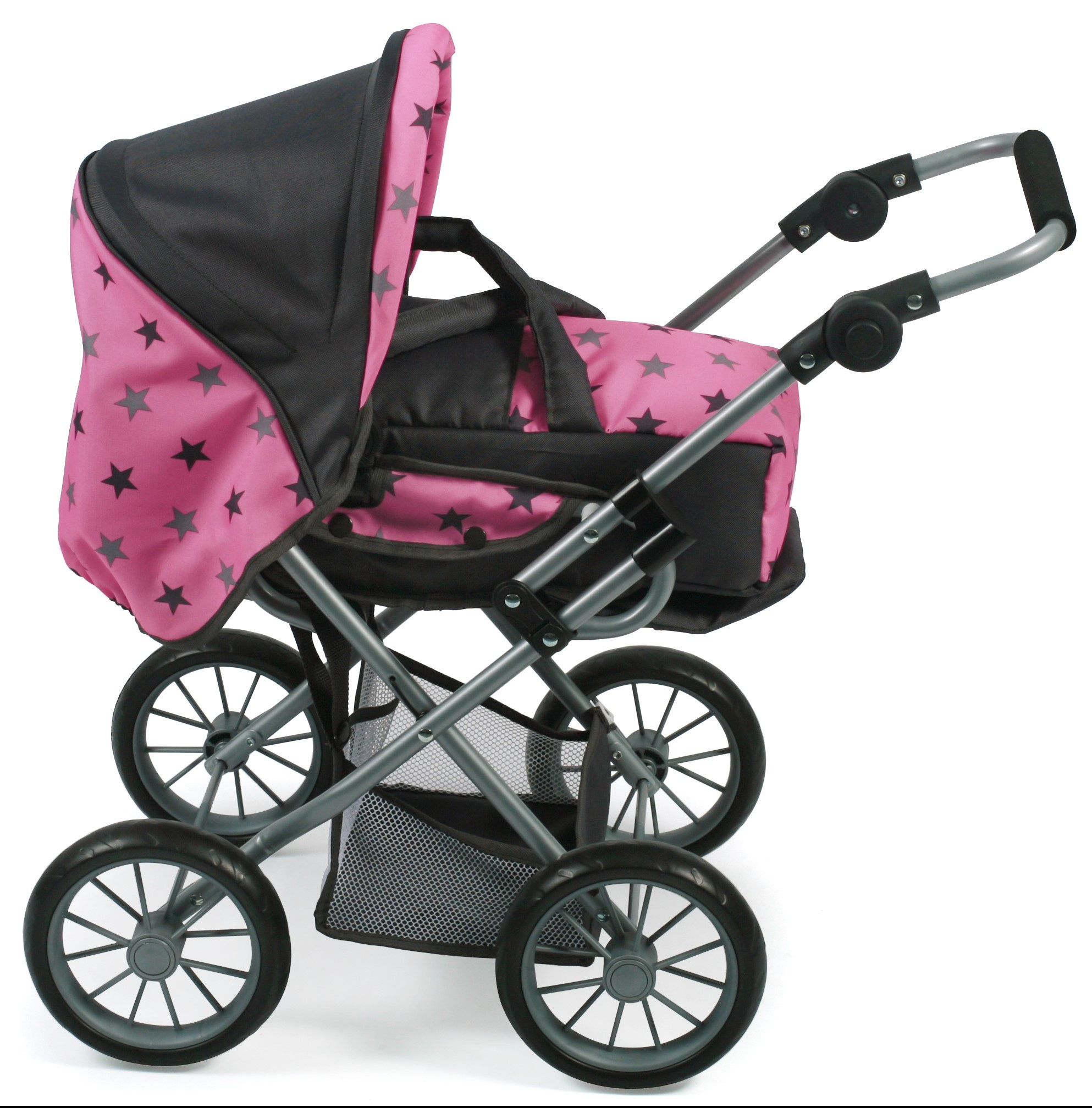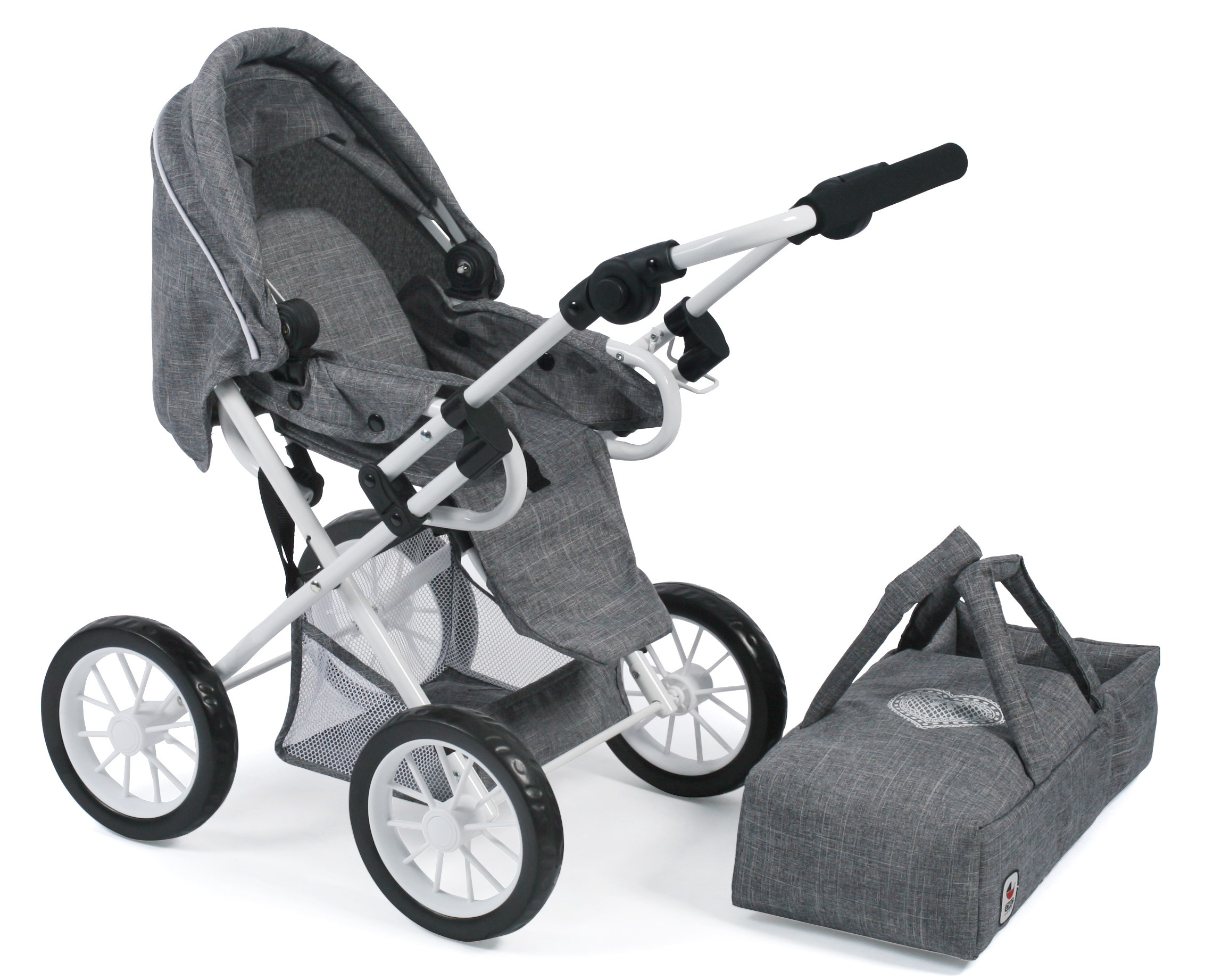 | Kombinovaný kočárek pro panenky - trojkombinace. Kočárek má nastavitelnou rukojeť. Vyjímatelnou tašku, která je součástí kočárku, je možné použít i samostatně jako tašku na panenku. Boudička je sklápěcí, a taktéž opěradlo kočárku. Kočárek má vespod konstrukce košík pro uložení drobností. Ke kočárku se dá koupit přebalovací taška na rukojeť ve stejné barvě. Vyrobeno německou firmou BAYER CHIC. výška 68cm šířka 37cm délka 64cm |