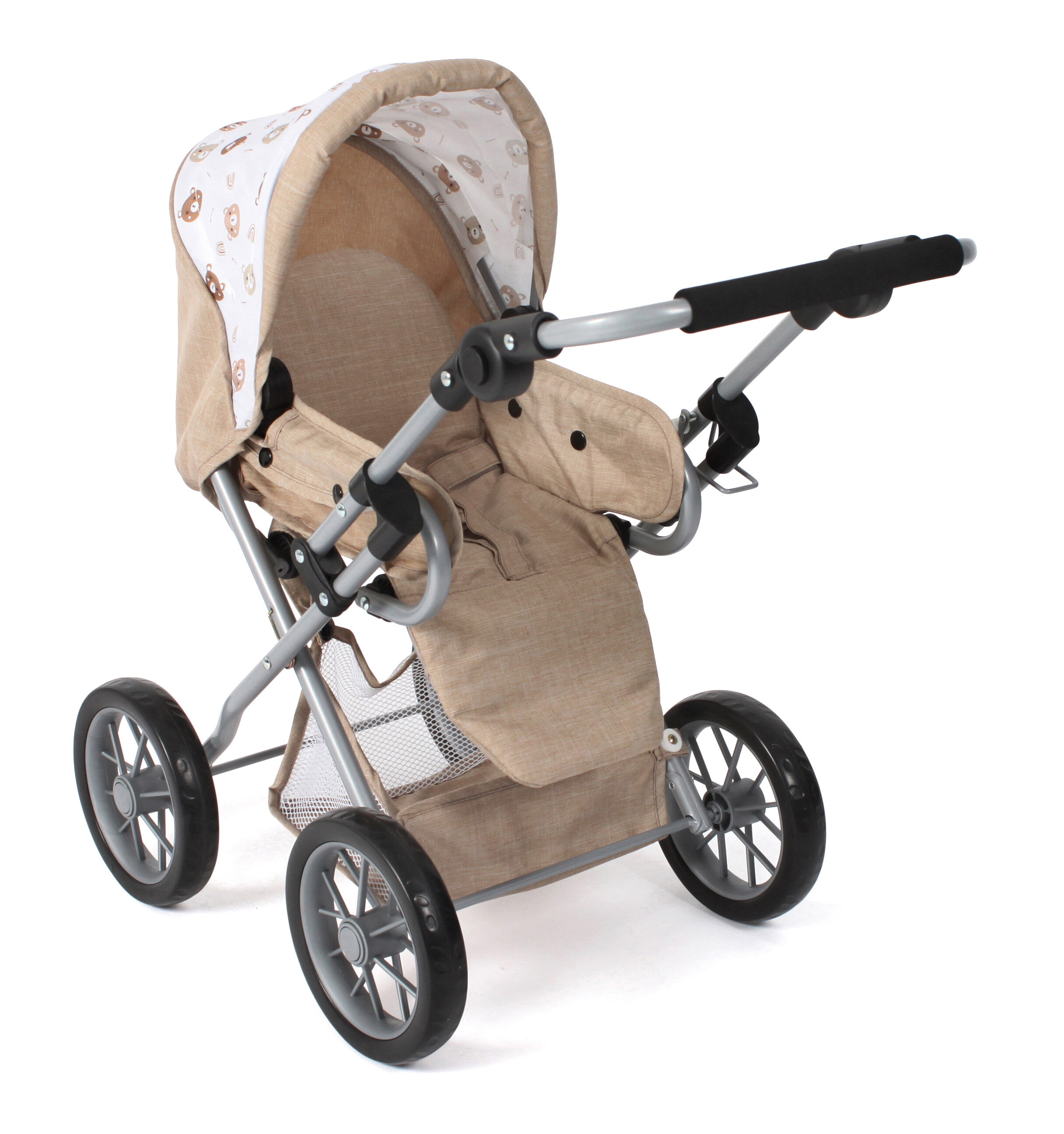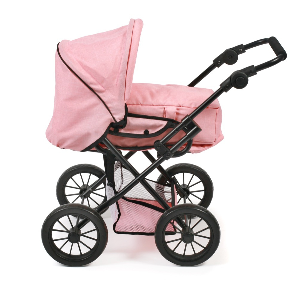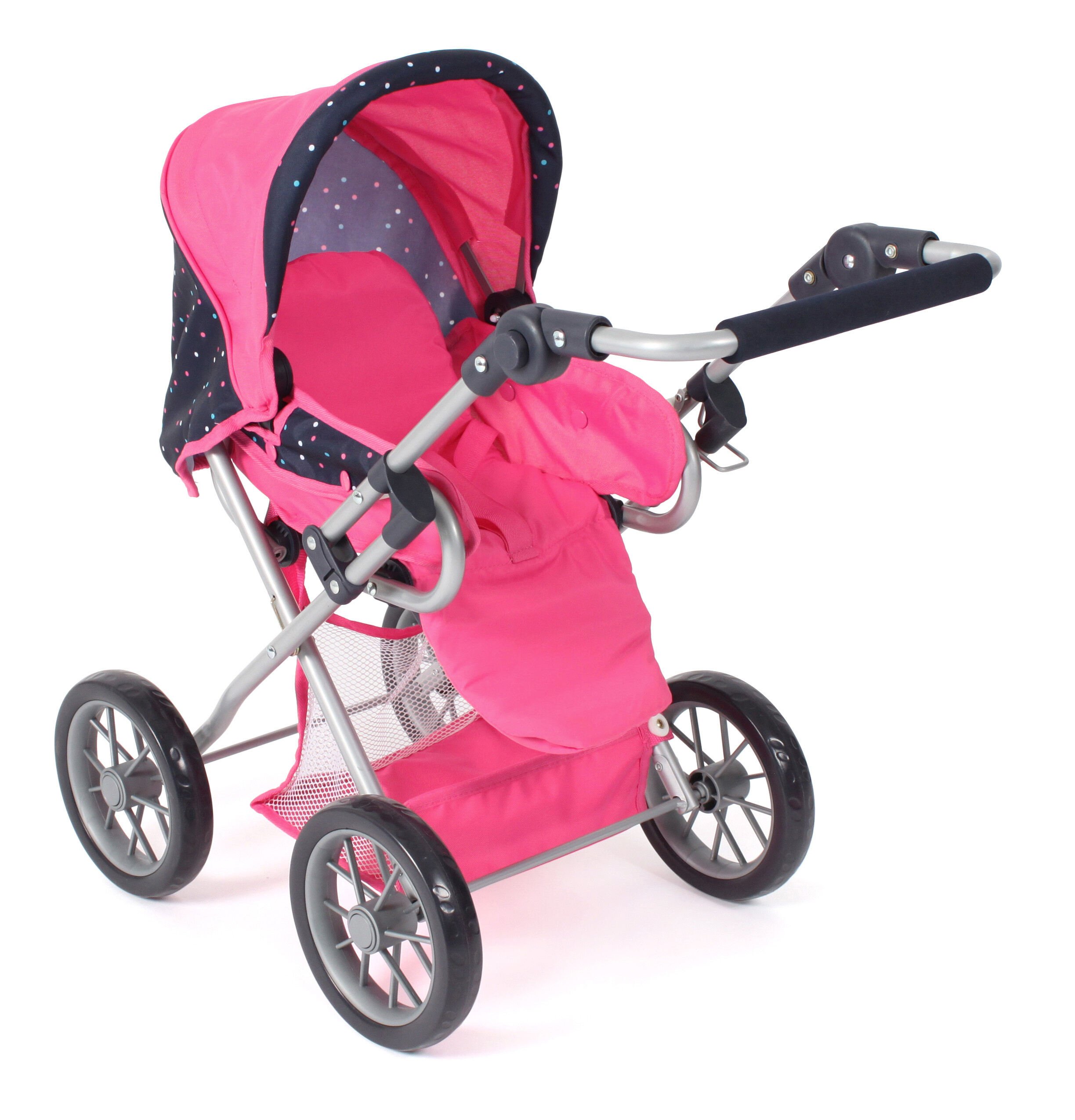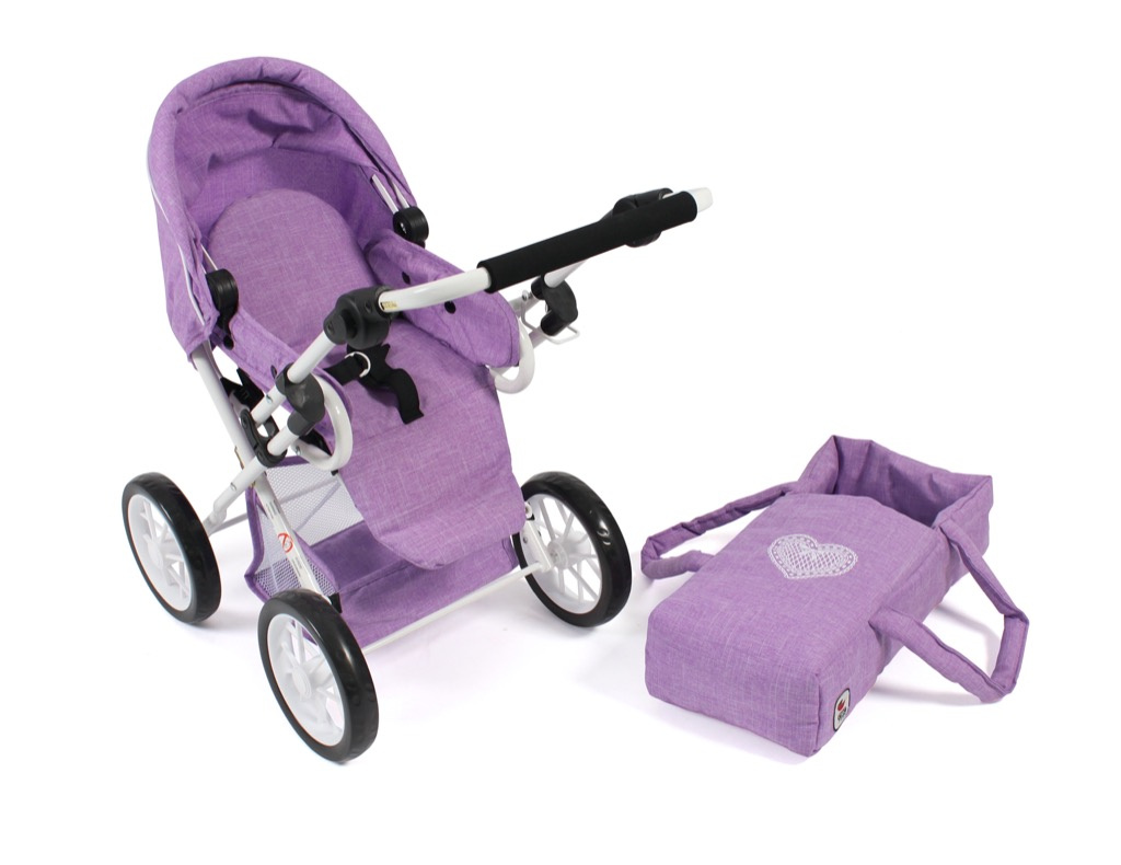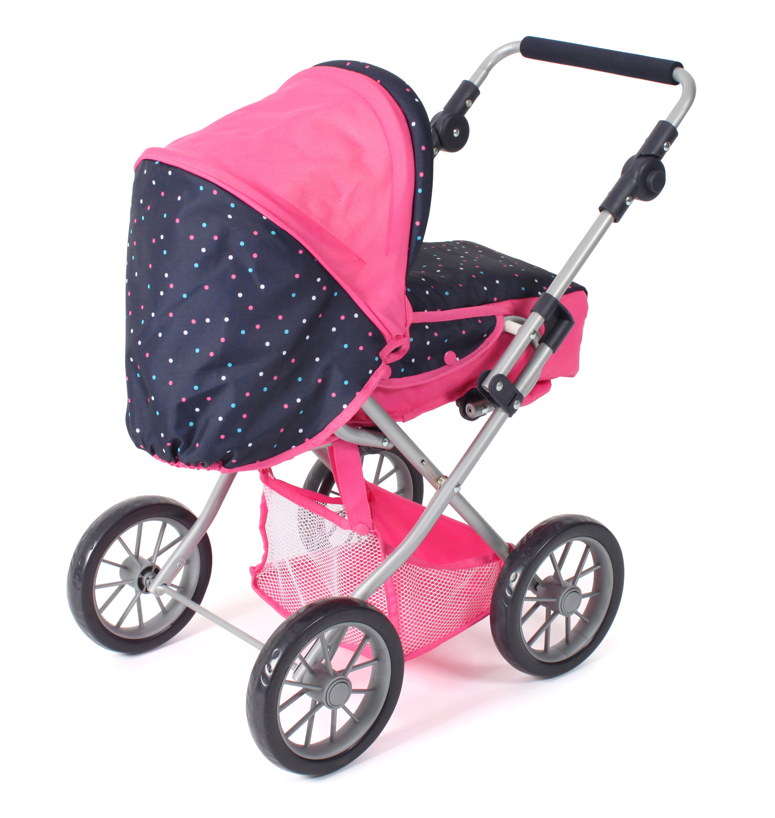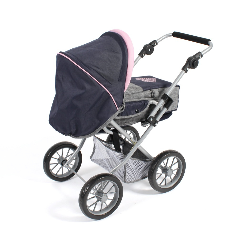 | Kombinovaný kočárek pro panenky - trojkombinace. Kočárek má nastavitelnou rukojeť. Vyjímatelnou tašku, která je součástí kočárku, je možné použít i samostatně jako tašku na panenku. Boudička je sklápěcí, a taktéž opěradlo kočárku. Kočárek má vespod konstrukce košík pro uložení drobností. Ke kočárku se dá koupit přebalovací taška na rukojeť ve stejné barvě. Vyrobeno německou firmou BAYER CHIC. výška 68cm šířka 37cm délka 64cm |