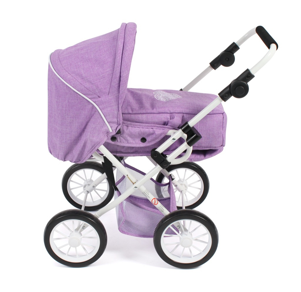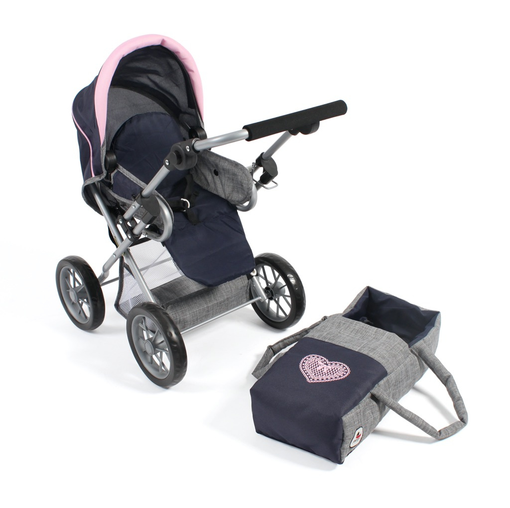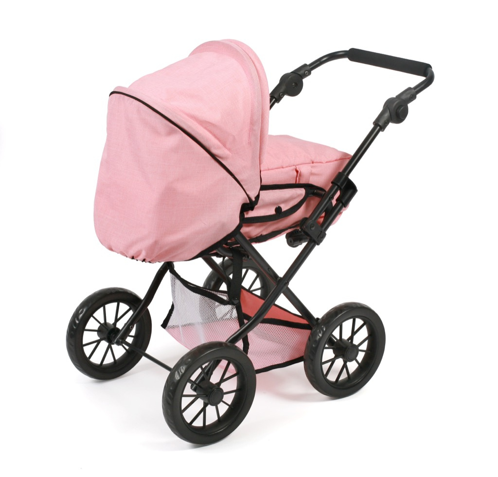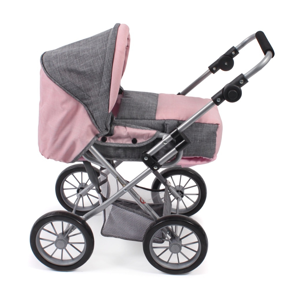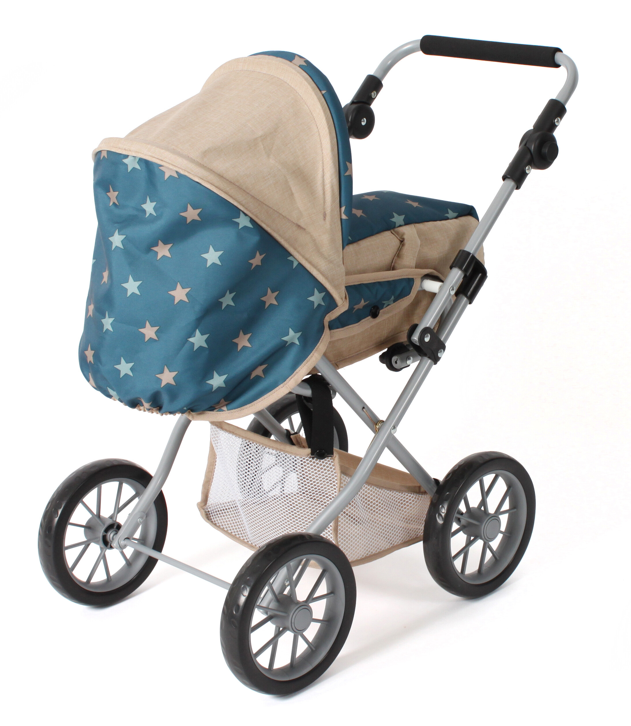 | Kombinovaný kočárek pro panenky - trojkombinace. Kočárek má nastavitelnou rukojeť. Vyjímatelnou tašku, která je součástí kočárku, je možné použít i samostatně jako tašku na panenku. Boudička je sklápěcí, a taktéž opěradlo kočárku. Kočárek má vespod konstrukce košík pro uložení drobností. Ke kočárku se dá koupit přebalovací taška na rukojeť ve stejné barvě. Vyrobeno německou firmou BAYER CHIC. výška 68cm šířka 37cm délka 64cm |