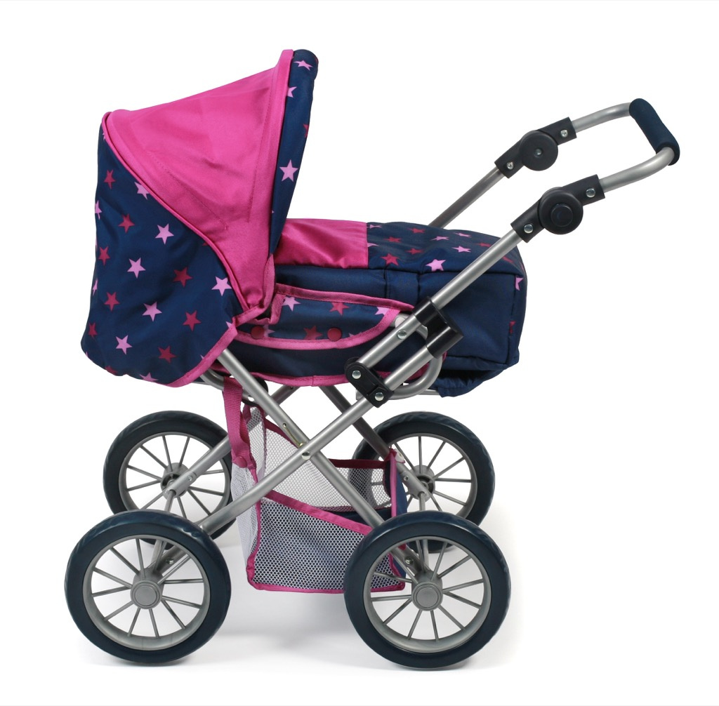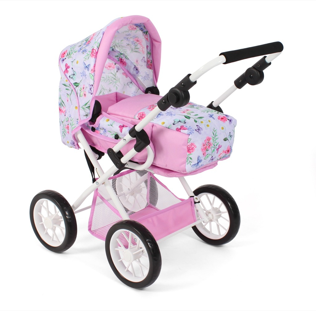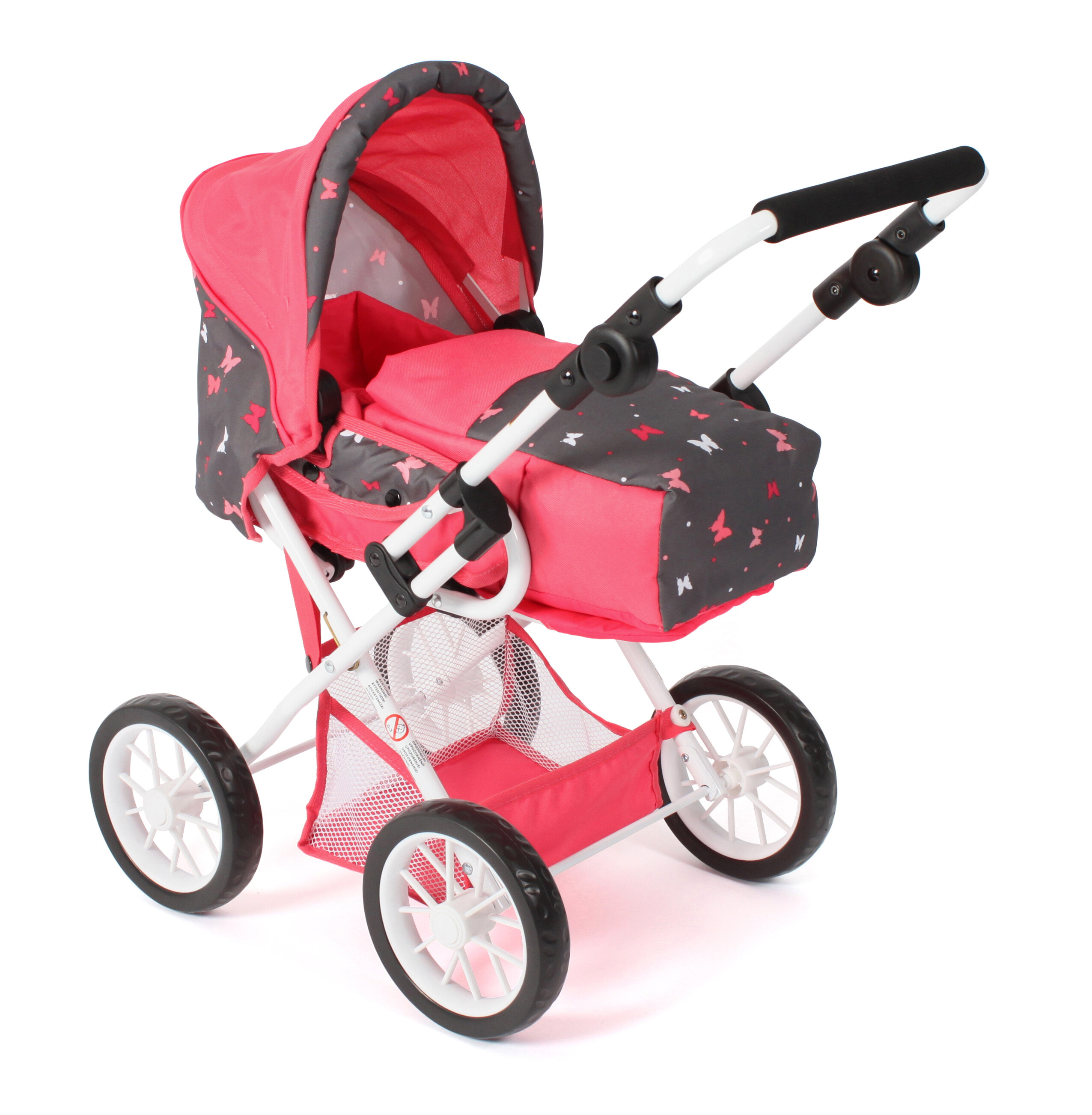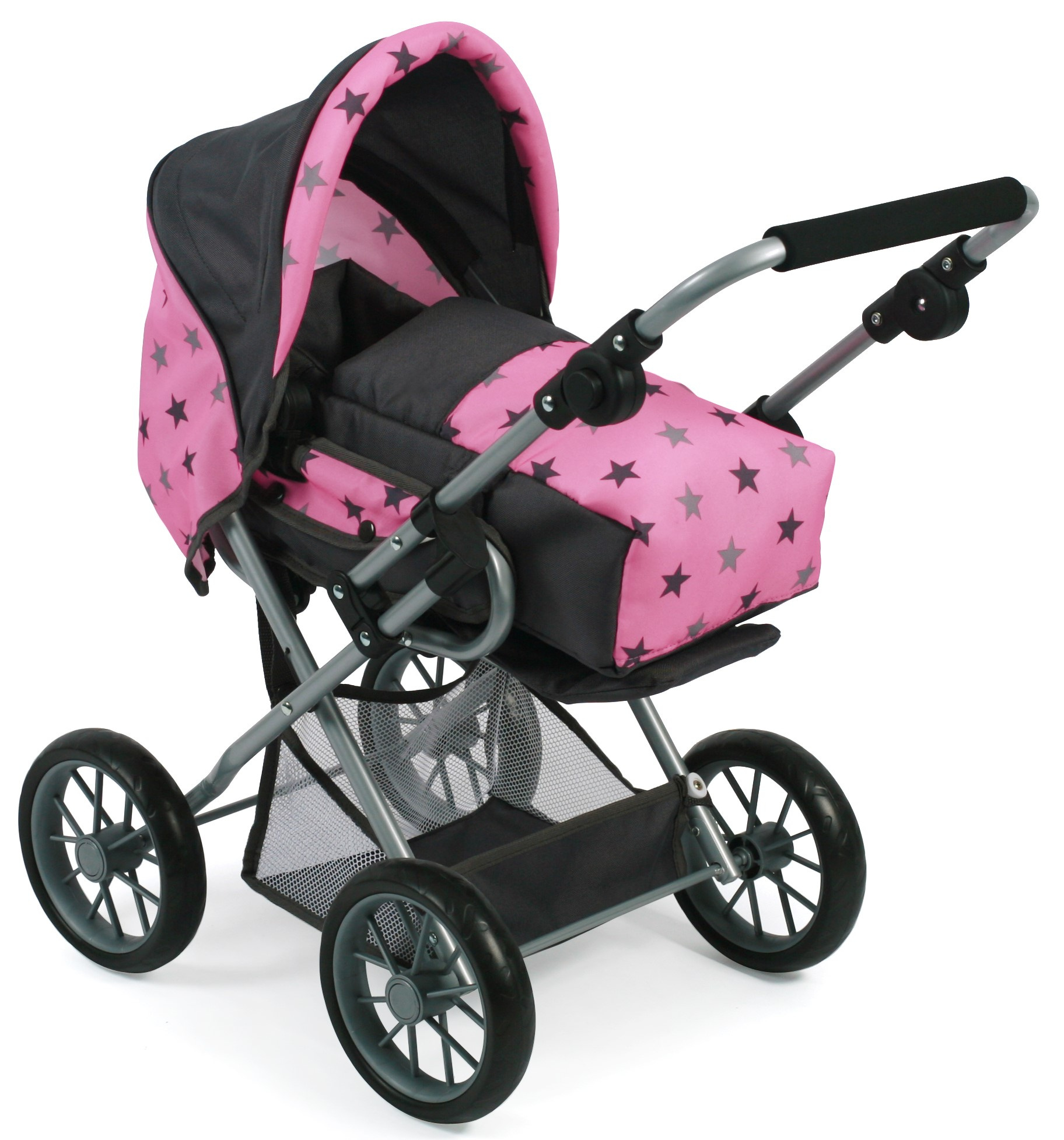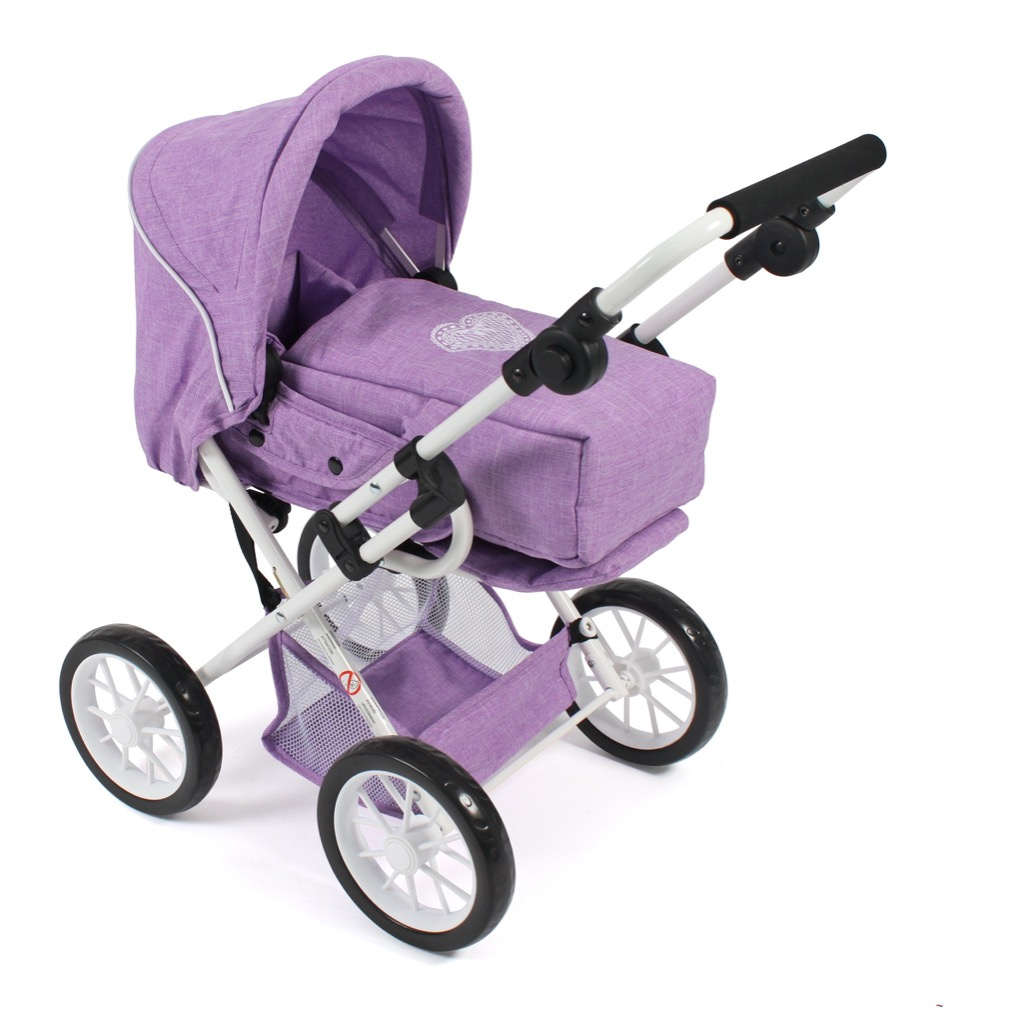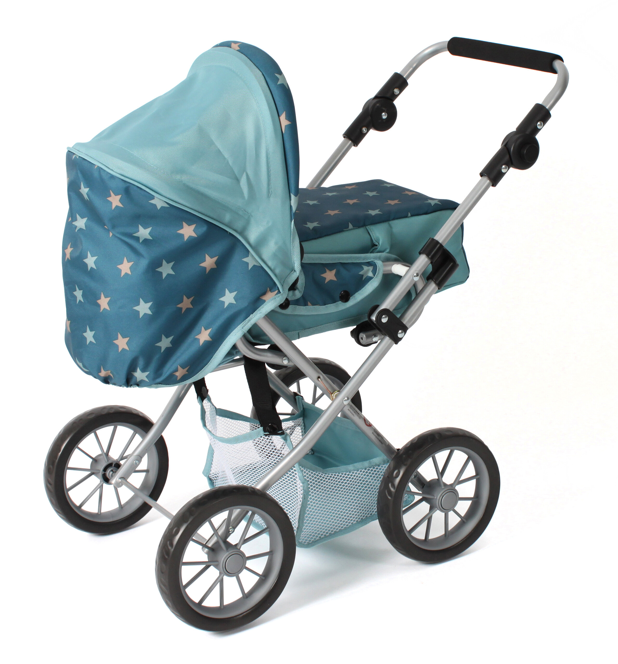 | Kombinovaný kočárek pro panenky - trojkombinace. Kočárek má nastavitelnou rukojeť. Vyjímatelnou tašku, která je součástí kočárku, je možné použít i samostatně jako tašku na panenku. Boudička je sklápěcí, a taktéž opěradlo kočárku. Kočárek má vespod konstrukce košík pro uložení drobností. Ke kočárku se dá koupit přebalovací taška na rukojeť ve stejné barvě. Vyrobeno německou firmou BAYER CHIC. výška 68cm šířka 37cm délka 64cm |