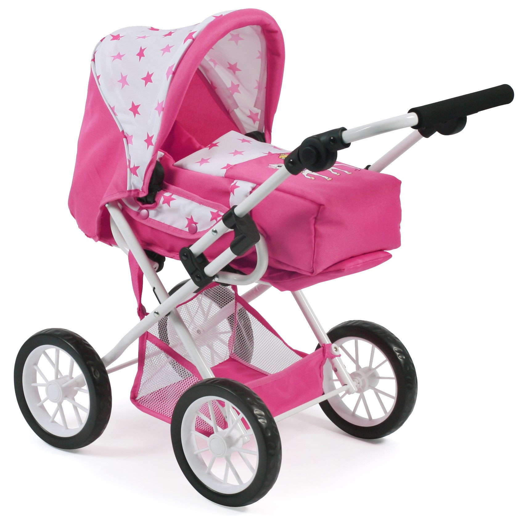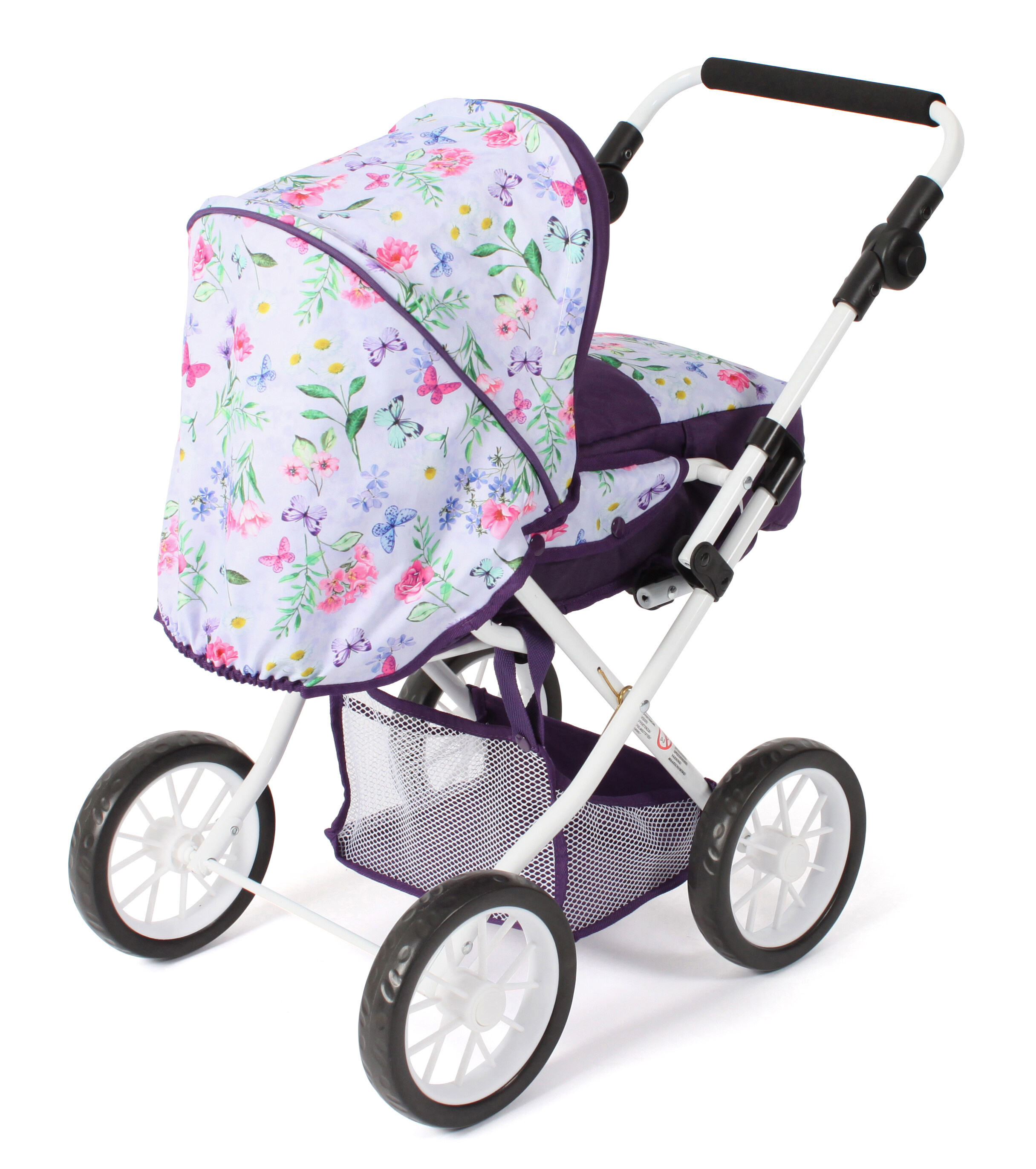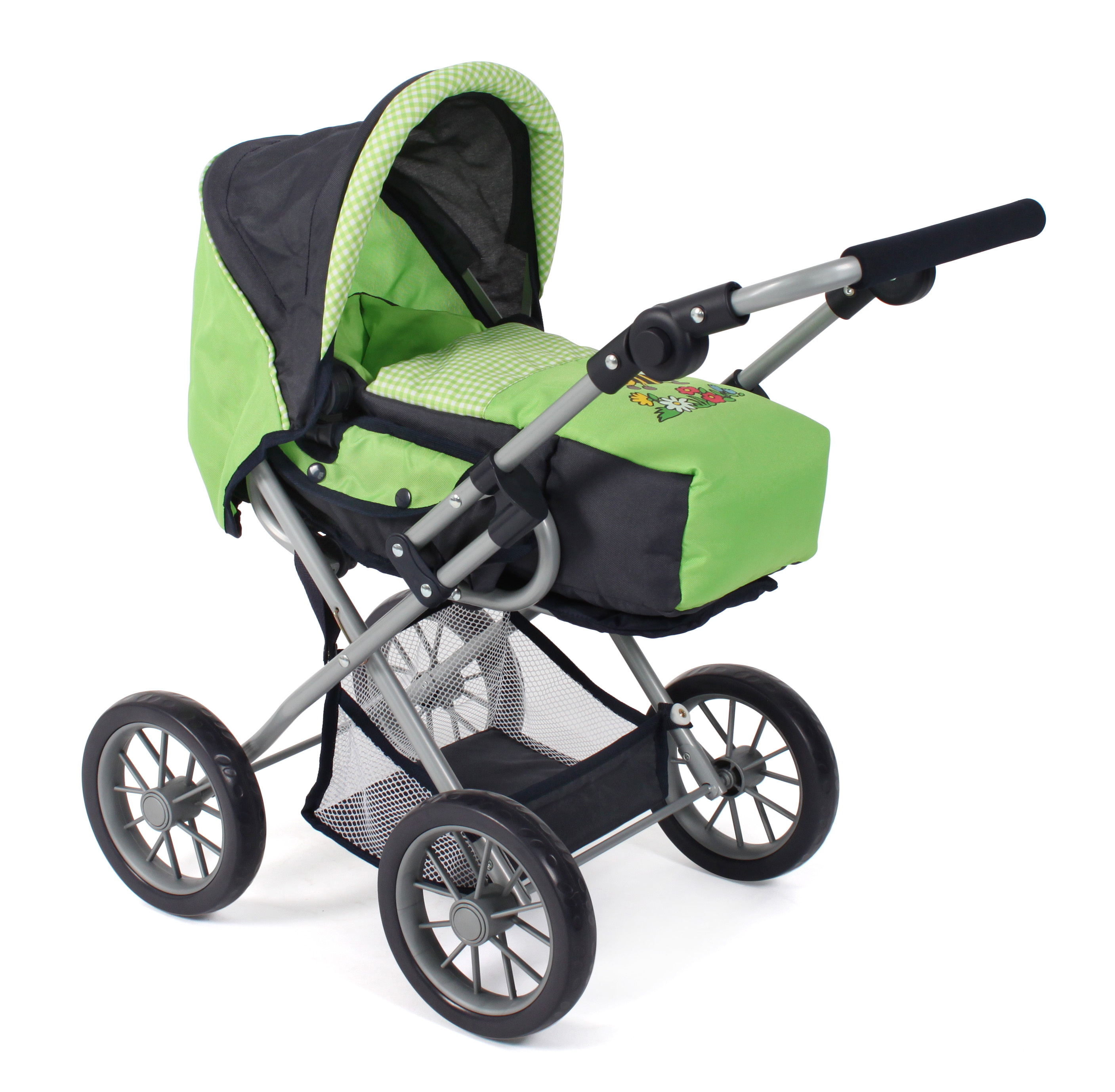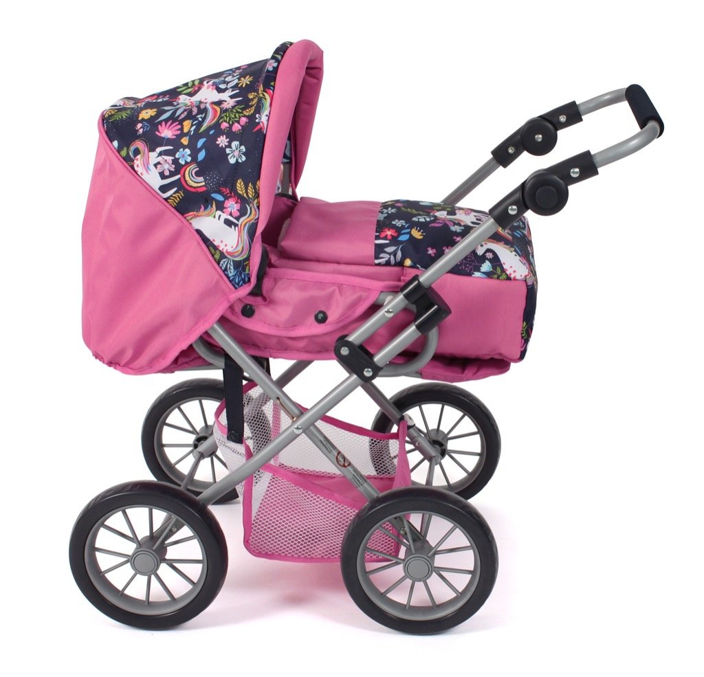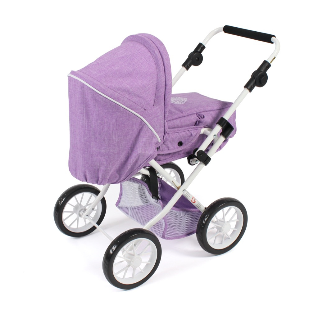 | Kombinovaný kočárek pro panenky - trojkombinace. Kočárek má nastavitelnou rukojeť. Vyjímatelnou tašku, která je součástí kočárku, je možné použít i samostatně jako tašku na panenku. Boudička je sklápěcí, a taktéž opěradlo kočárku. Kočárek má vespod konstrukce košík pro uložení drobností. Ke kočárku se dá koupit přebalovací taška na rukojeť ve stejné barvě. Vyrobeno německou firmou BAYER CHIC. výška 68cm šířka 37cm délka 64cm |