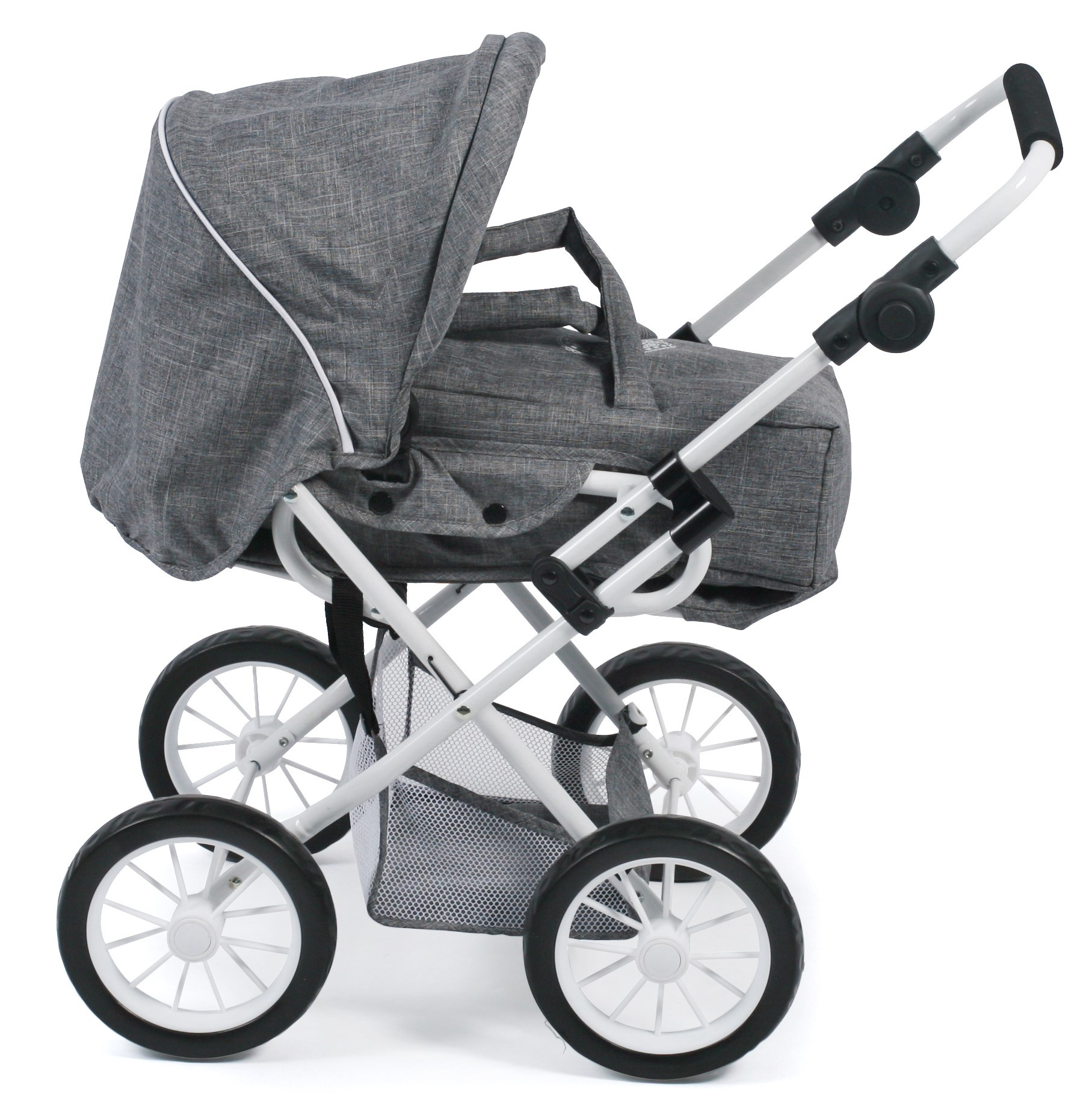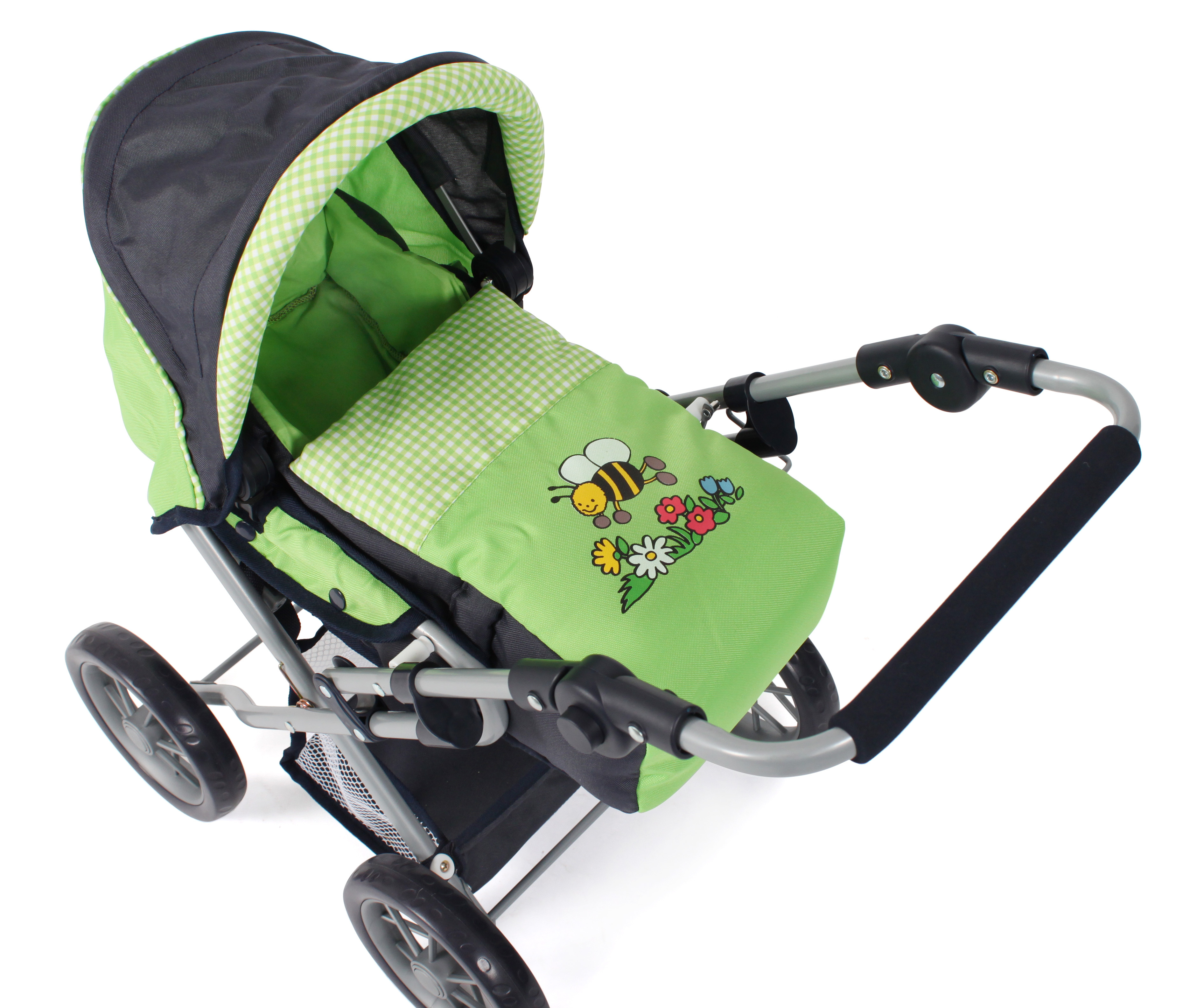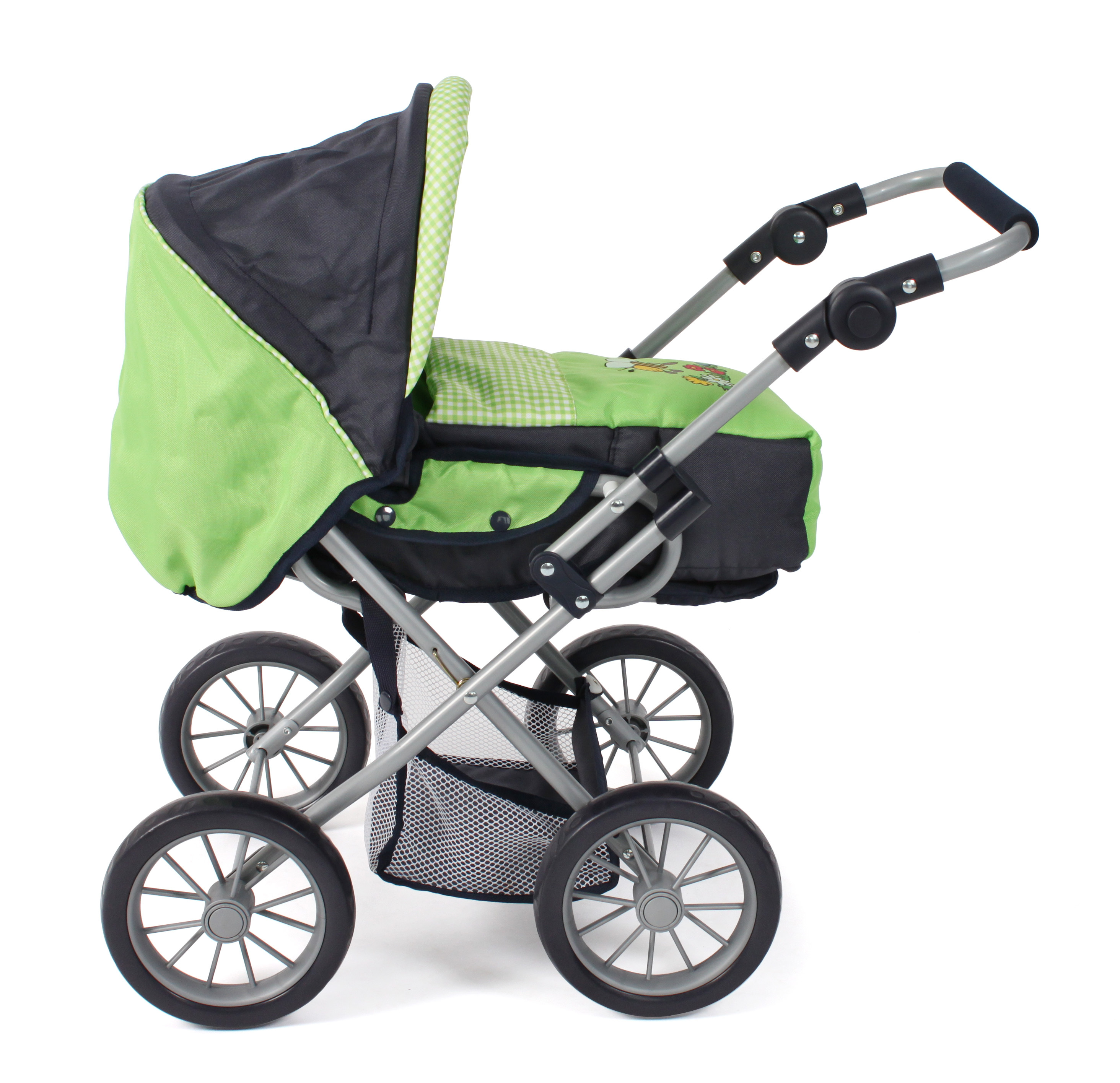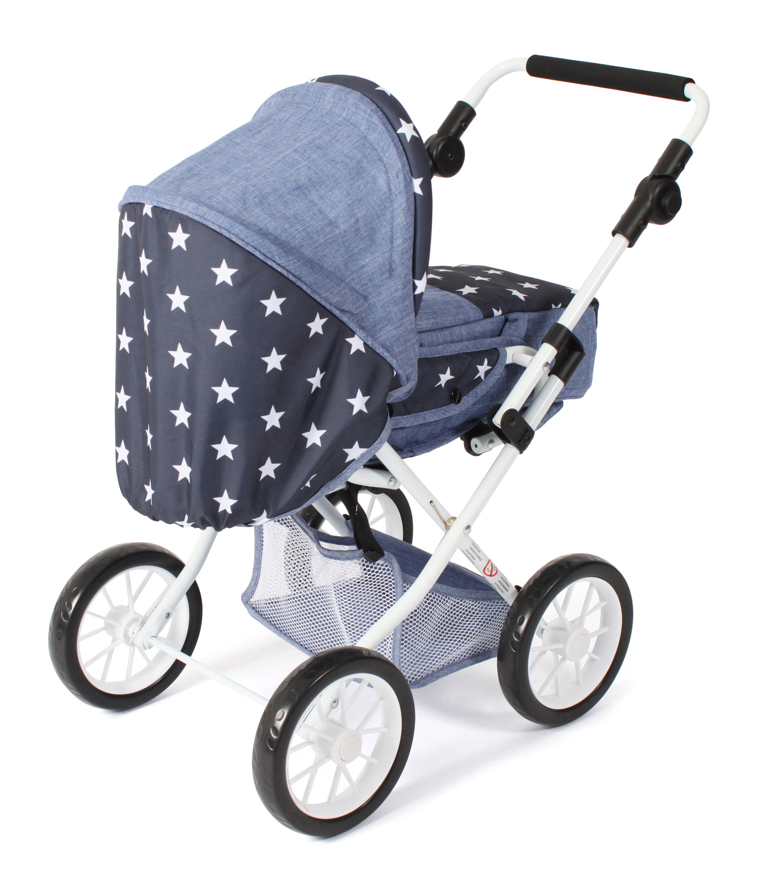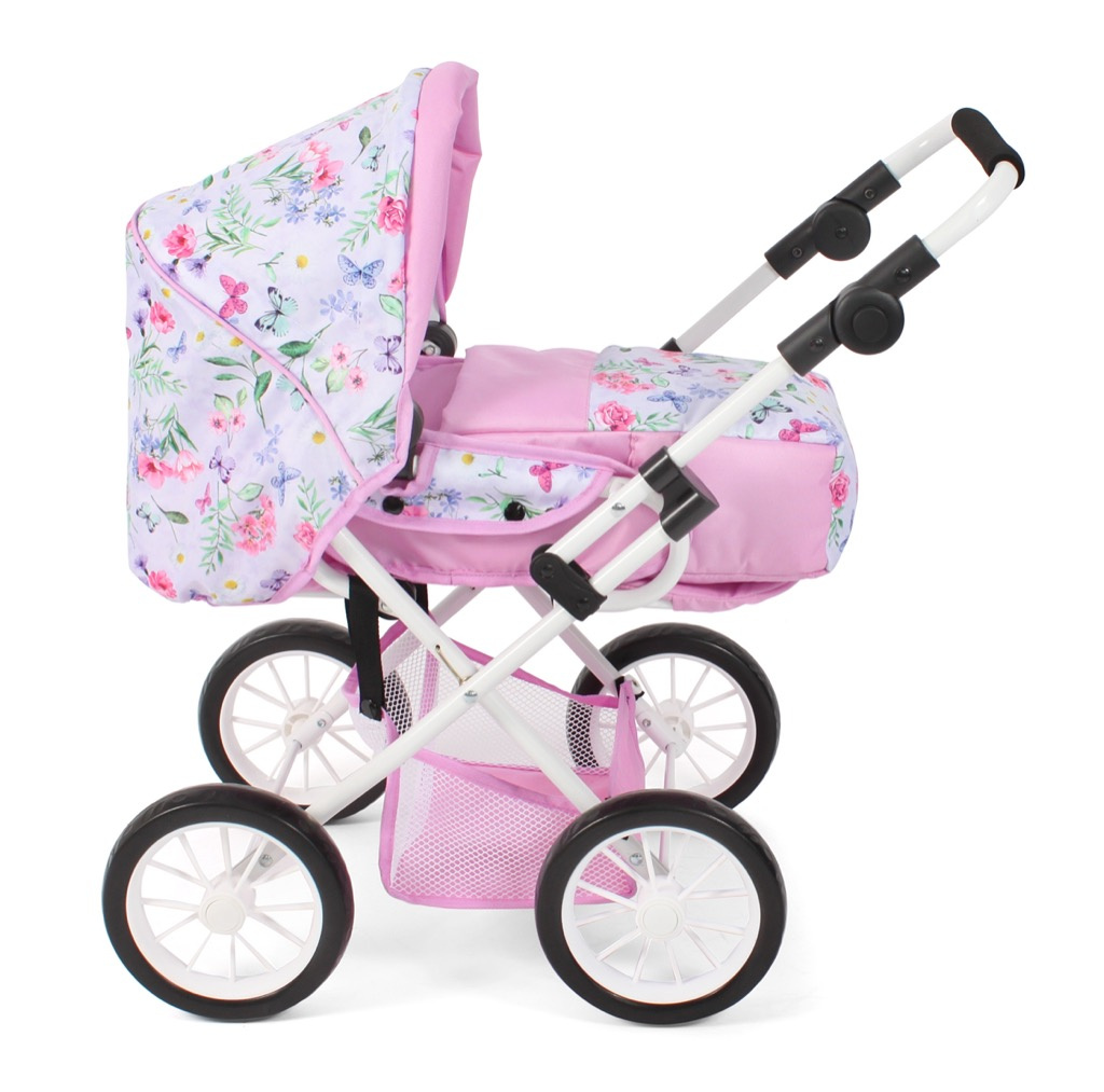 | Kombinovaný kočárek pro panenky - trojkombinace. Kočárek má nastavitelnou rukojeť. Vyjímatelnou tašku, která je součástí kočárku, je možné použít i samostatně jako tašku na panenku. Boudička je sklápěcí, a taktéž opěradlo kočárku. Kočárek má vespod konstrukce košík pro uložení drobností. Ke kočárku se dá koupit přebalovací taška na rukojeť ve stejné barvě. Vyrobeno německou firmou BAYER CHIC. výška 68cm šířka 37cm délka 64cm |