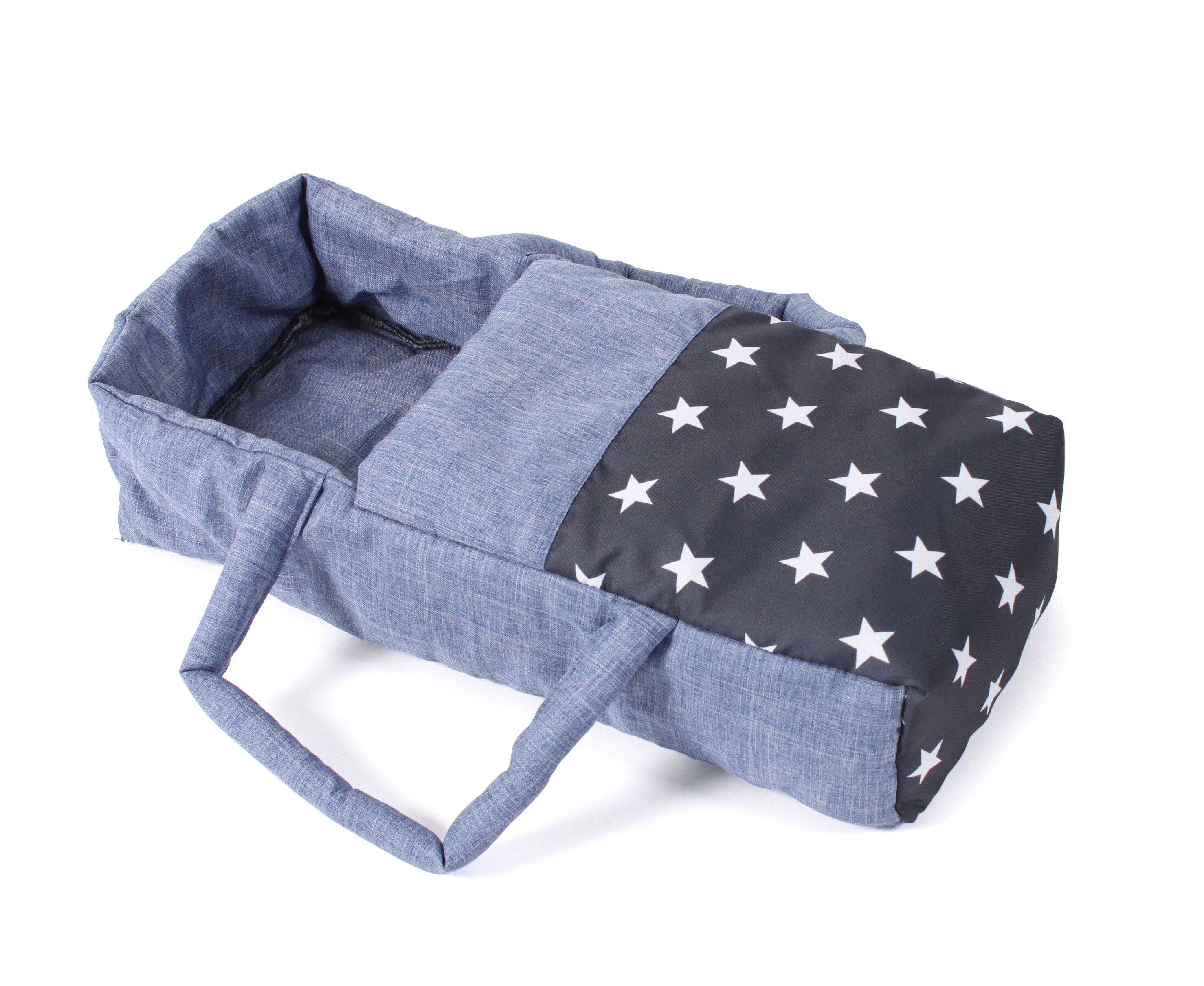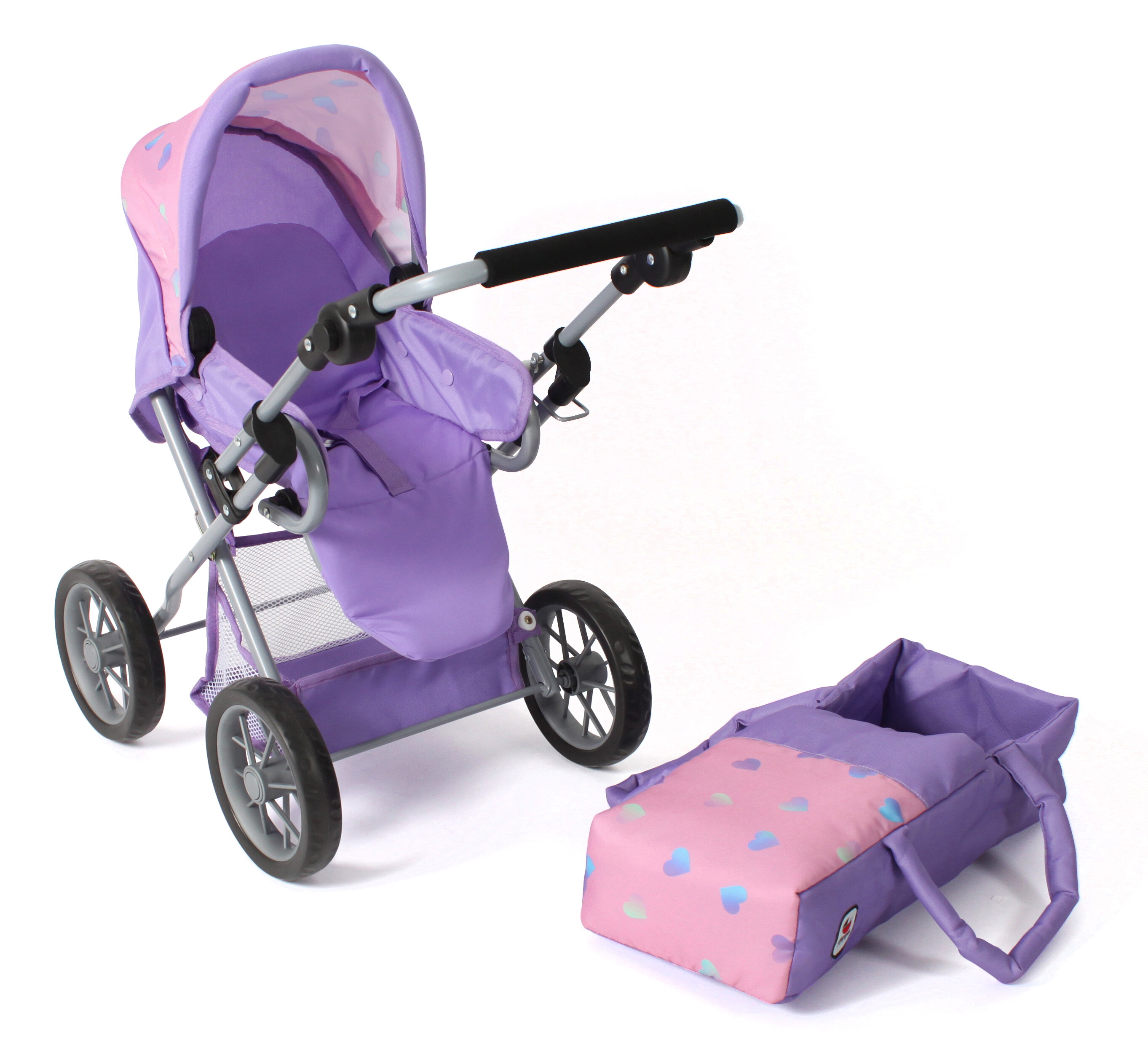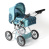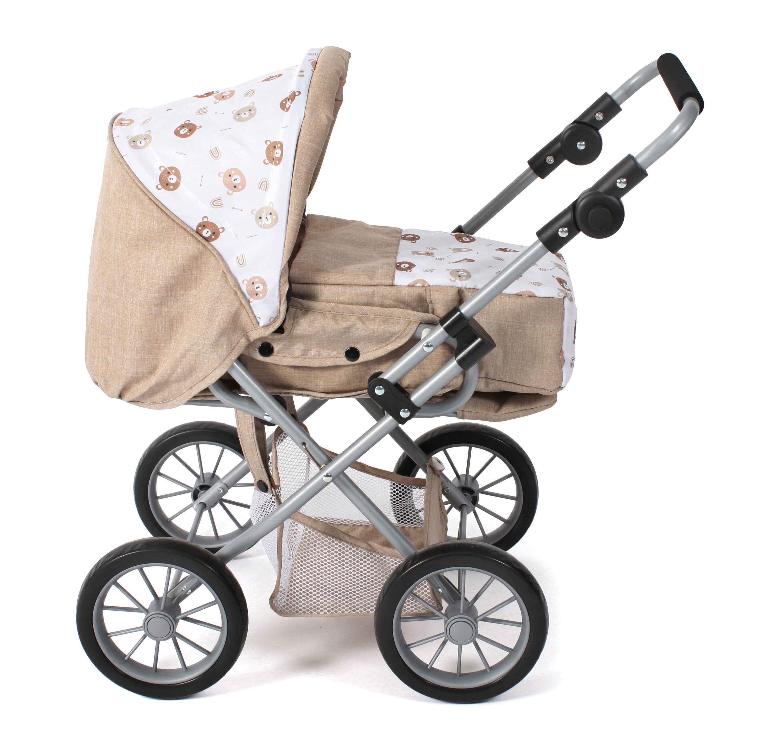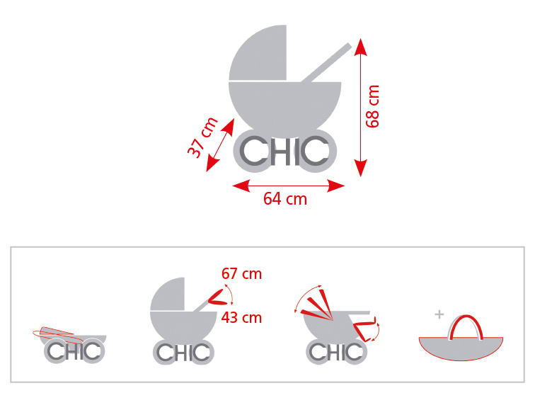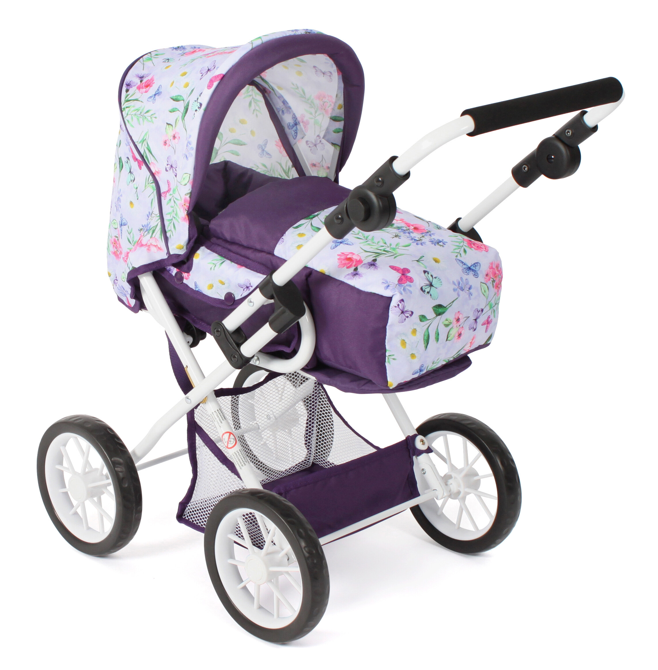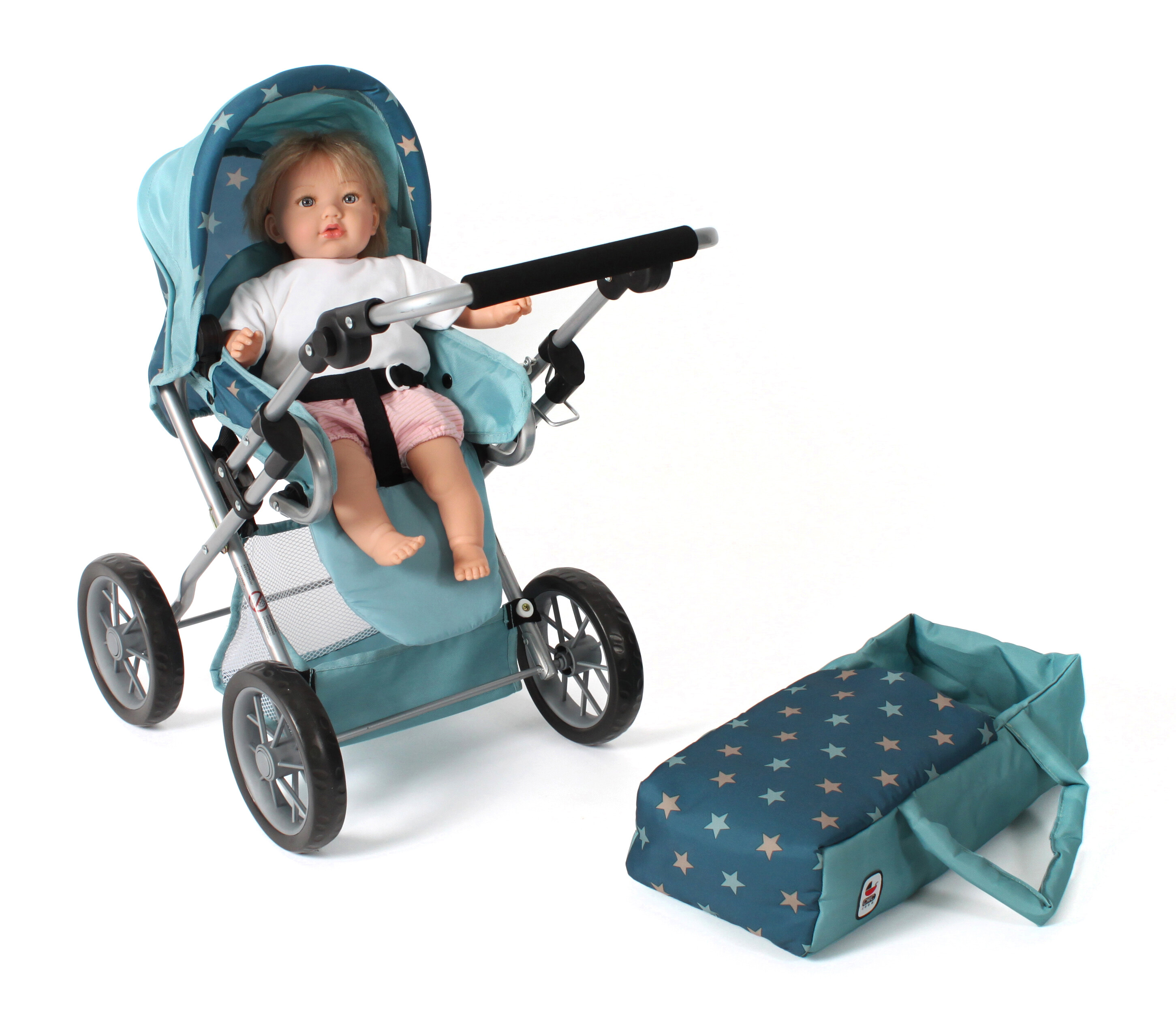 | Kombinovaný kočárek pro panenky - trojkombinace. Kočárek má nastavitelnou rukojeť. Vyjímatelnou tašku, která je součástí kočárku, je možné použít i samostatně jako tašku na panenku. Boudička je sklápěcí, a taktéž opěradlo kočárku. Kočárek má vespod konstrukce košík pro uložení drobností. Ke kočárku se dá koupit přebalovací taška na rukojeť ve stejné barvě. Vyrobeno německou firmou BAYER CHIC. výška 68cm šířka 37cm délka 64cm |