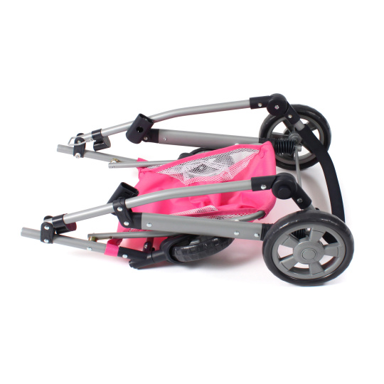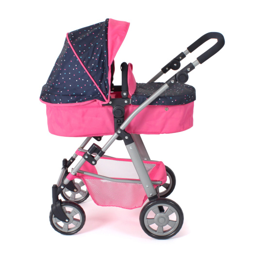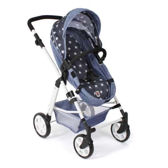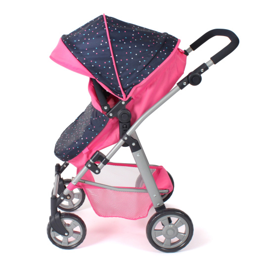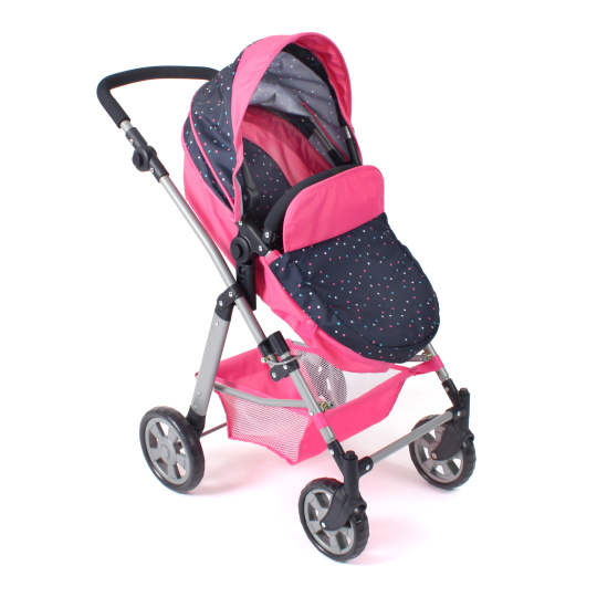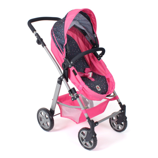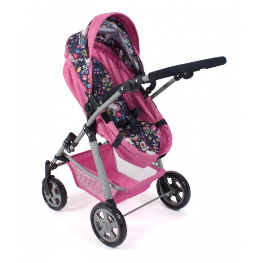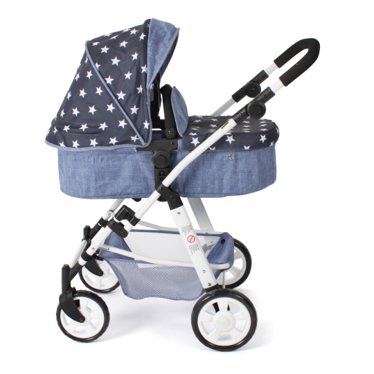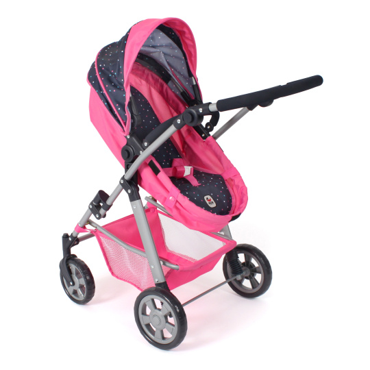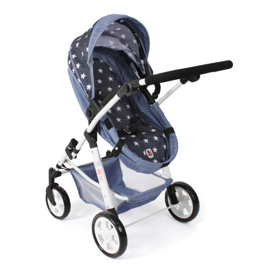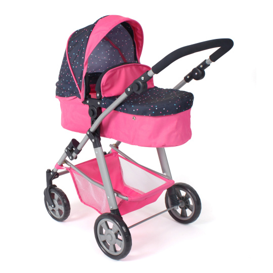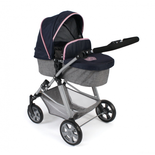 | NELE je velmi moderní a technicky propracovaný kombinovaný kočárek pro panenky. Tento model kočárku je vyšší a větší než podobné modely kočárků. Přestože je dodáván jen s jednou korbičkou, jedná se o "dvojkombinaci". Kočárek je možné jednoduchou úpravou změnit ze sporťáku, na hluboký kočárek a naopak. To se provádí změnou polohy a snadným uvolněním dna sportovní korbičky. Samozřejmostí je možnost přetočení korbičky ve směru jízdy, nebo naopak. Kočárek je pro panenku o velikosti do 52 cm. Kočárek má přední otočná kolečka a pod kočárkem síťku na drobnosti . Kočárek má nastavitelnou rukojeť. Výška rukojeti je 45-84 cm, rozměry kočárku jsou: v:85cm,d:73cm,š:44,5cm. |