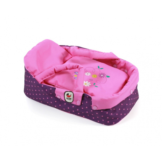 Autosedačka pro panenku do 45 cm. Výrobek obsahuje bryndáček pro panenku ve stejné barvě, přichycený na suchý zip. Pro přenášení je autosedačka vybavena sklopným madlem, které je opatřeno pěnovou gumou. Rozměry: š31 x v31 x hl 47 cm.