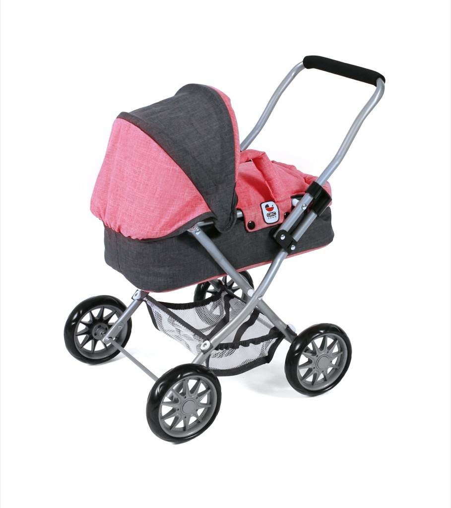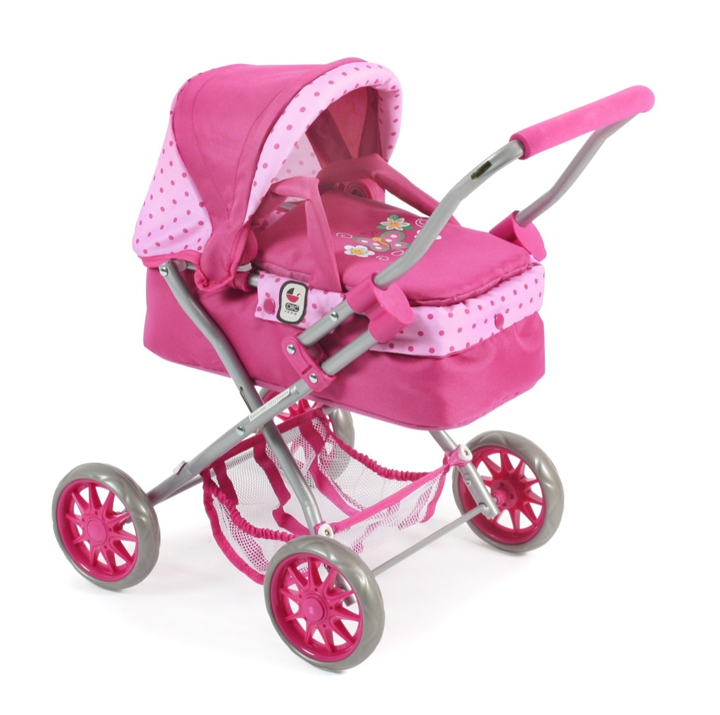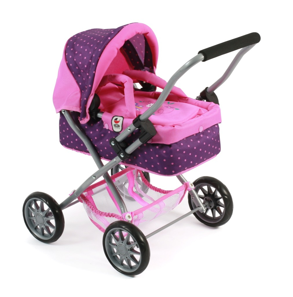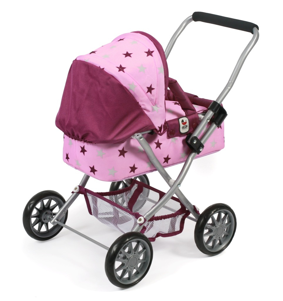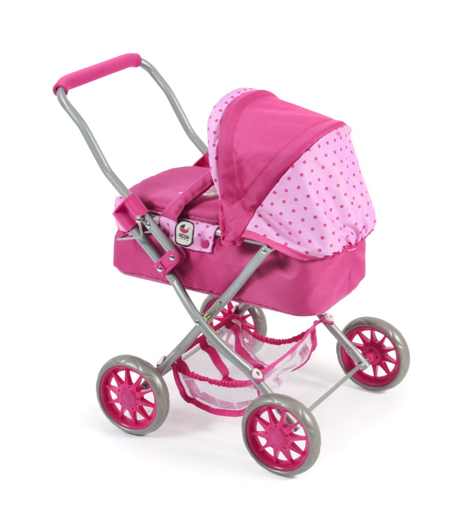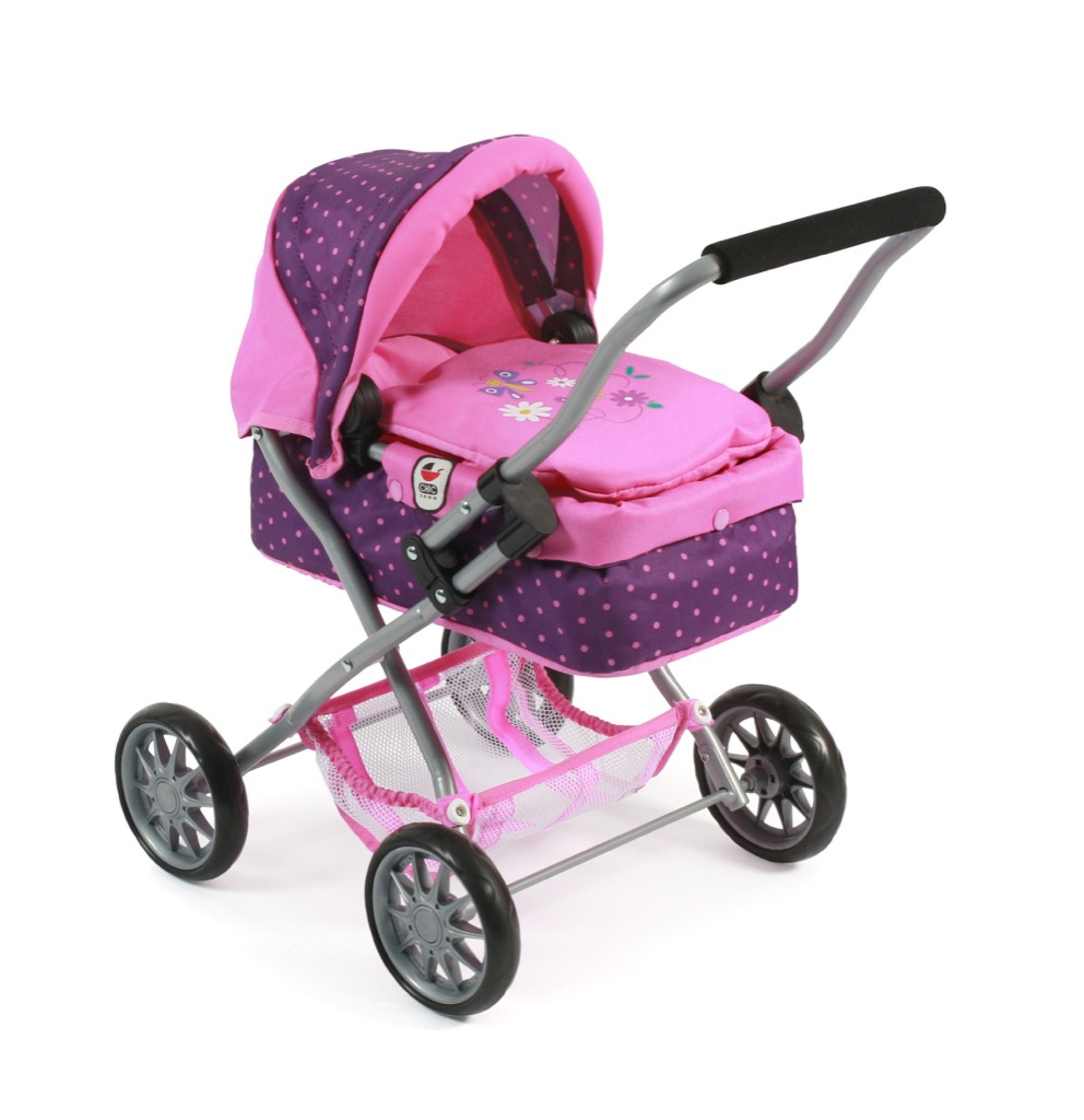 Krásný malinký kočárek pro panenky s vyjímatelnou taškou.