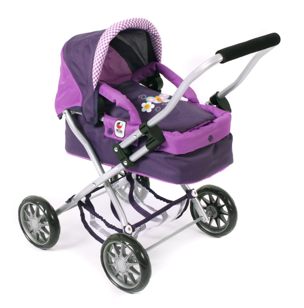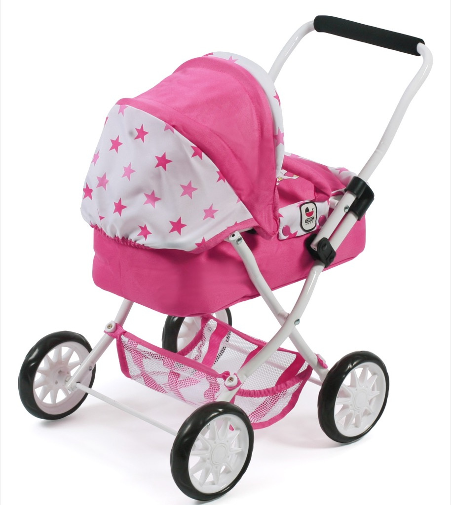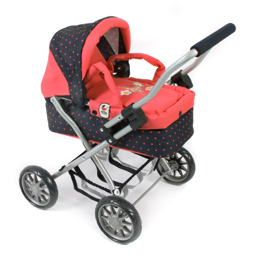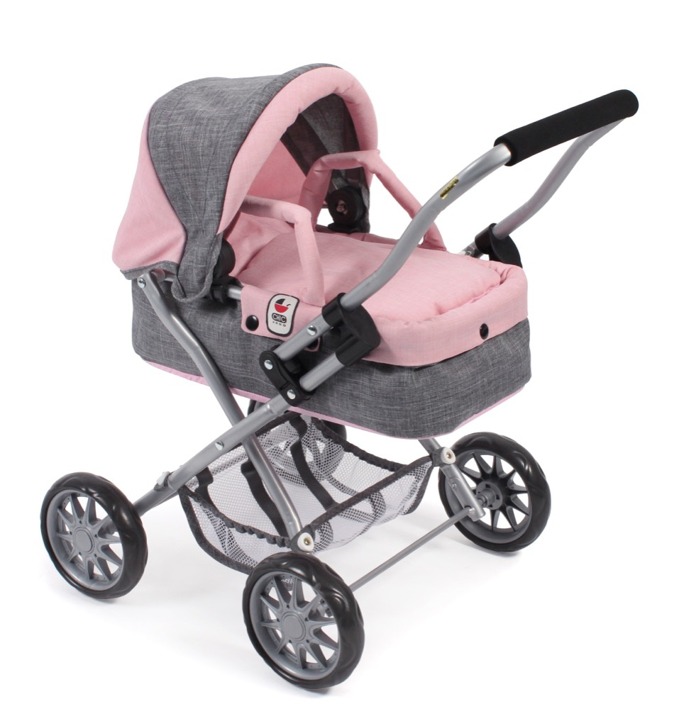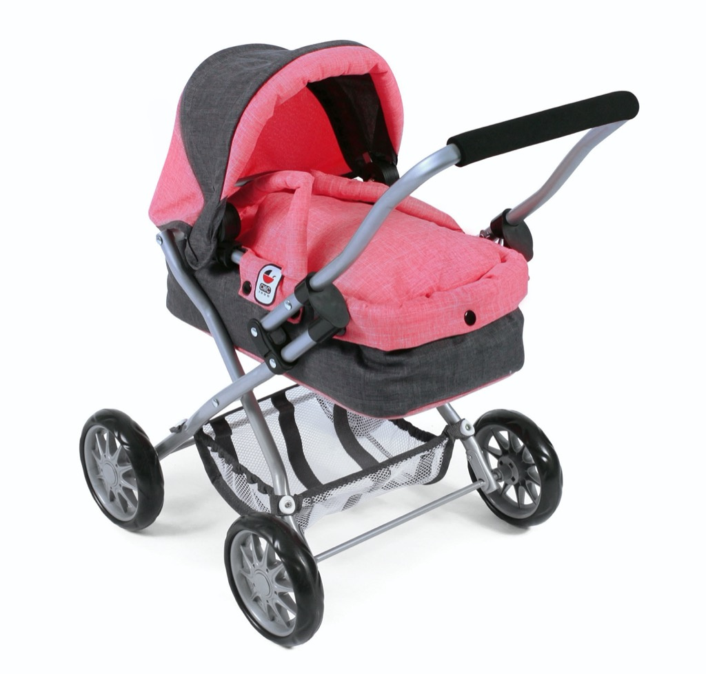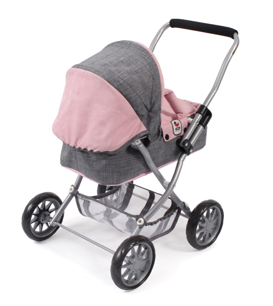 Krásný malinký kočárek pro panenky s vyjímatelnou taškou.