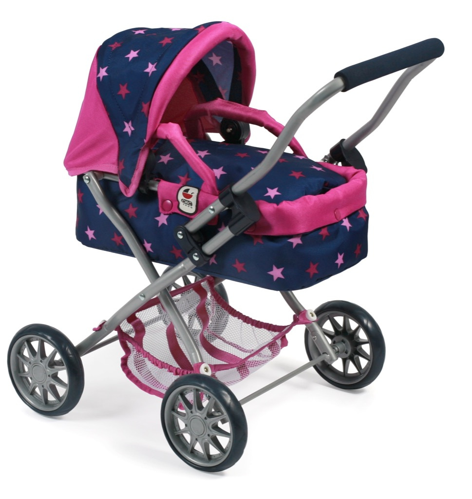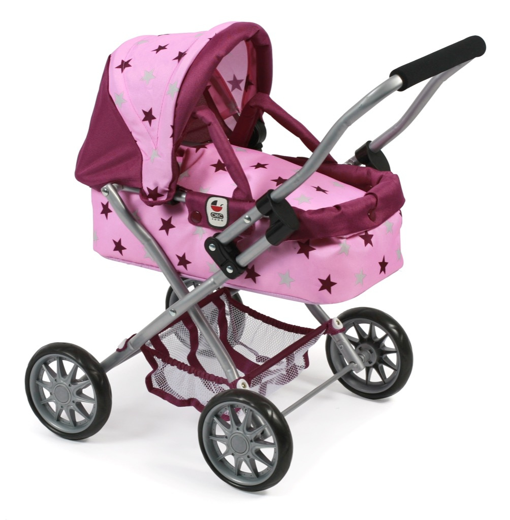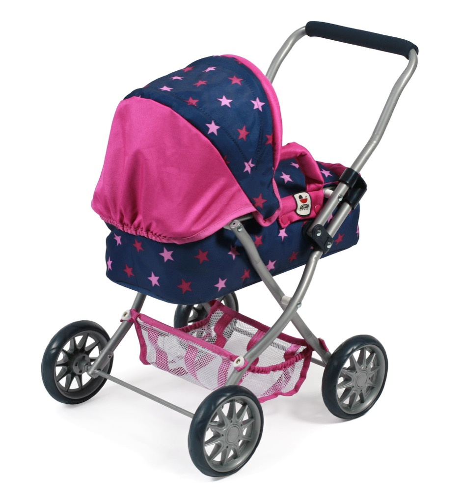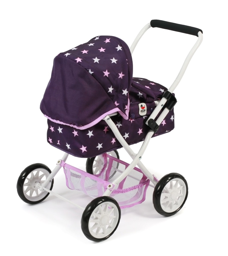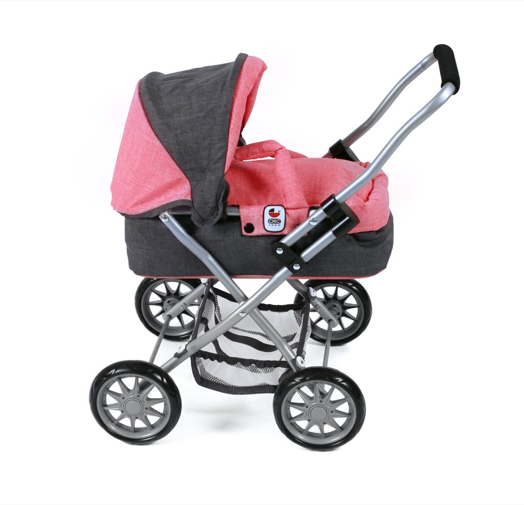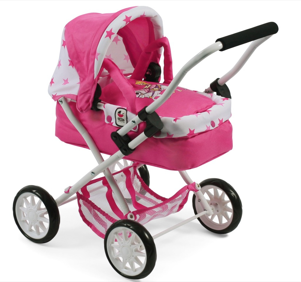 Krásný malinký kočárek pro panenky s vyjímatelnou taškou.