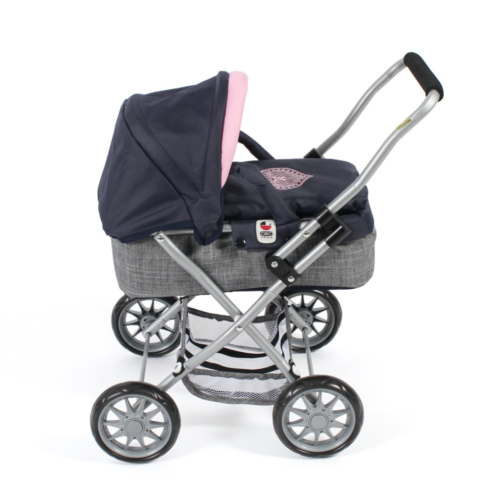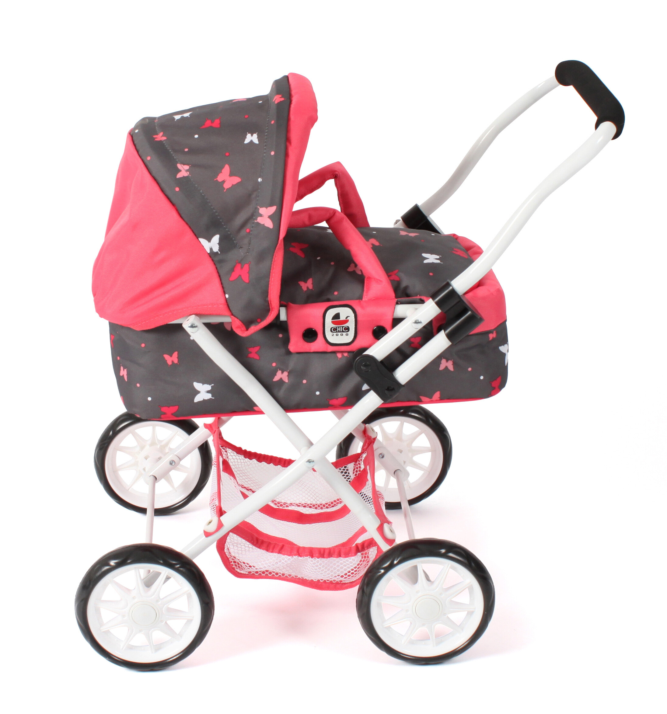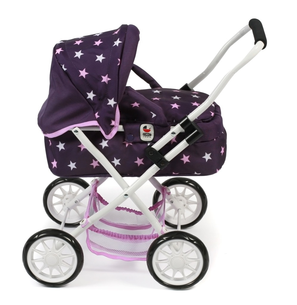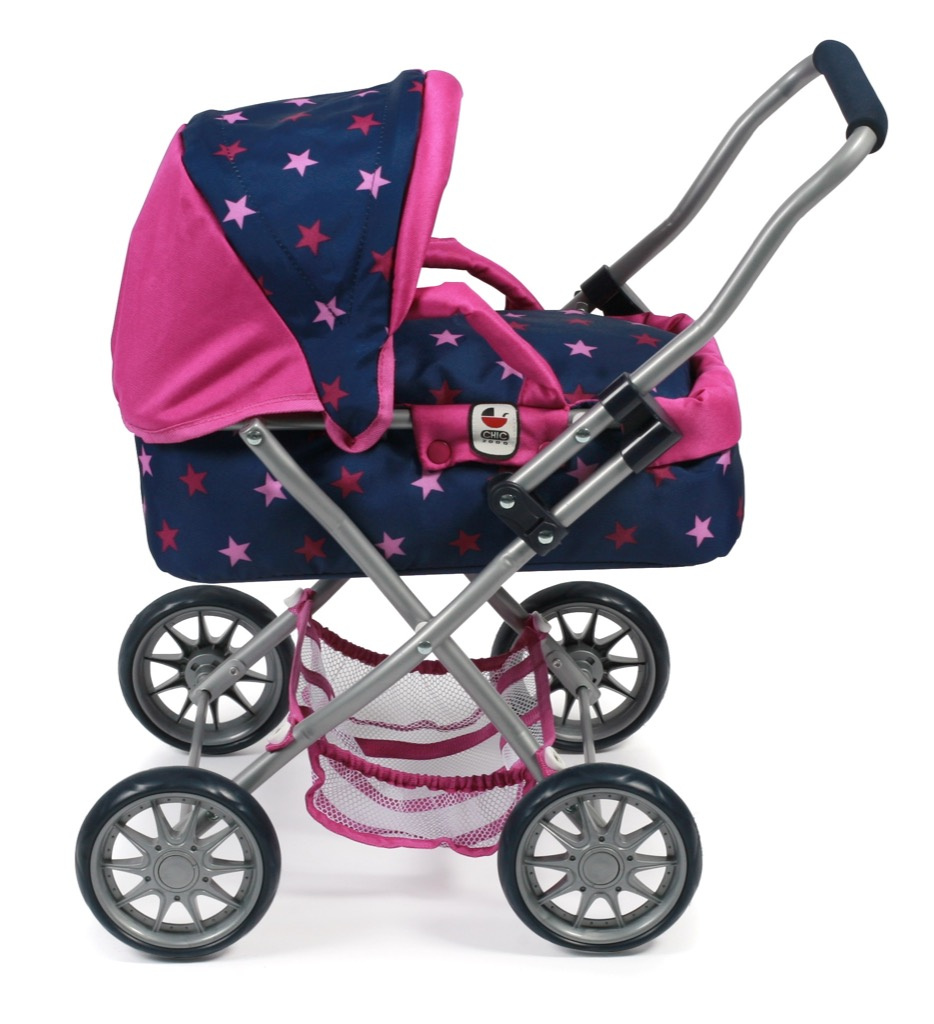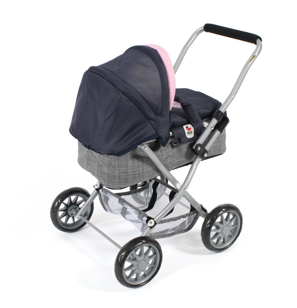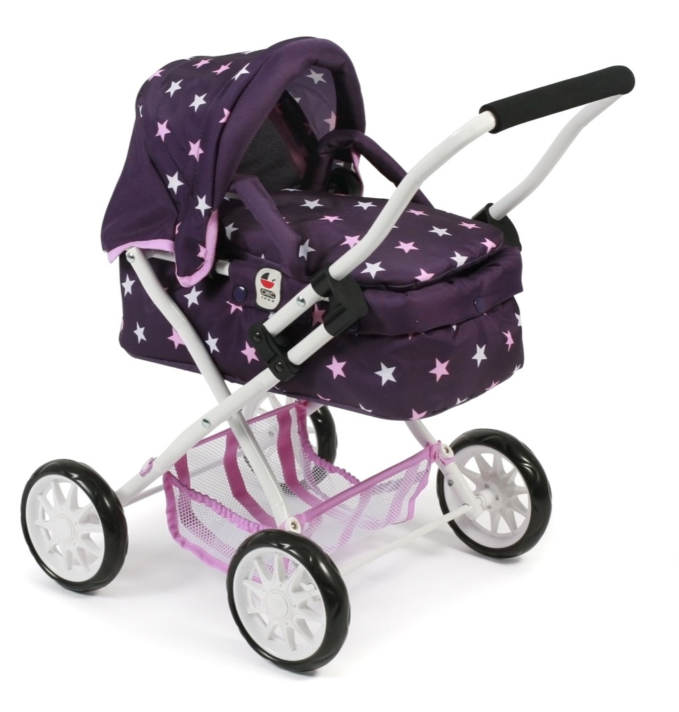 Krásný malinký kočárek pro panenky s vyjímatelnou taškou.