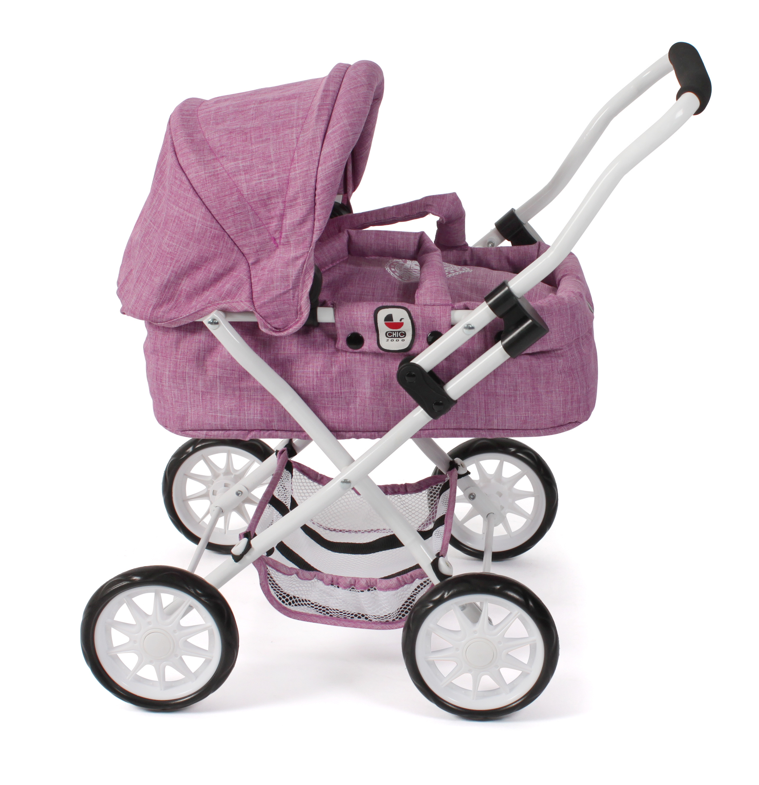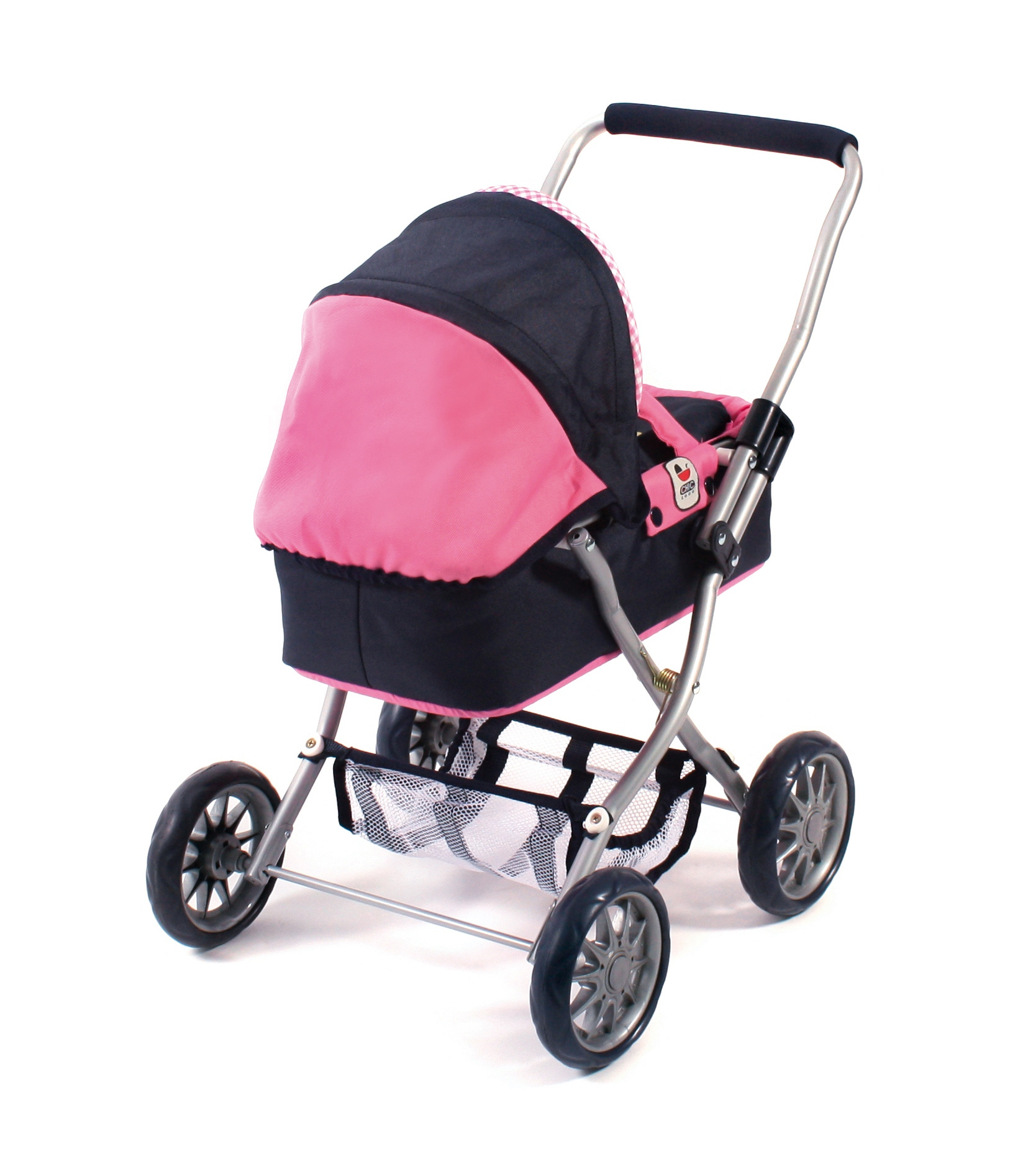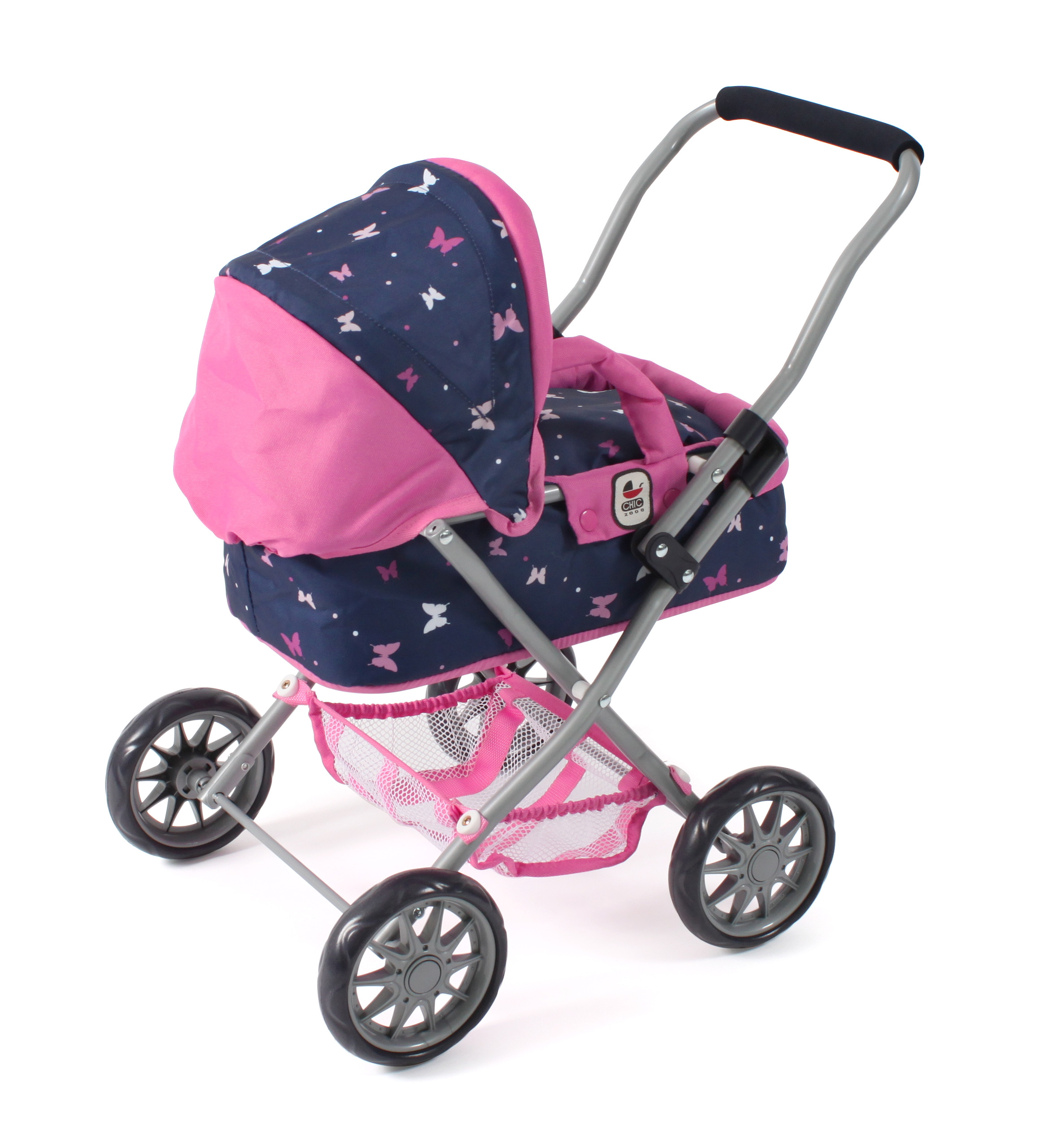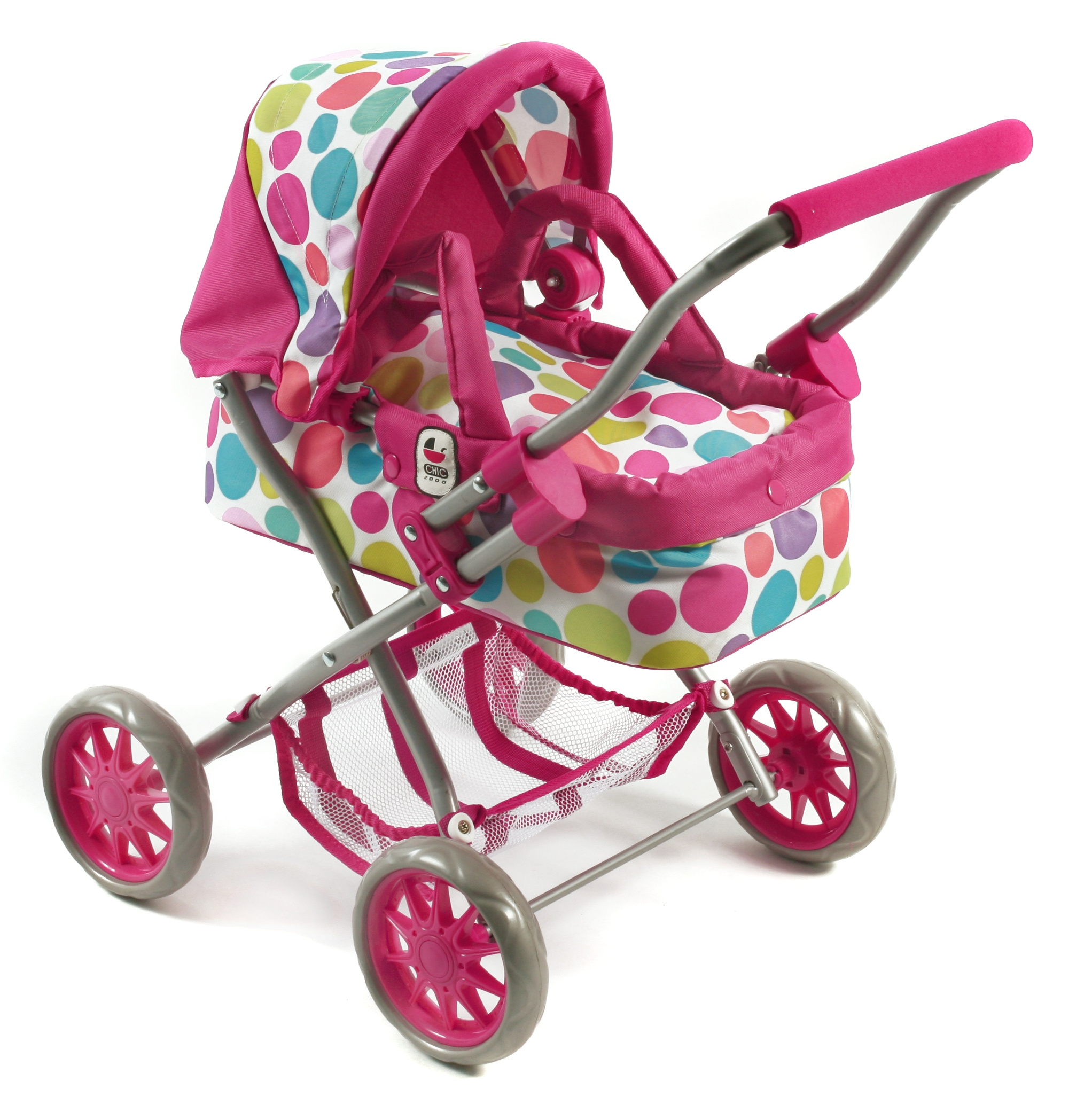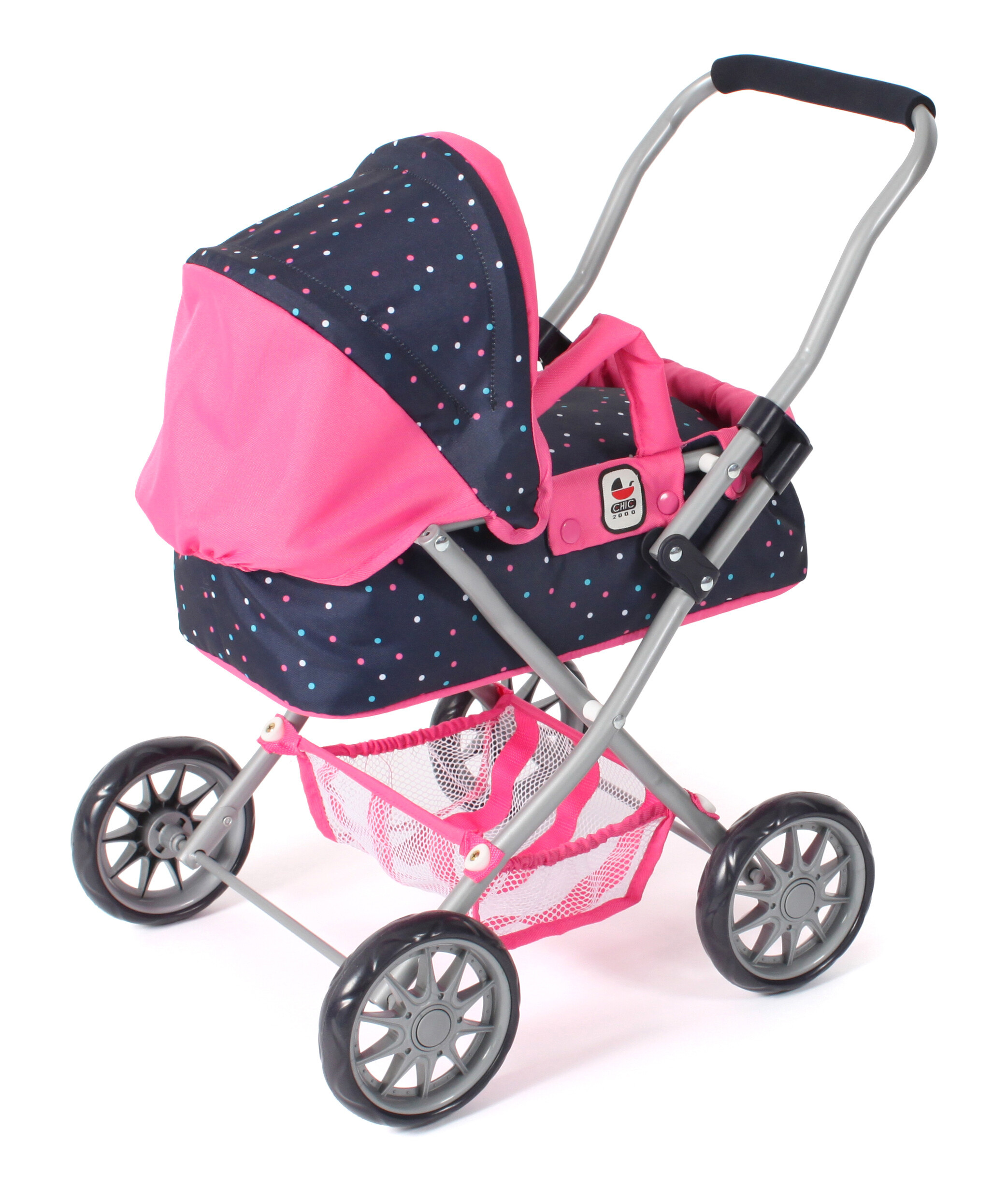 Krásný malinký kočárek pro panenky s vyjímatelnou taškou.