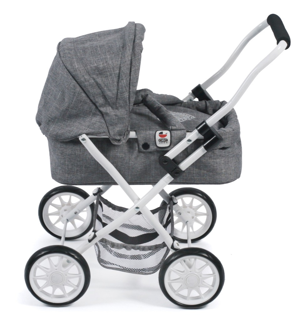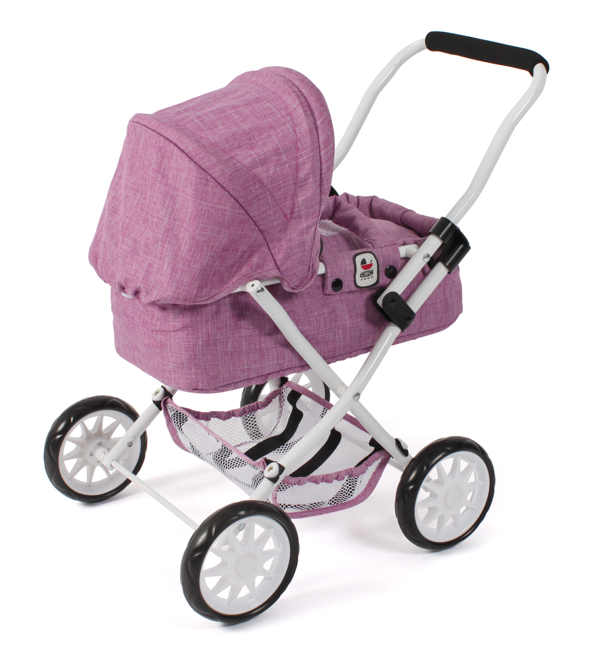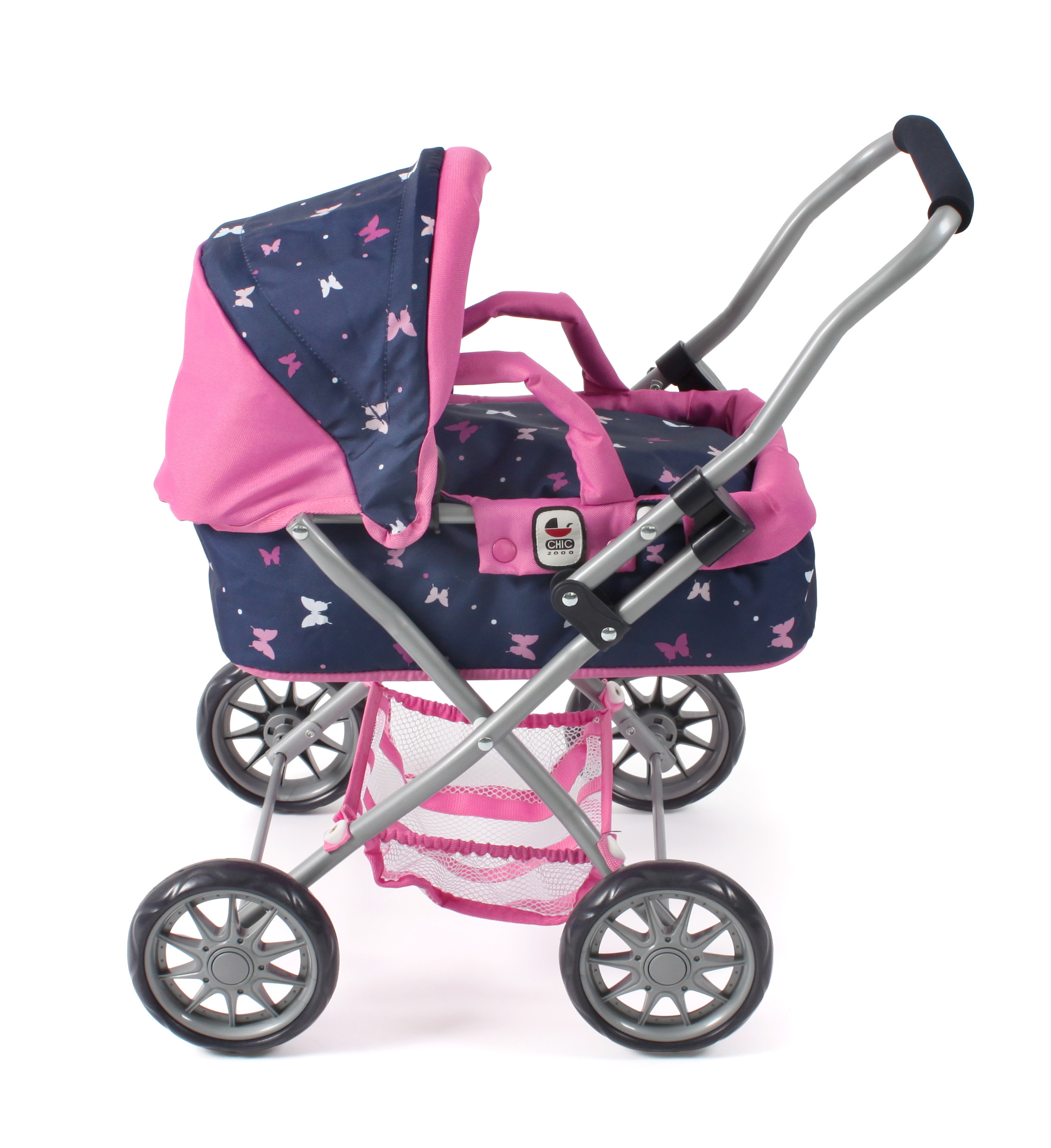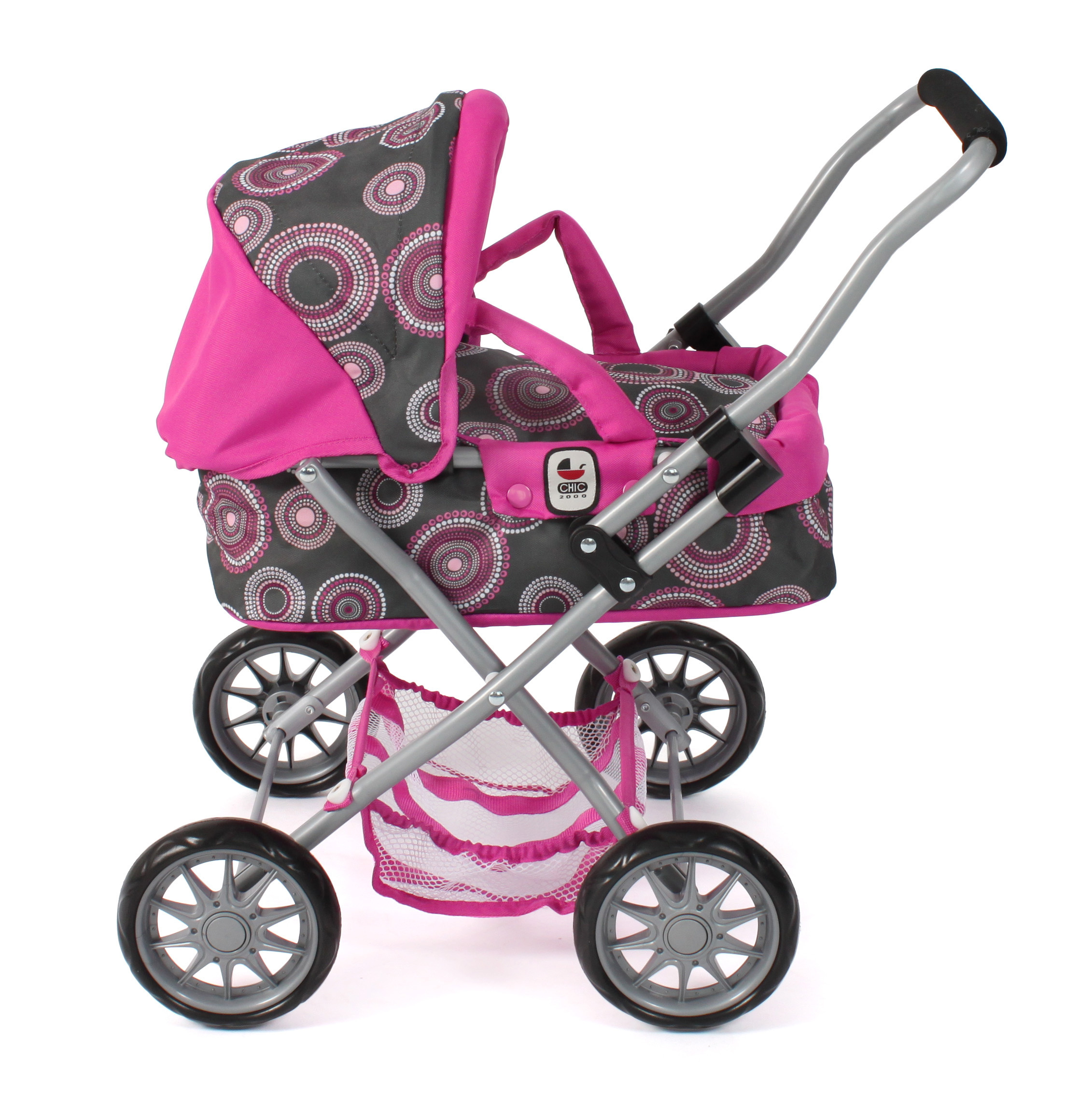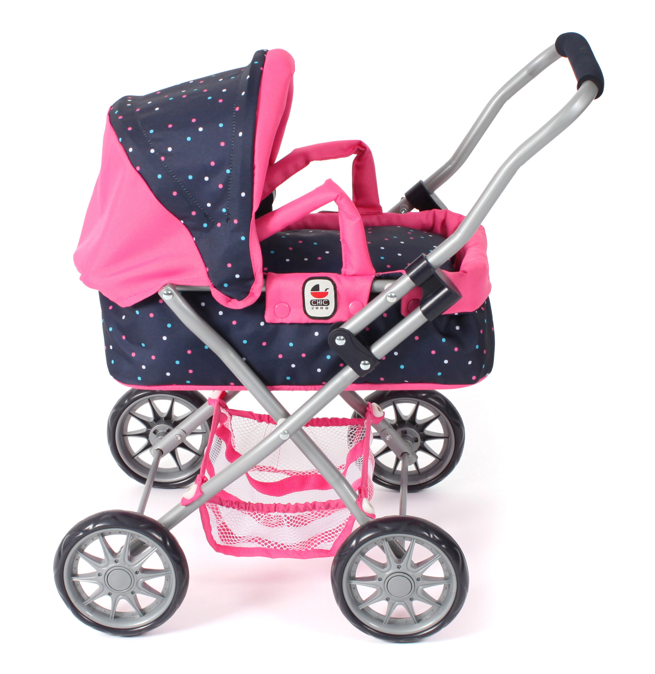 Krásný malinký kočárek pro panenky s vyjímatelnou taškou.